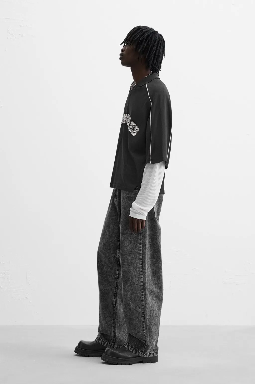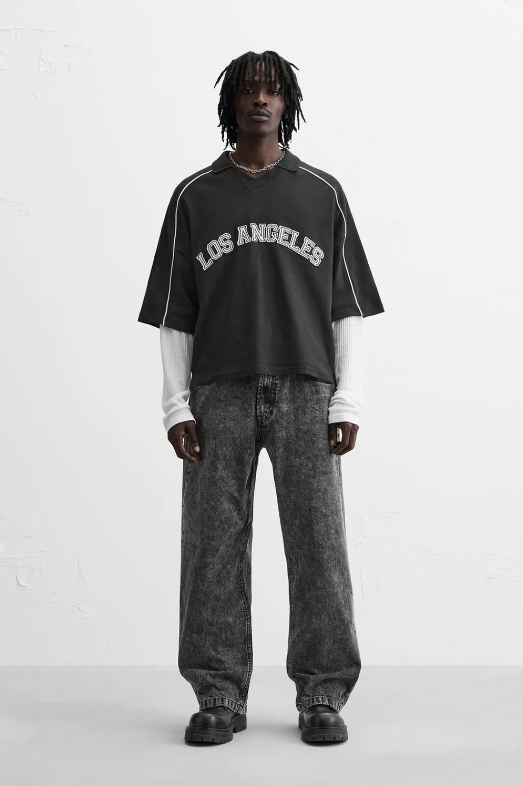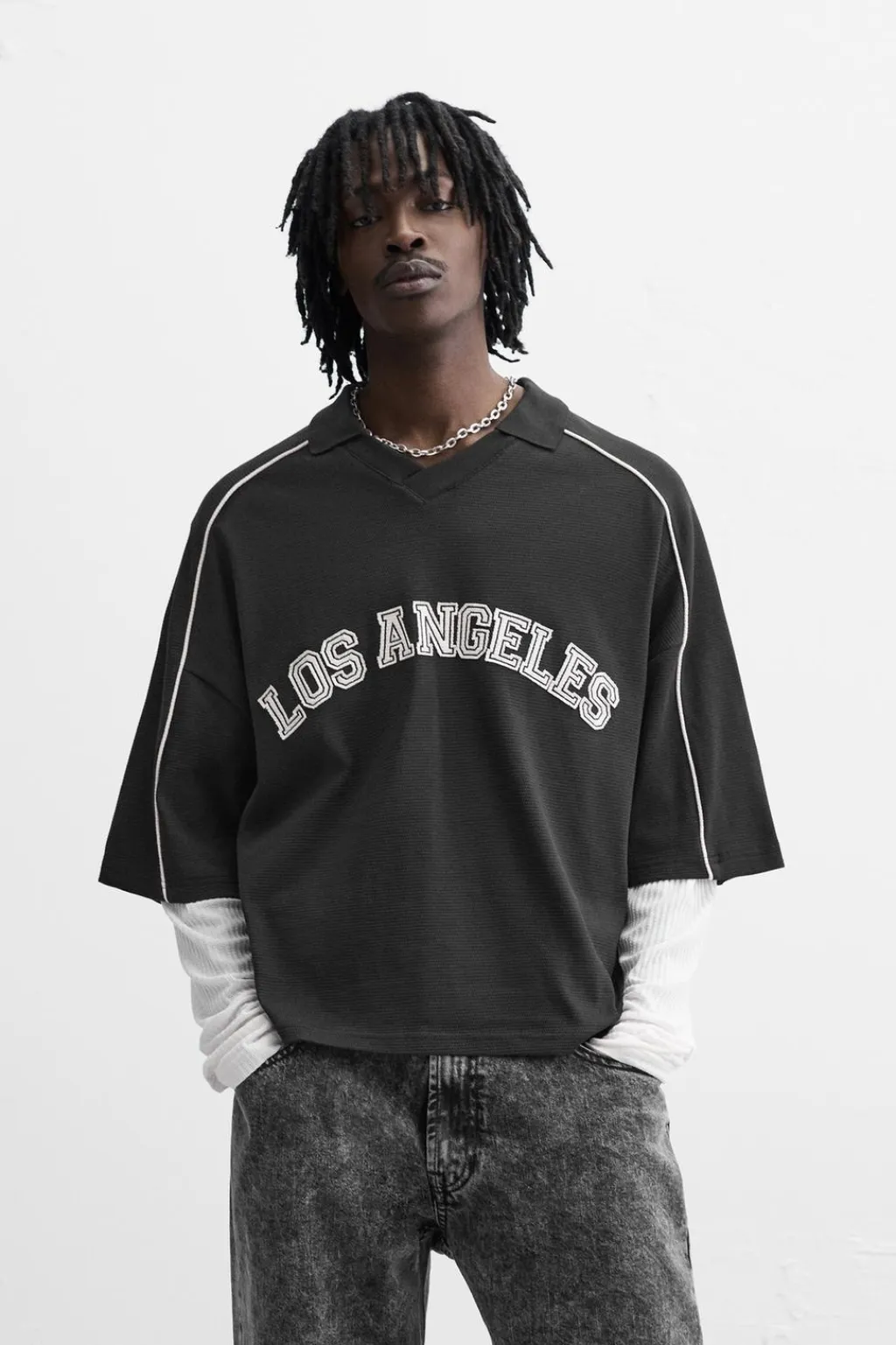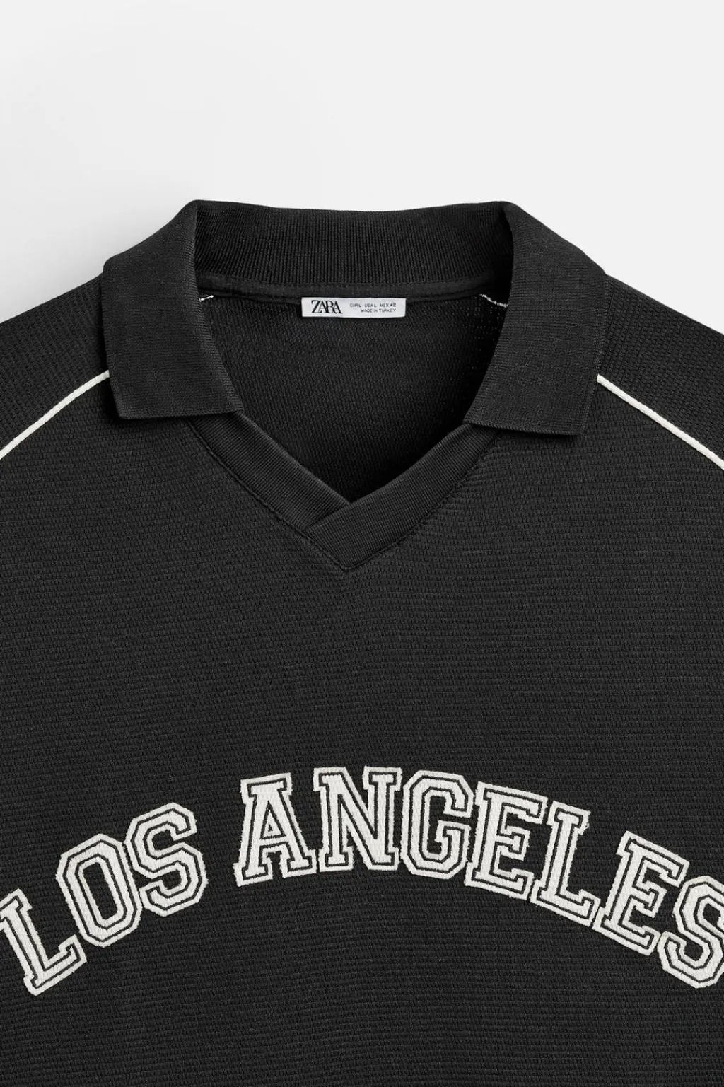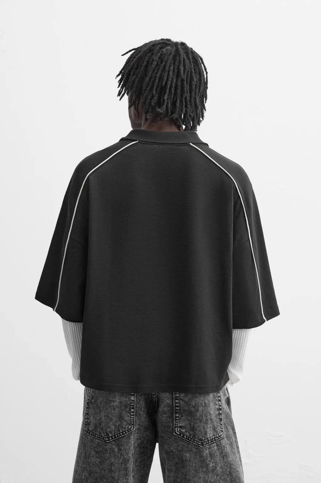 Sudadera boxy fit. Cuello solapa con abertura frontal. Manga corta con detalle de vivos combinados a contraste. Estampación de texto combinado a contraste en delantero. Bajo con aberturas laterales