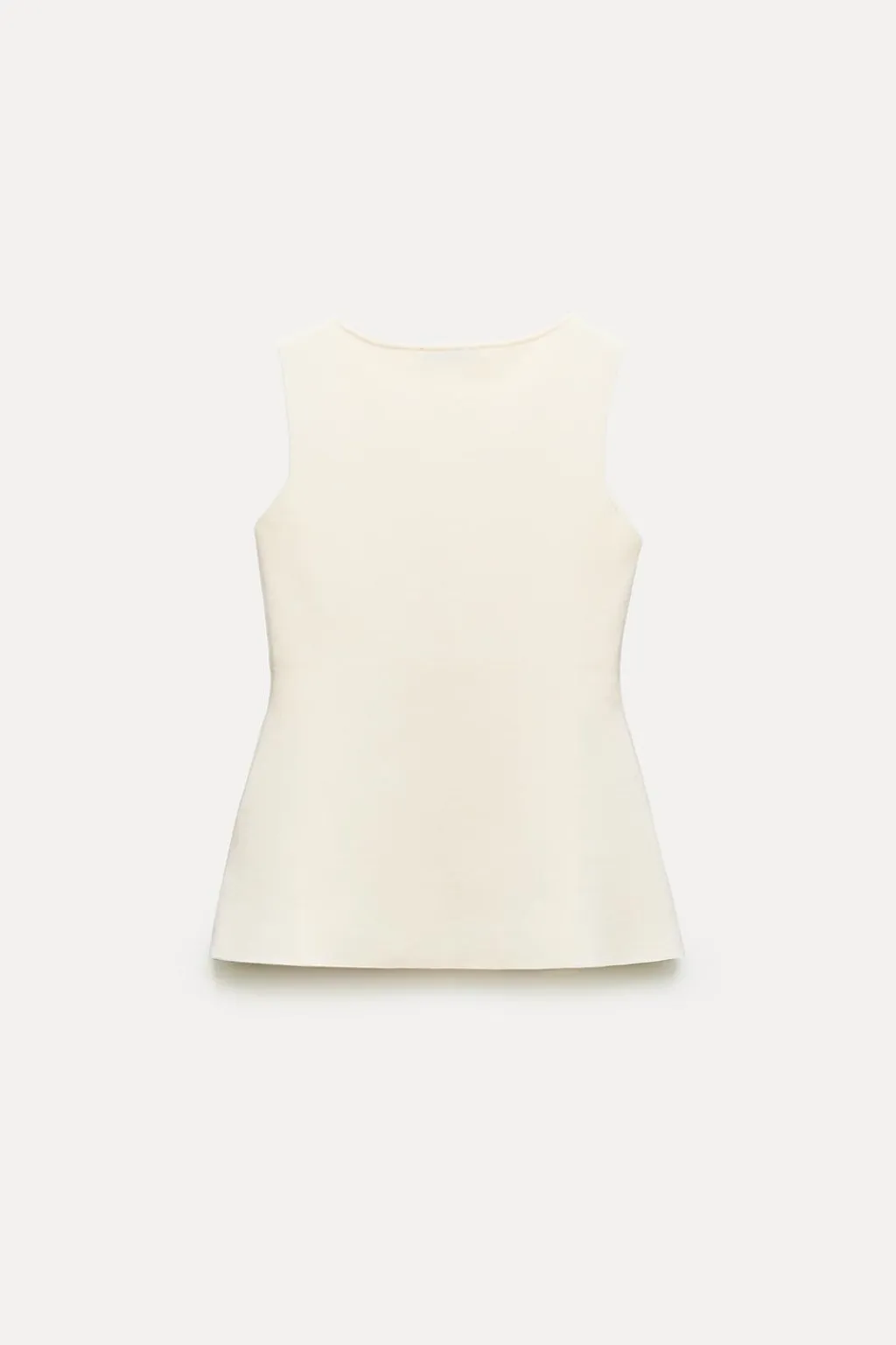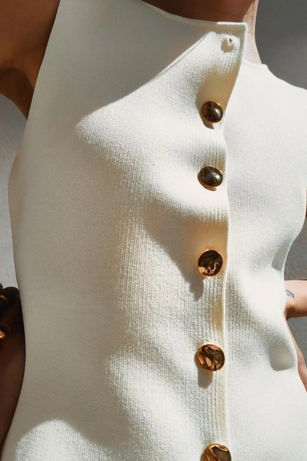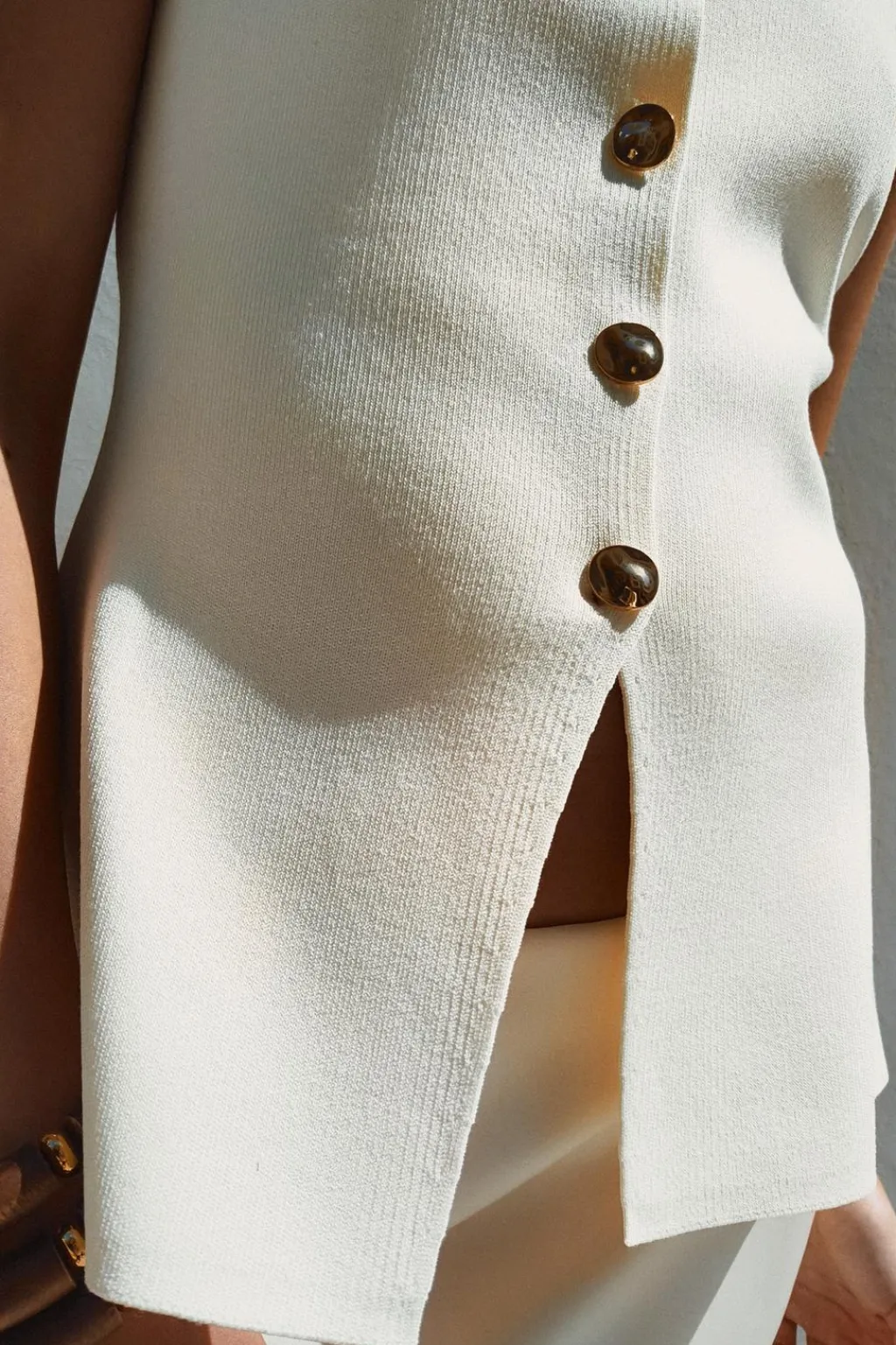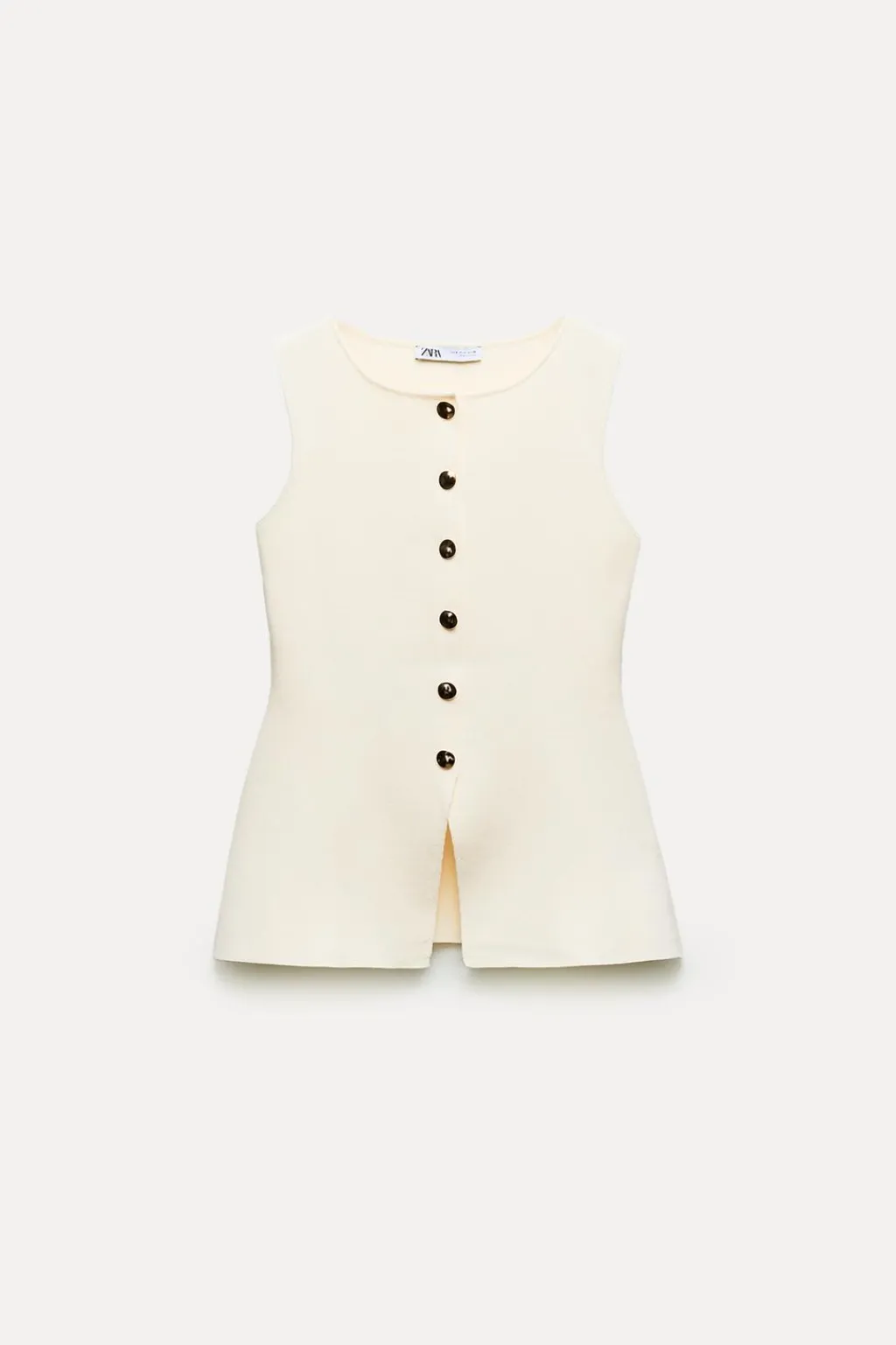 Top chaleco de punto liso con cuello redondo y manga sisa. Bajo con abertura frontal. Cierre delantero con botones dorados.