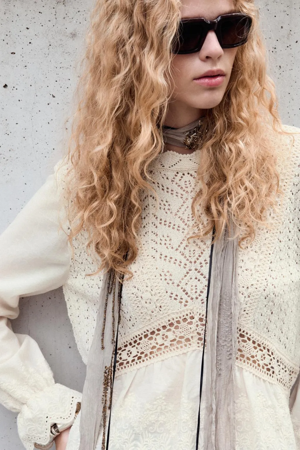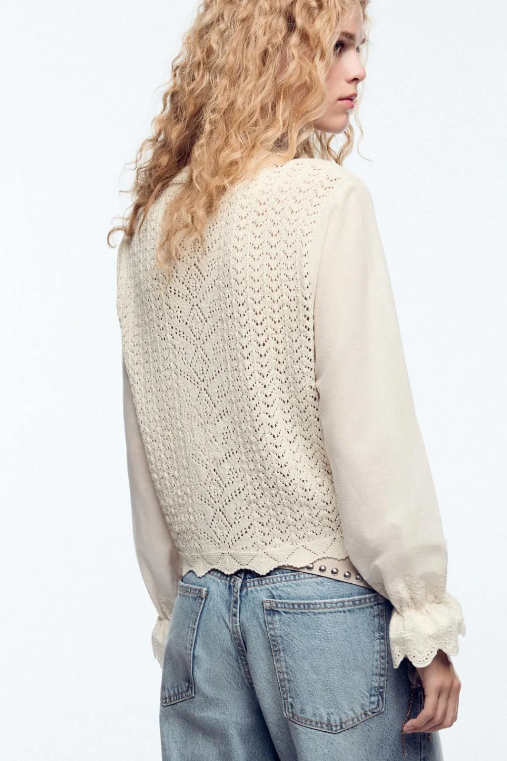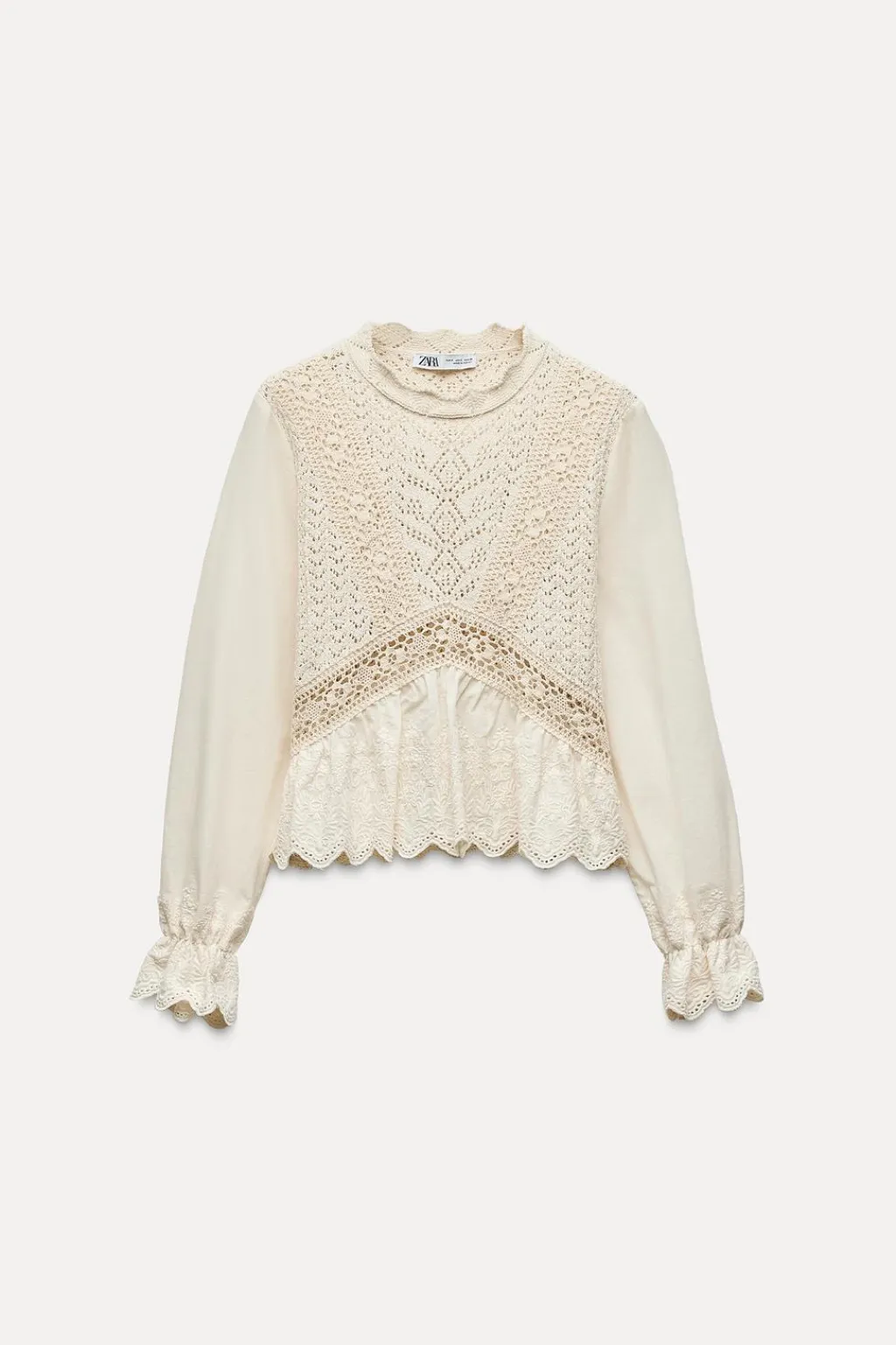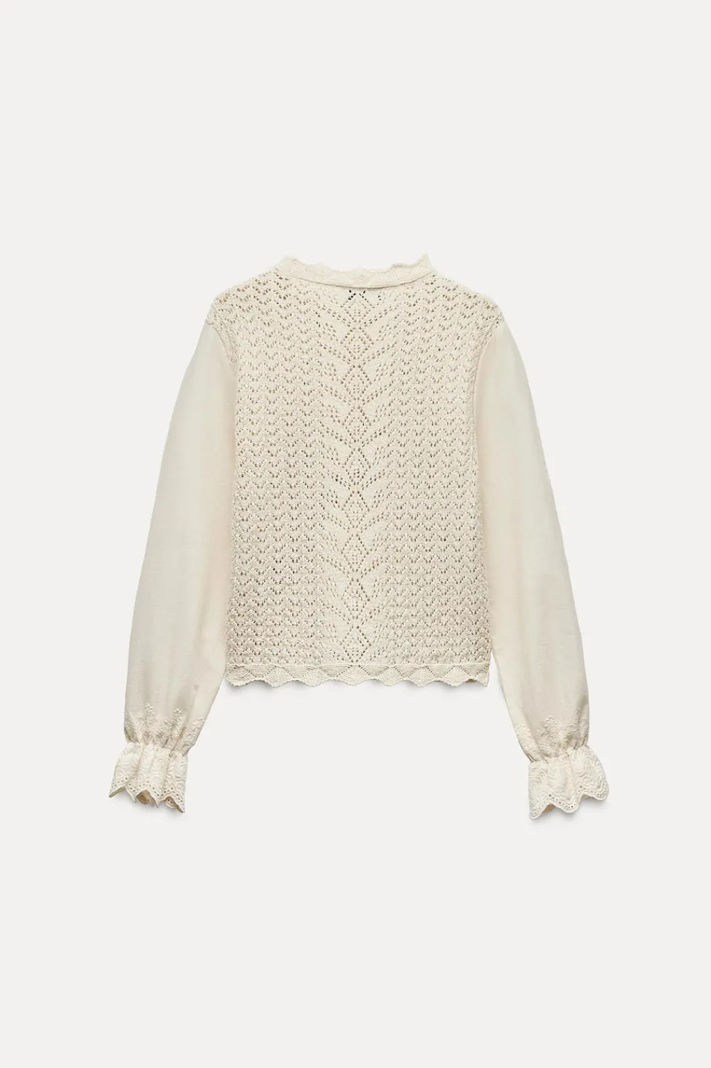 Top de cuello redondo. Manga larga y bajo con tejido combinado con bordados.