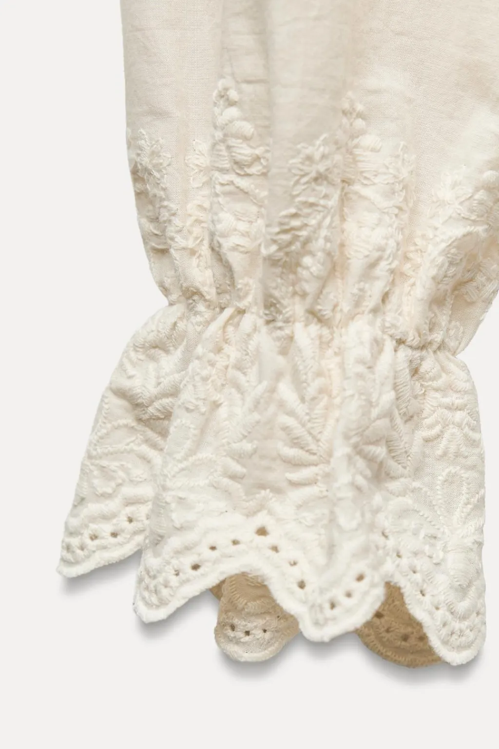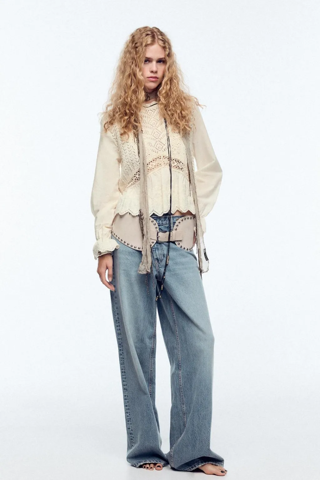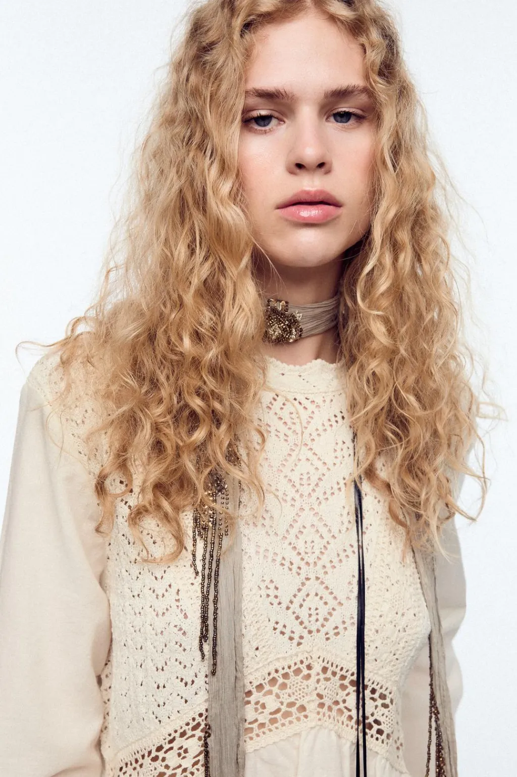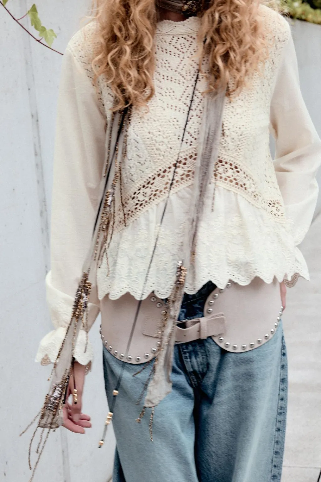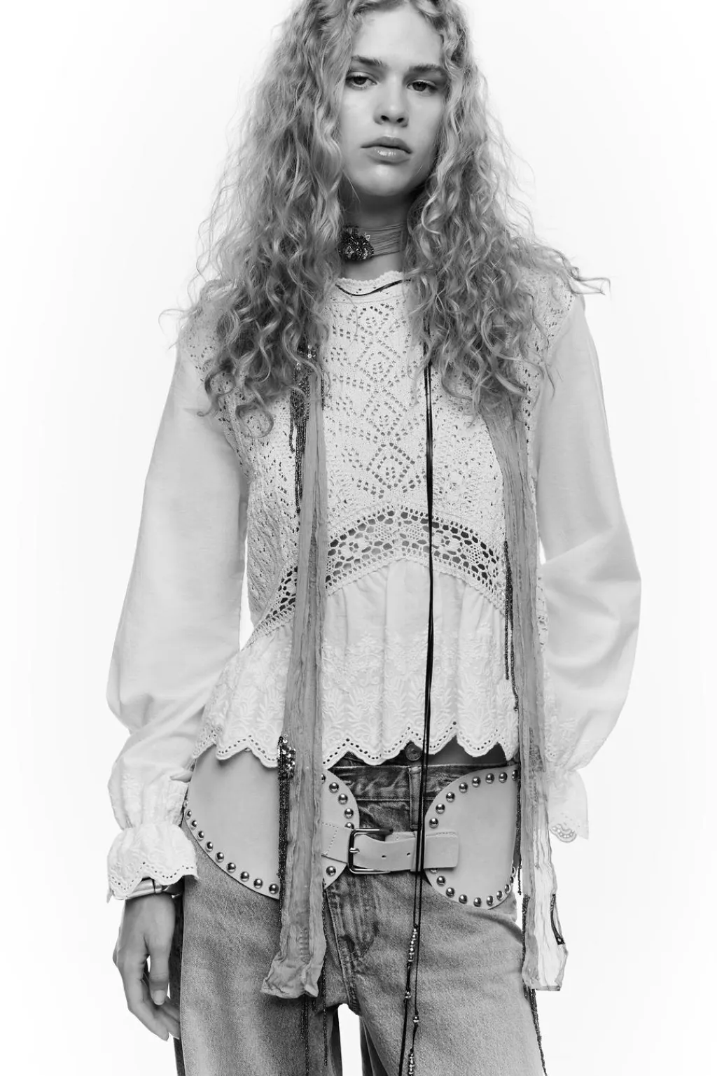 Top de cuello redondo. Manga larga y bajo con tejido combinado con bordados.