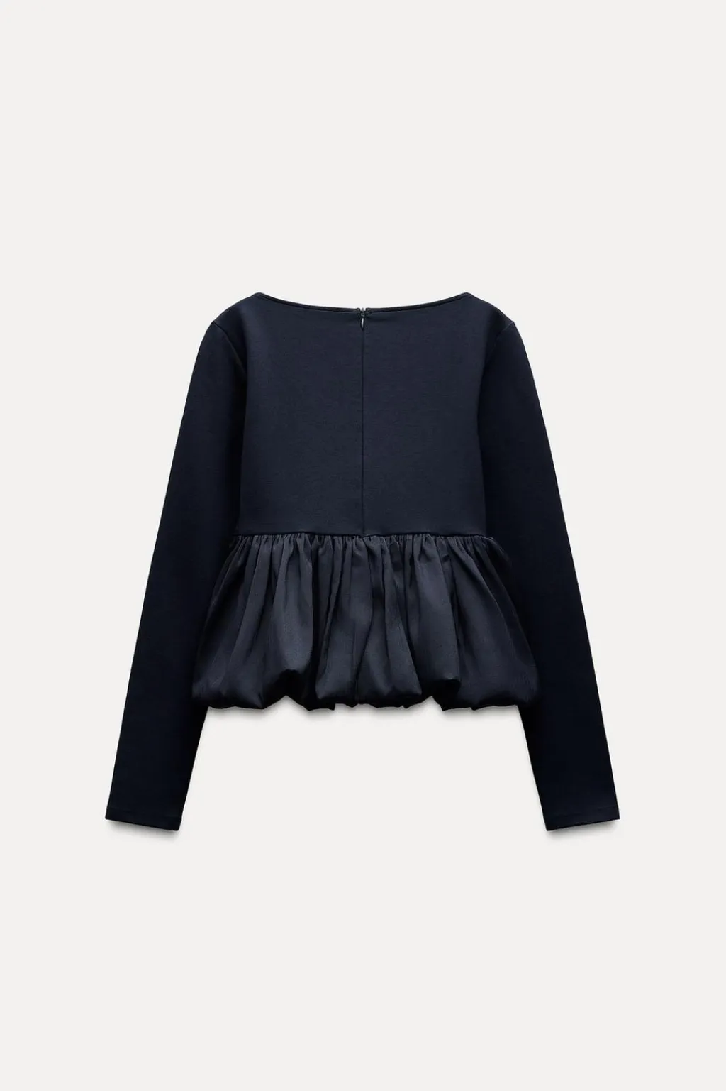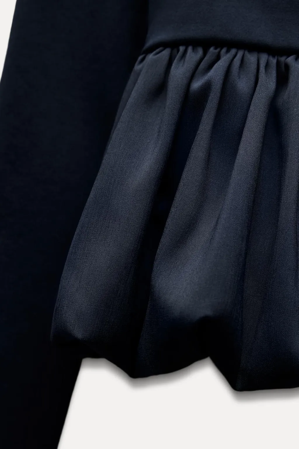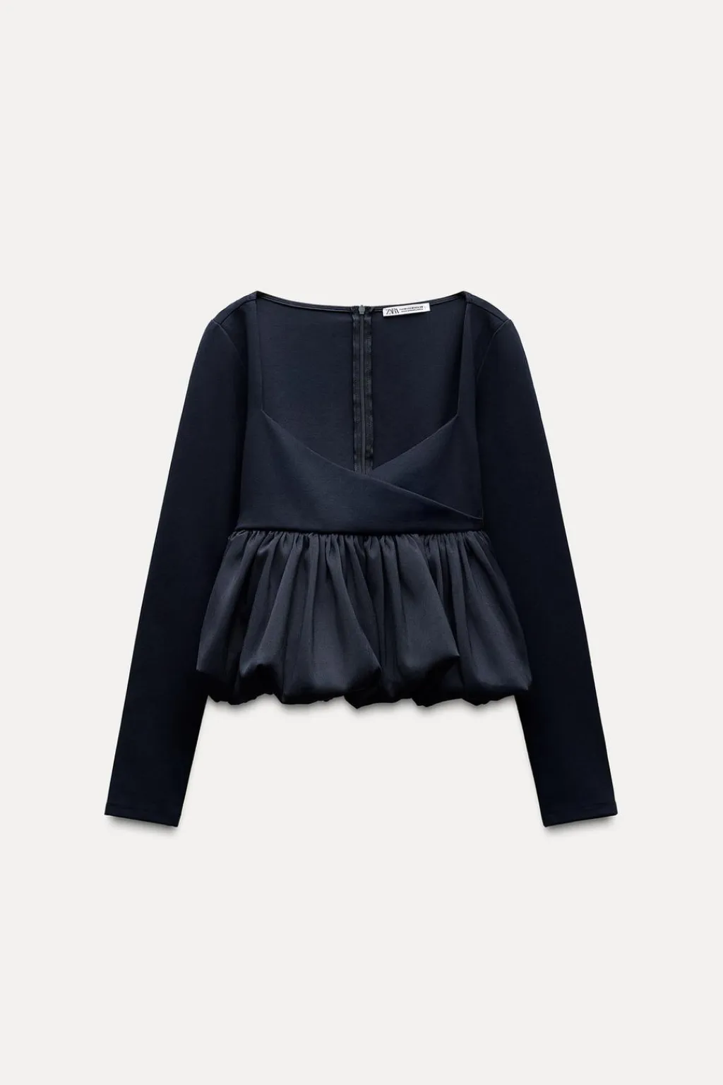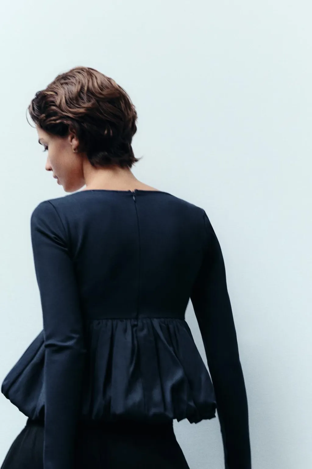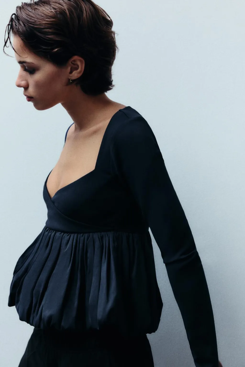 Top confeccionado en hilatura con mezcla de viscosa. Escote redondo cruzado y manga larga. Bajo con pliegues acabado en volumen. Cierre en espalda con cremallera oculta en costura.