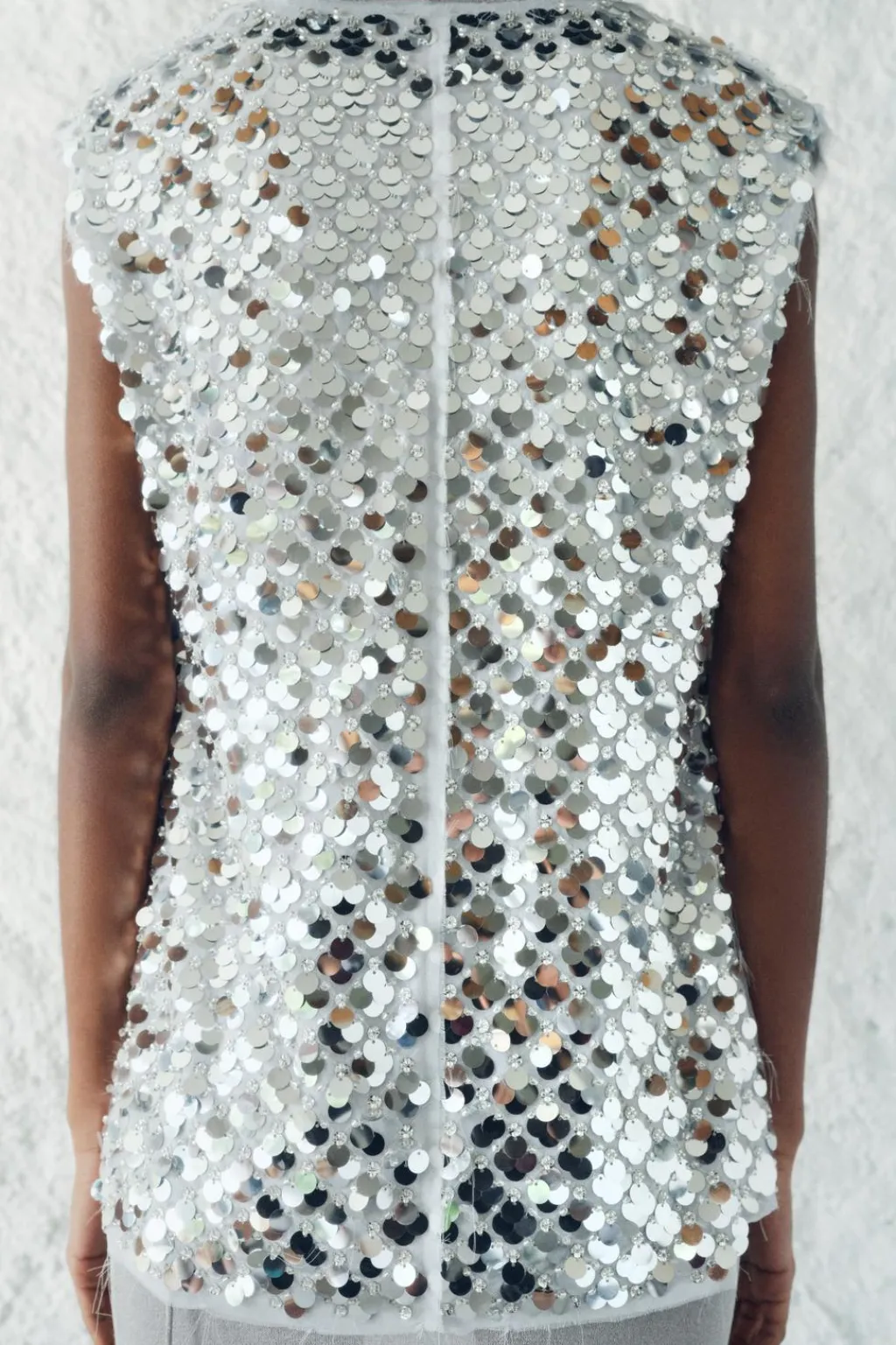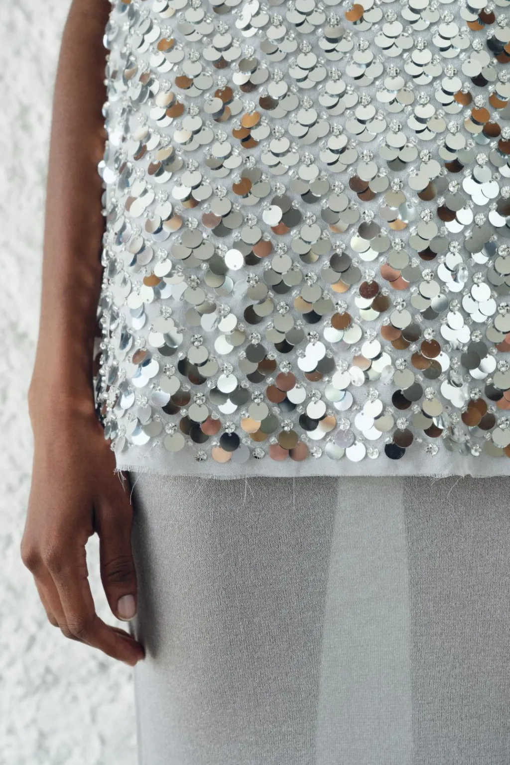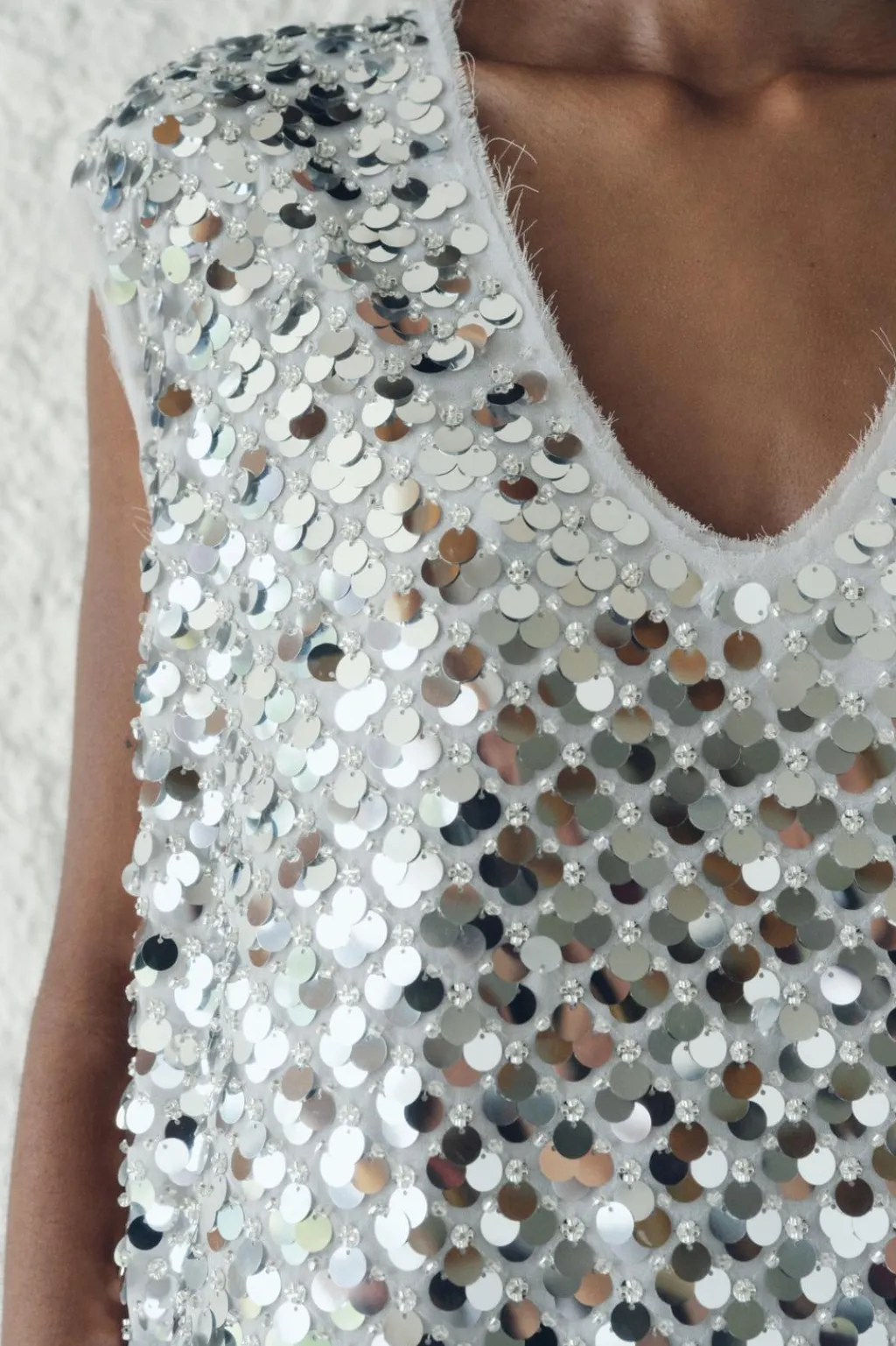 Top de escote redondo y manga sisa. Detalle de aplicación de lentejuelas a tono.