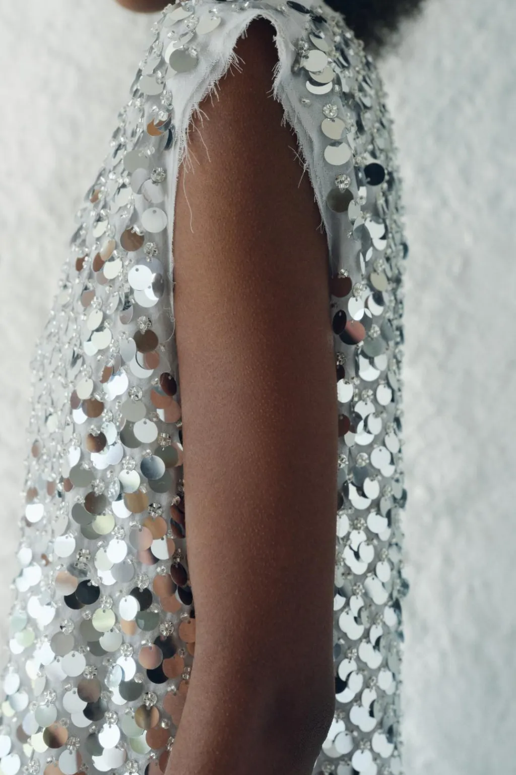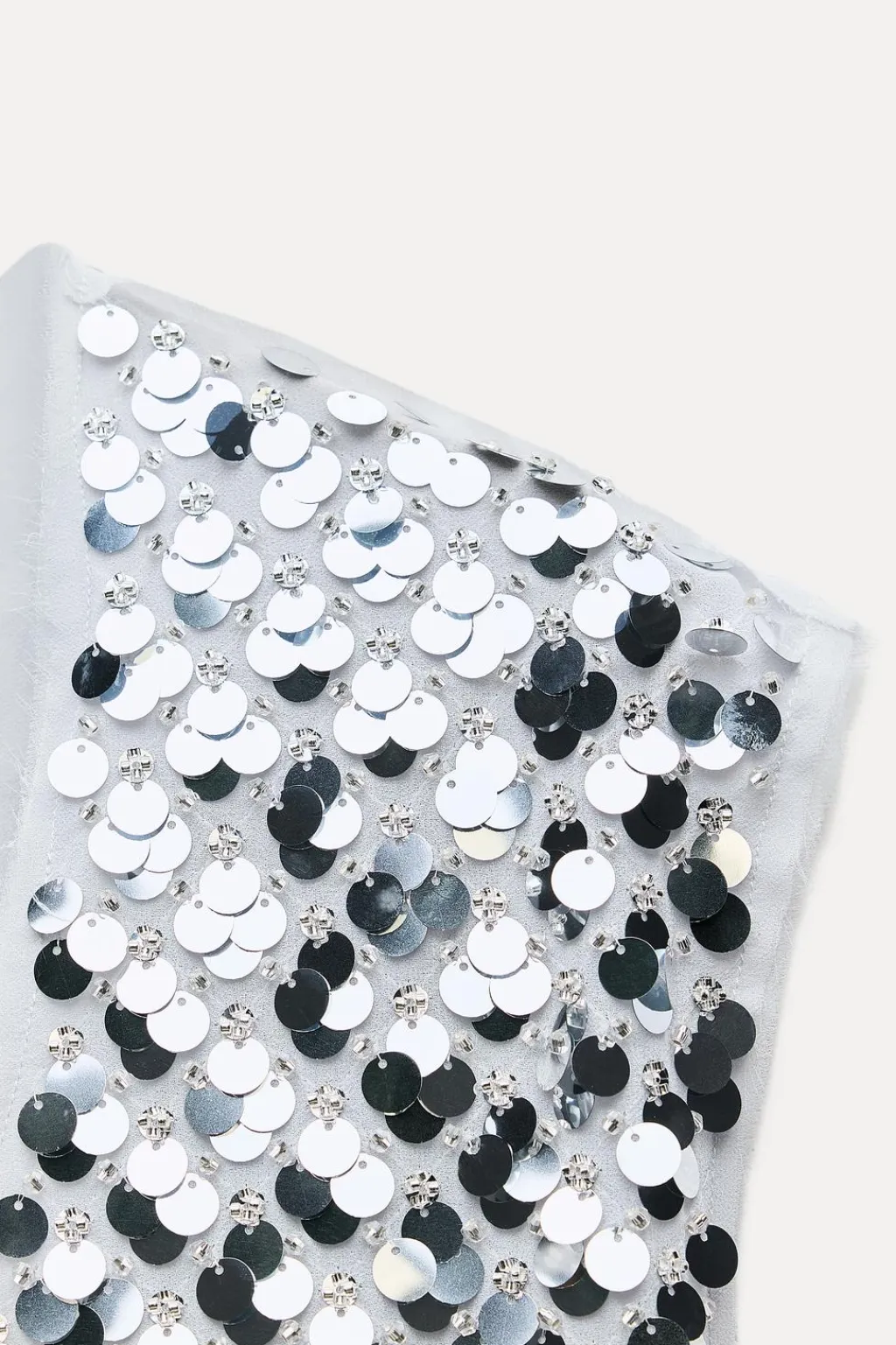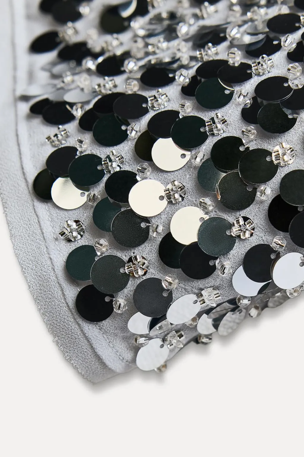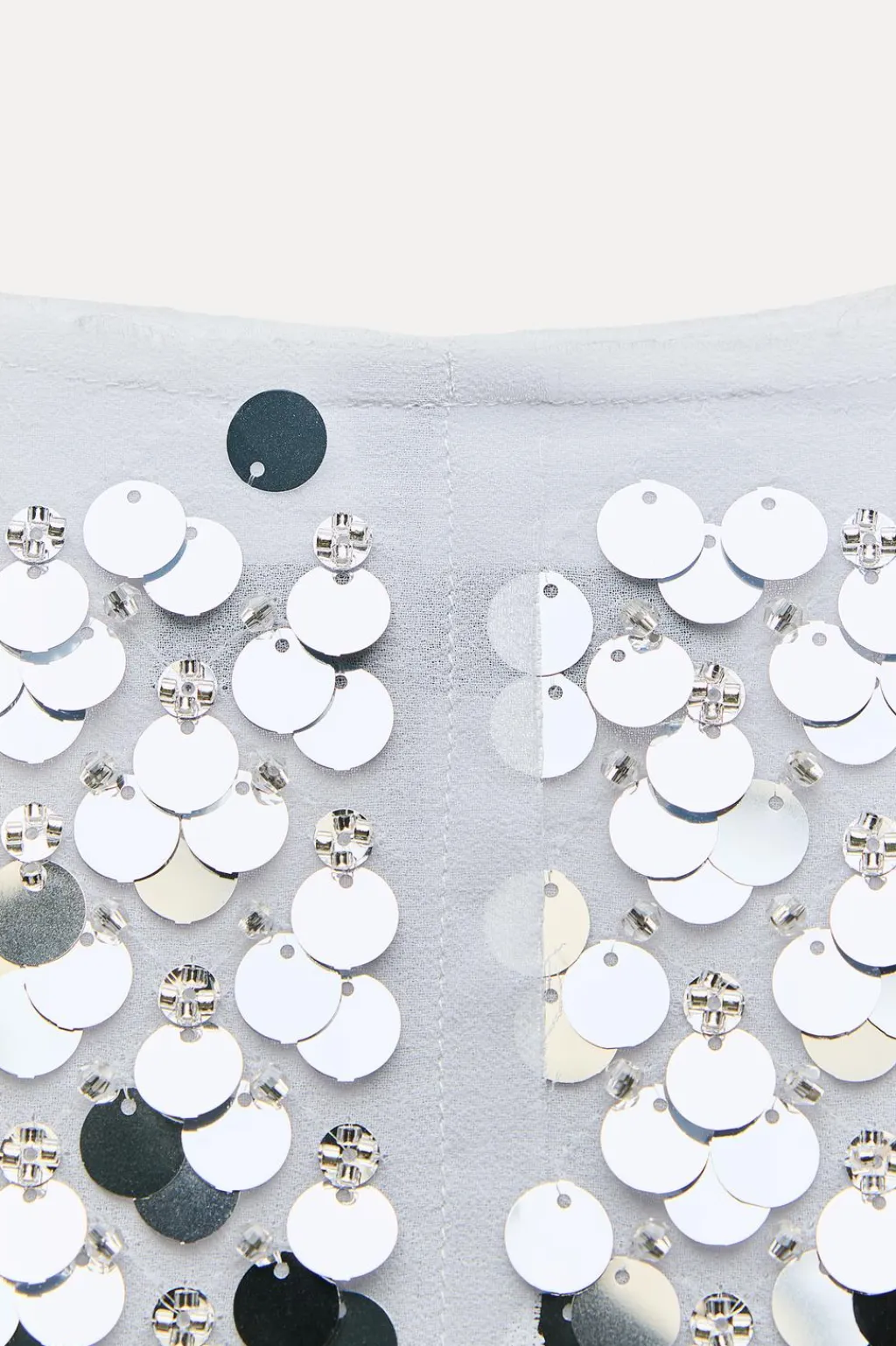 Top de escote redondo y manga sisa. Detalle de aplicación de lentejuelas a tono.