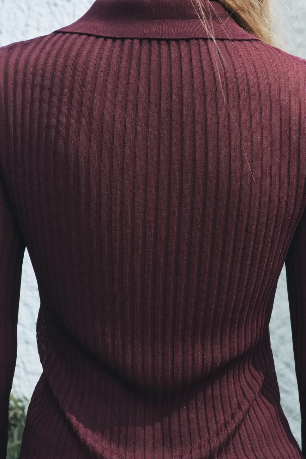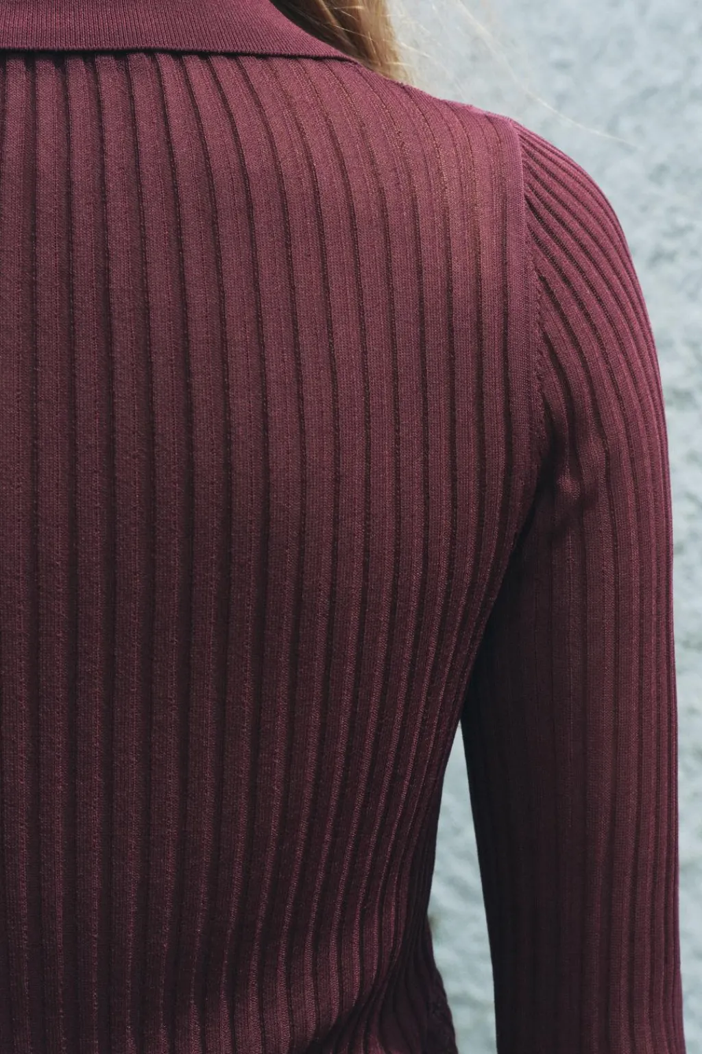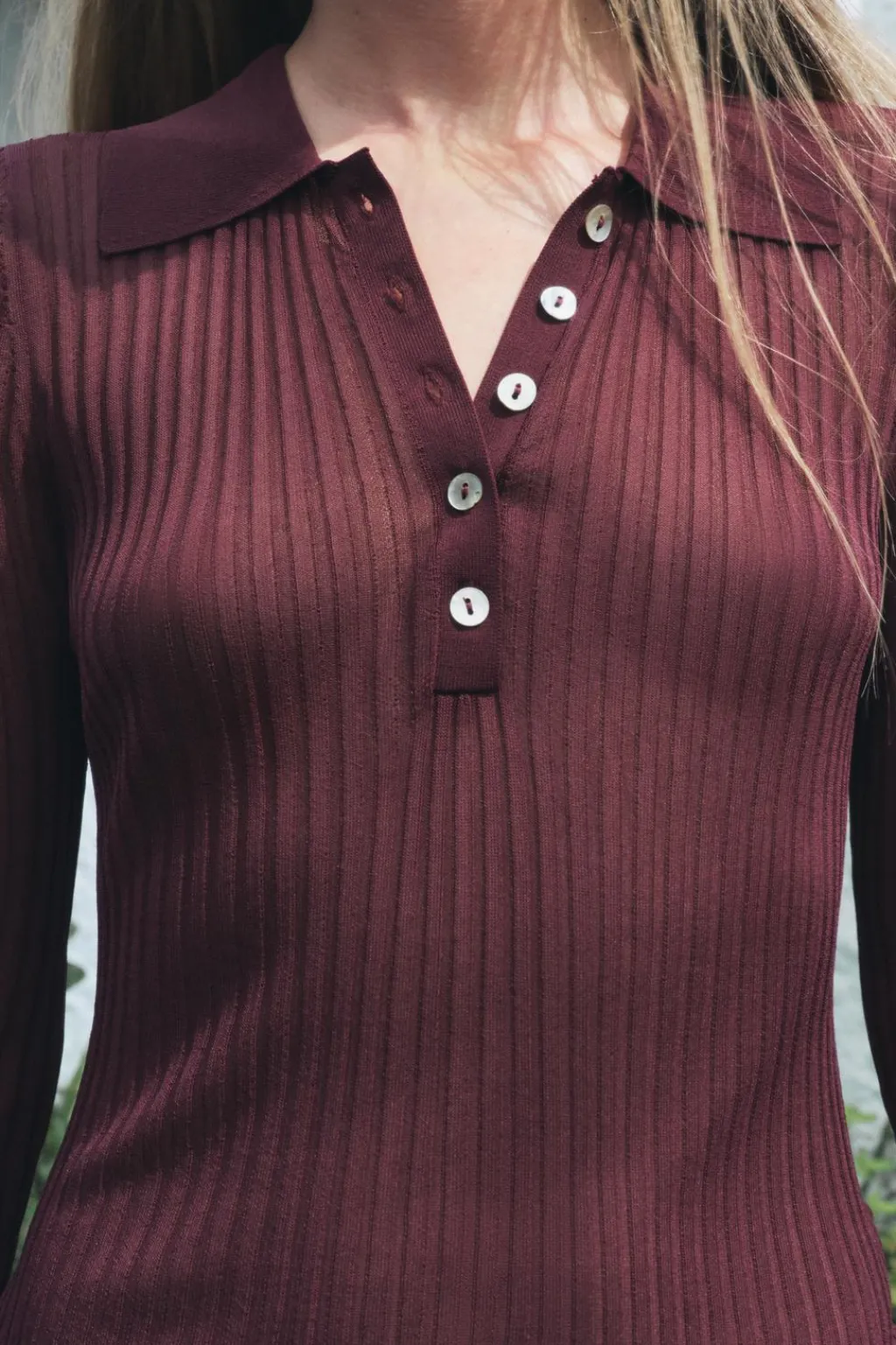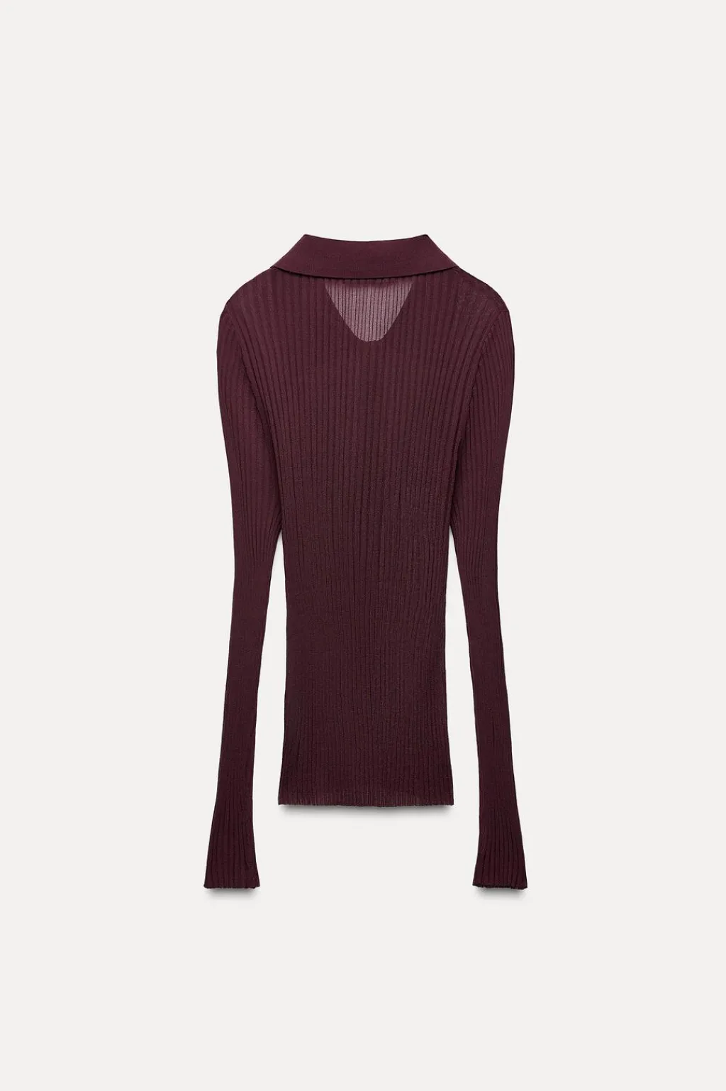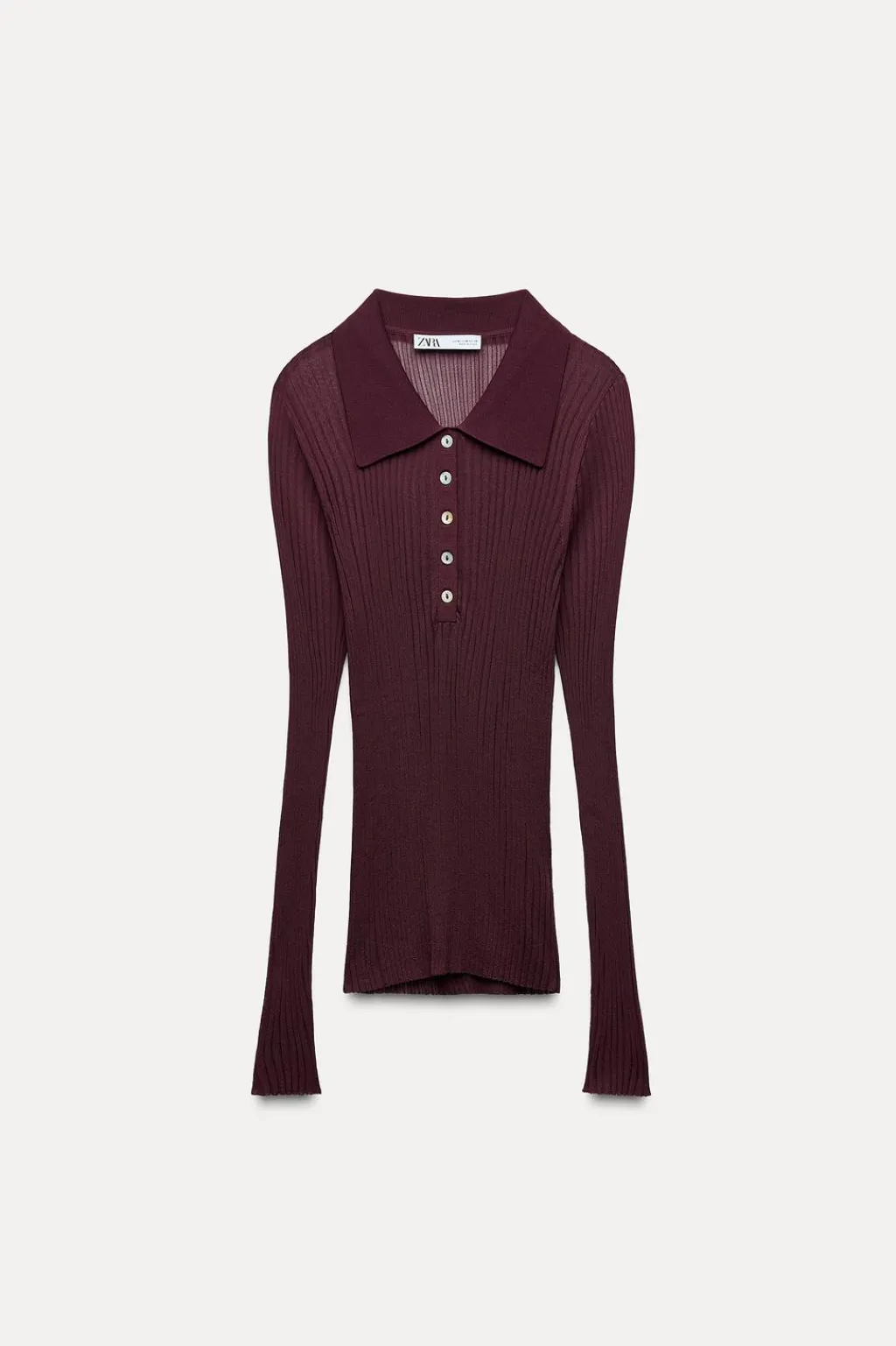 Top de punto fino con cuello polo y manga larga. Botones delanteros.