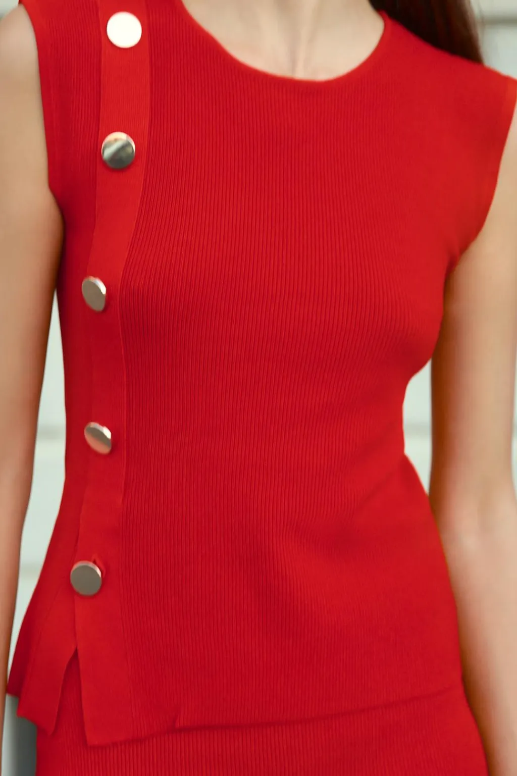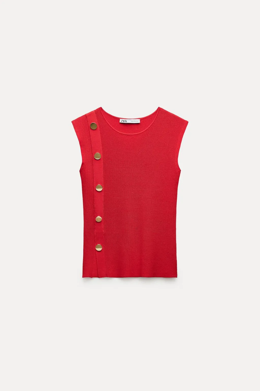 Top con cuello redondo y manga sisa. Detalle de botones dorados laterales.
