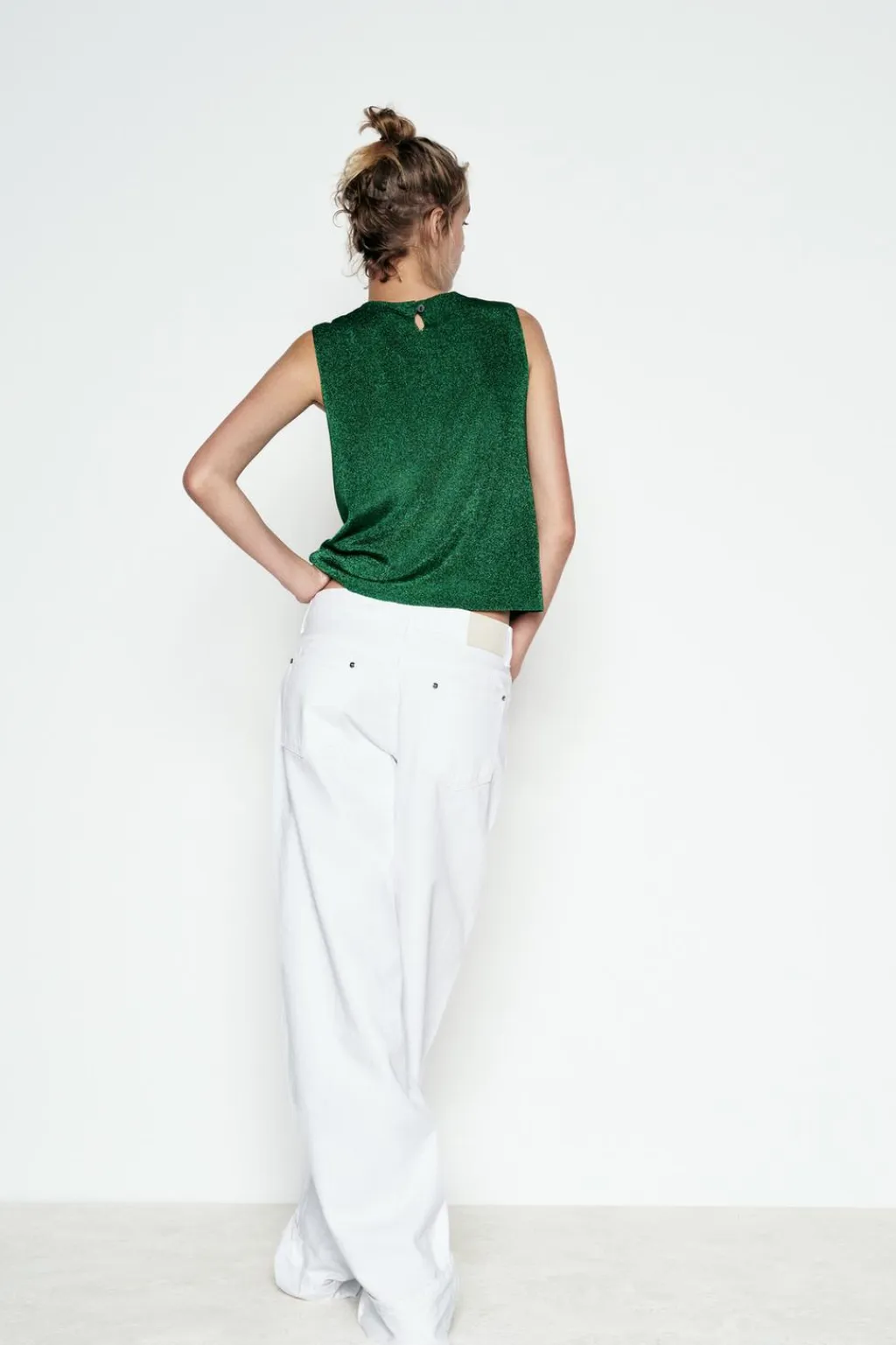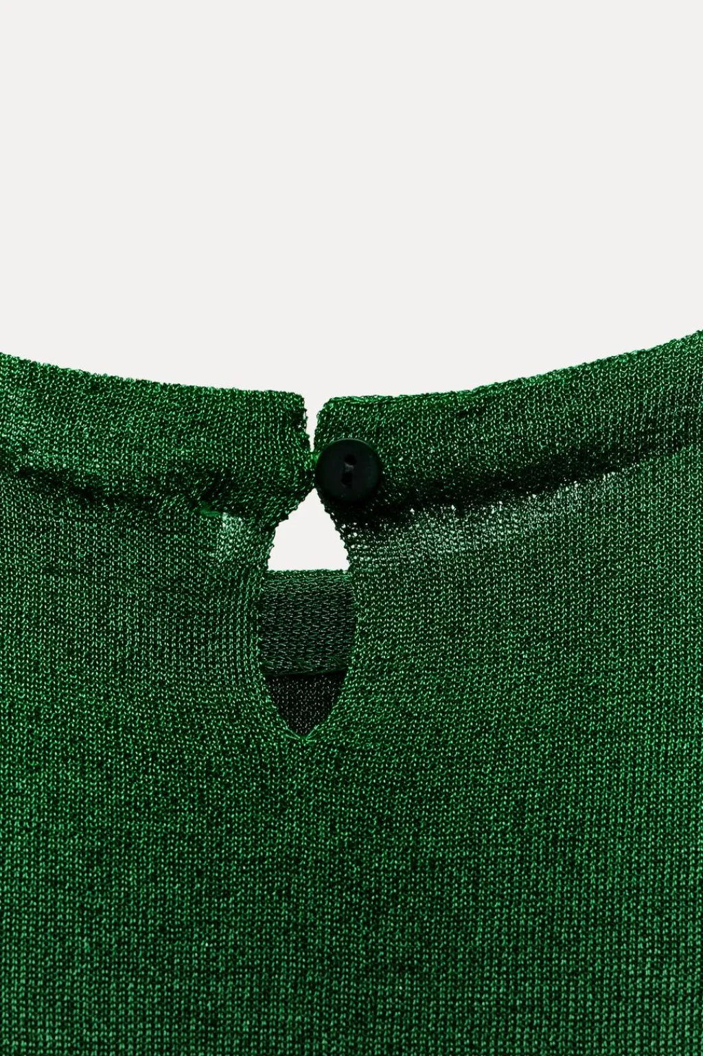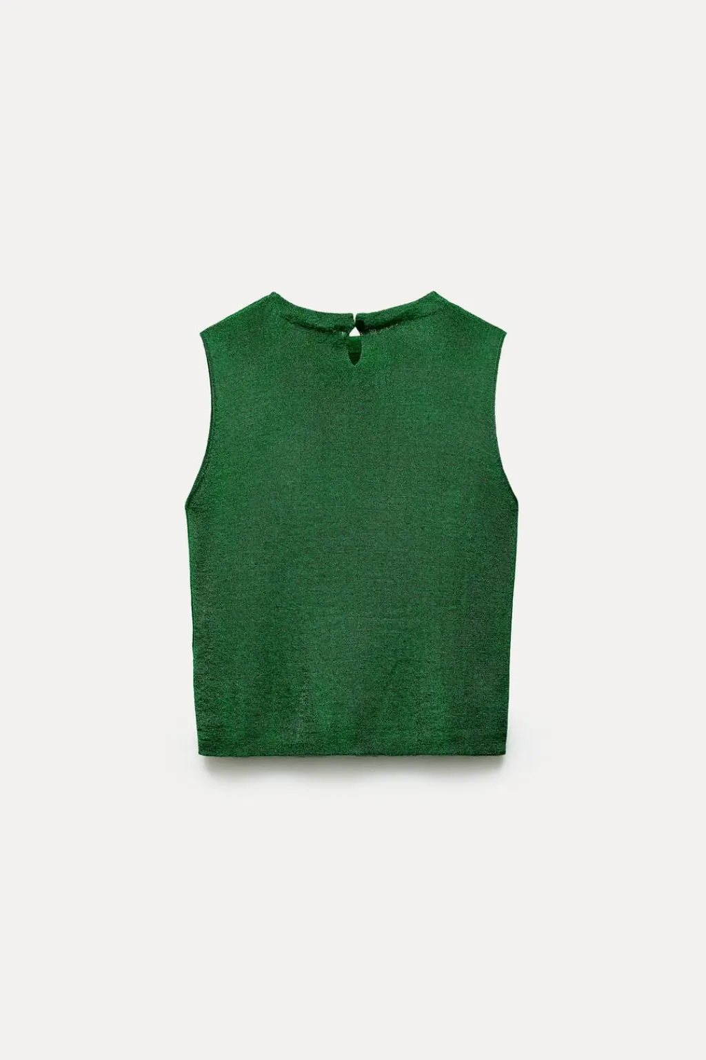 Top de cuello redondo y manga sisa. Detalle de tejido con hilo metalizado. Cierre en espalda con abertura y botón.