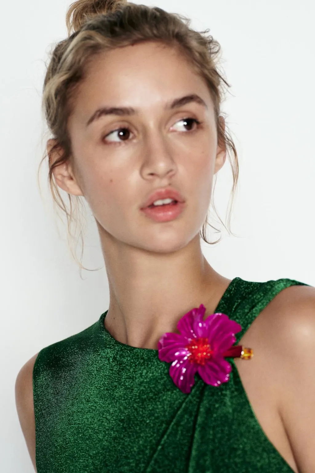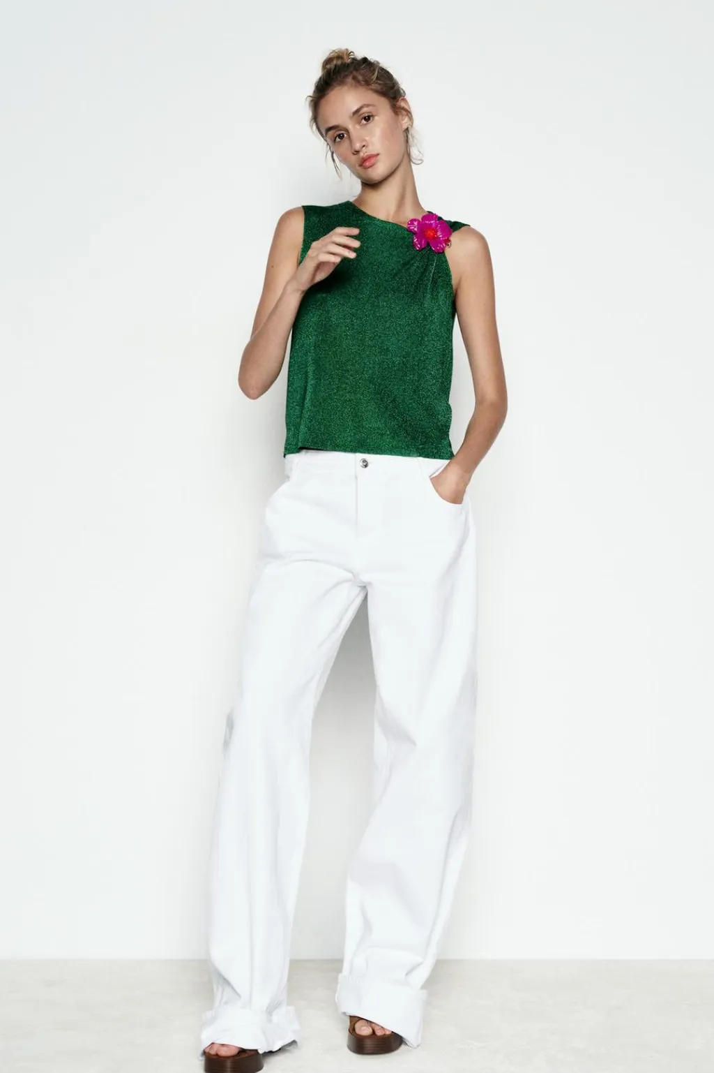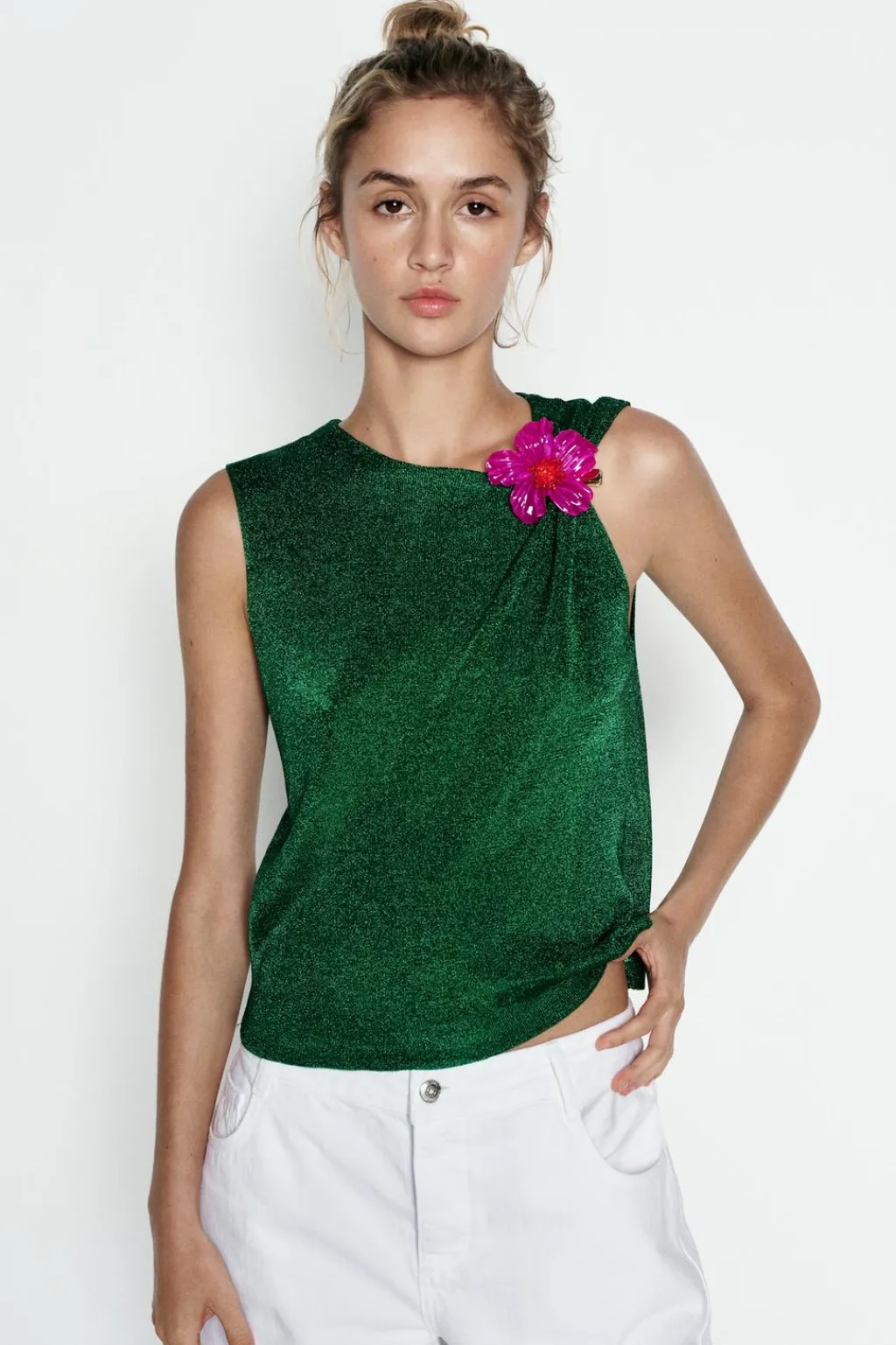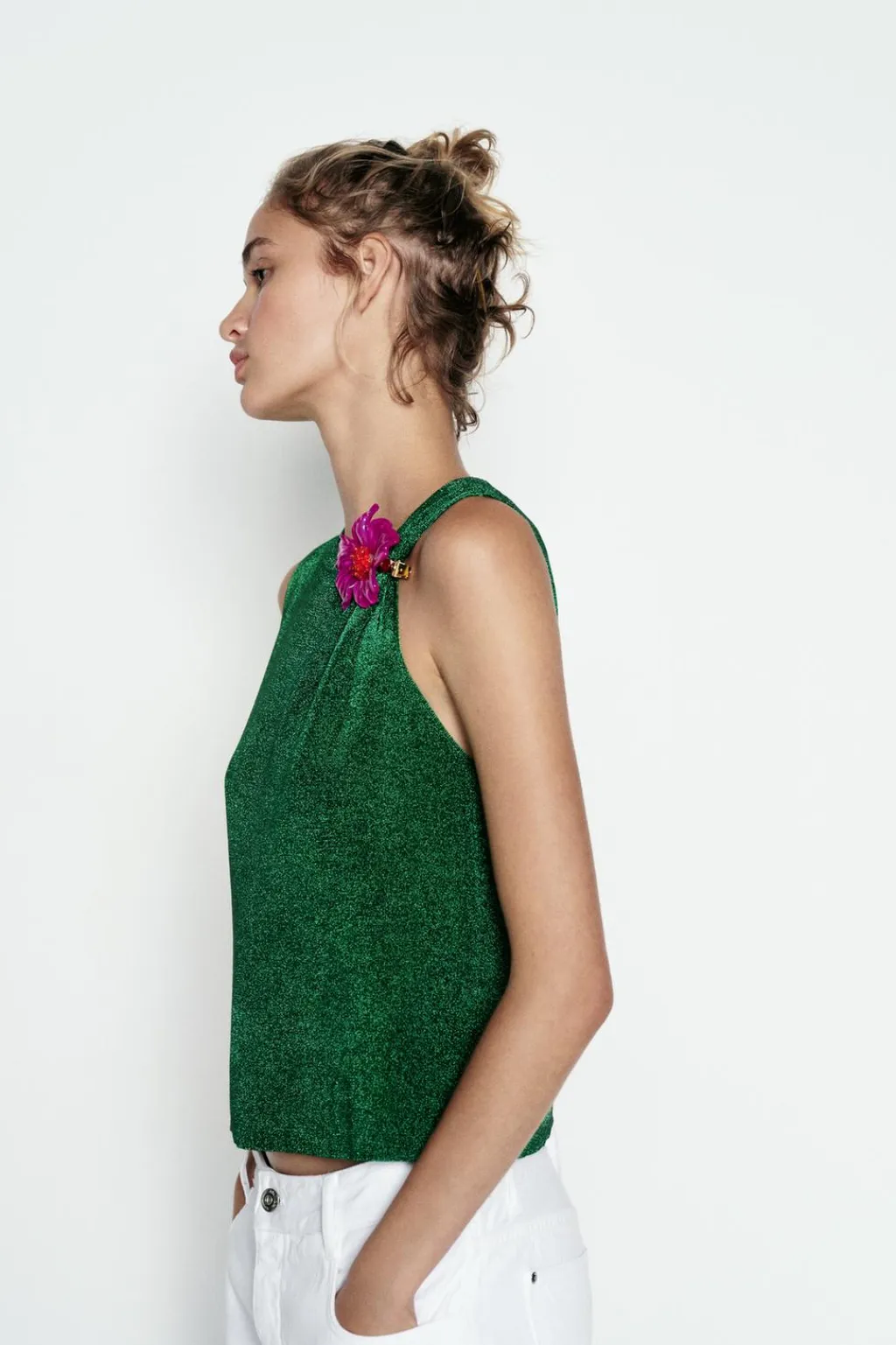 Top de cuello redondo y manga sisa. Detalle de tejido con hilo metalizado. Cierre en espalda con abertura y botón.