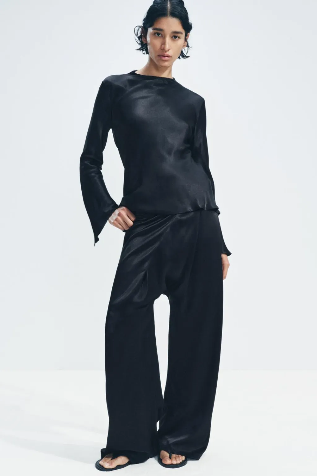 Top confeccionado en hilatura de viscosa 100%. Cuello alto y manga larga acabada en línea evasé. Cierre en espalda con cremallera oculta en costura.