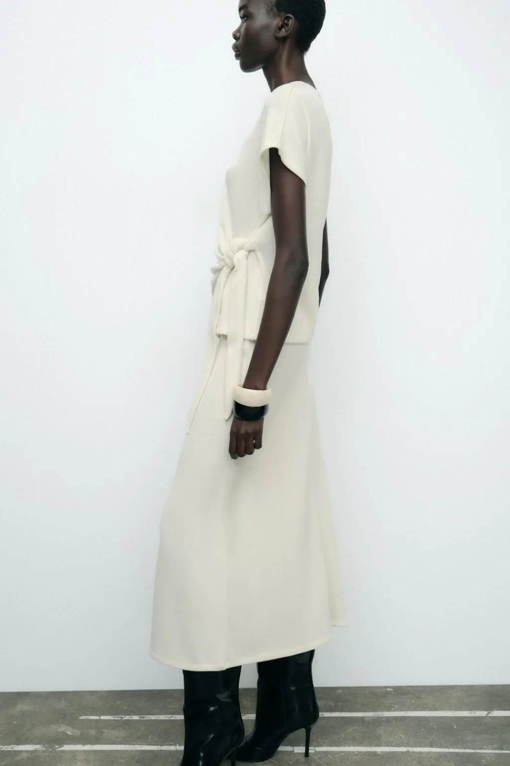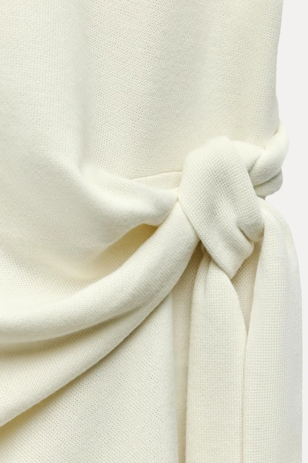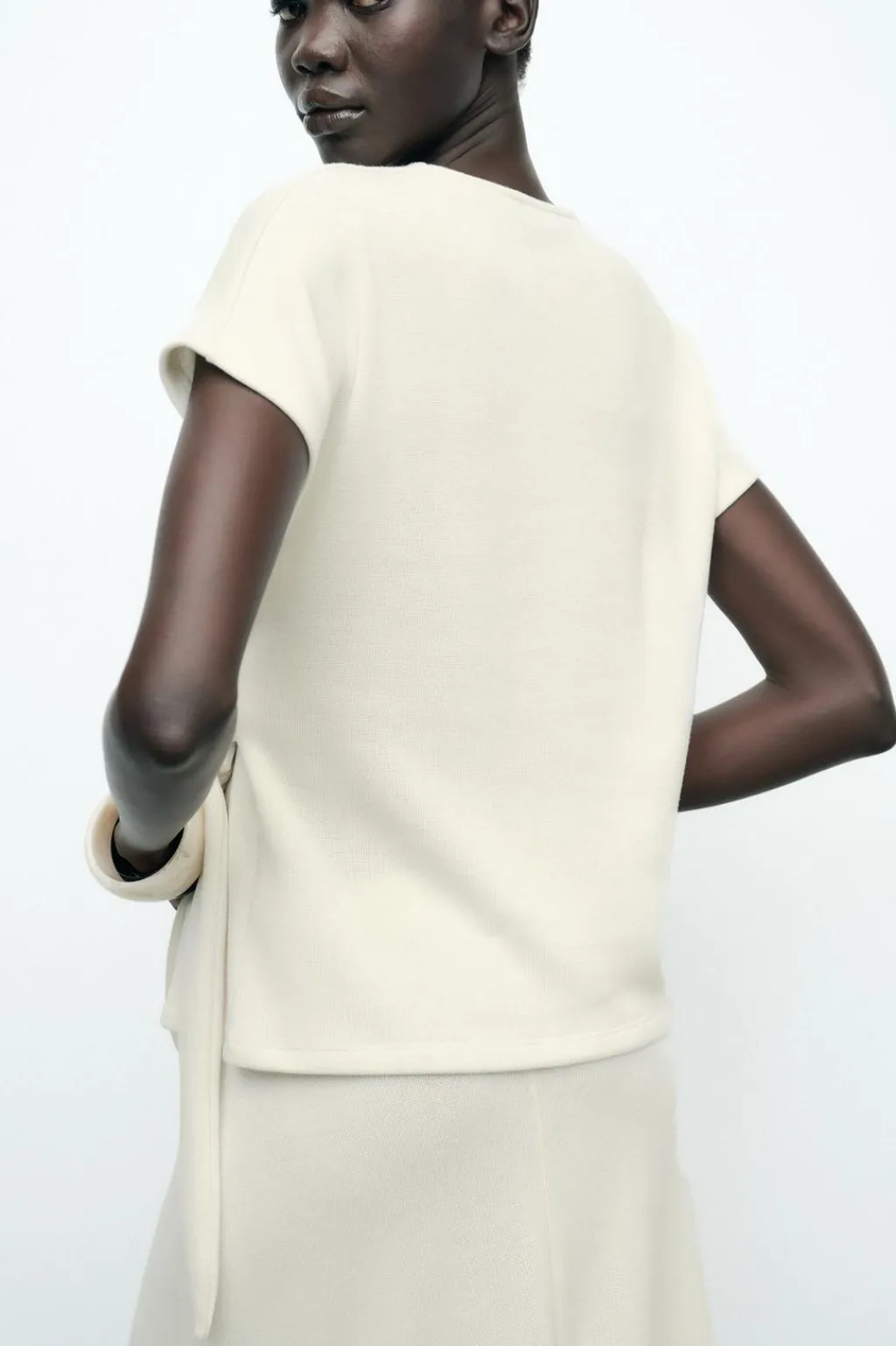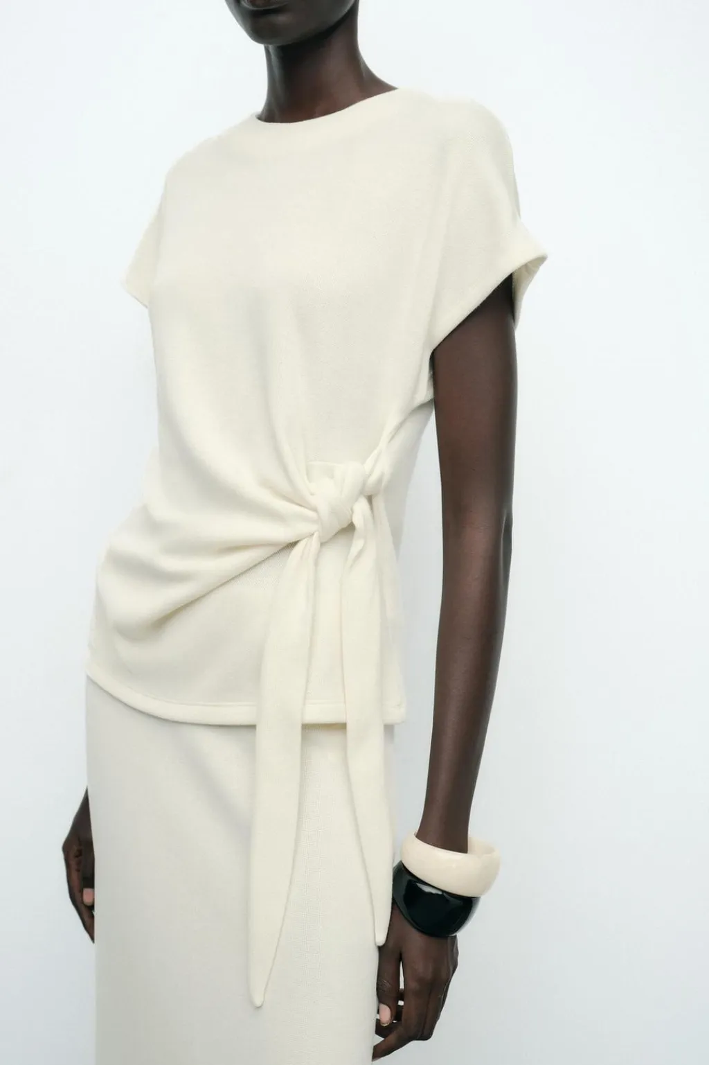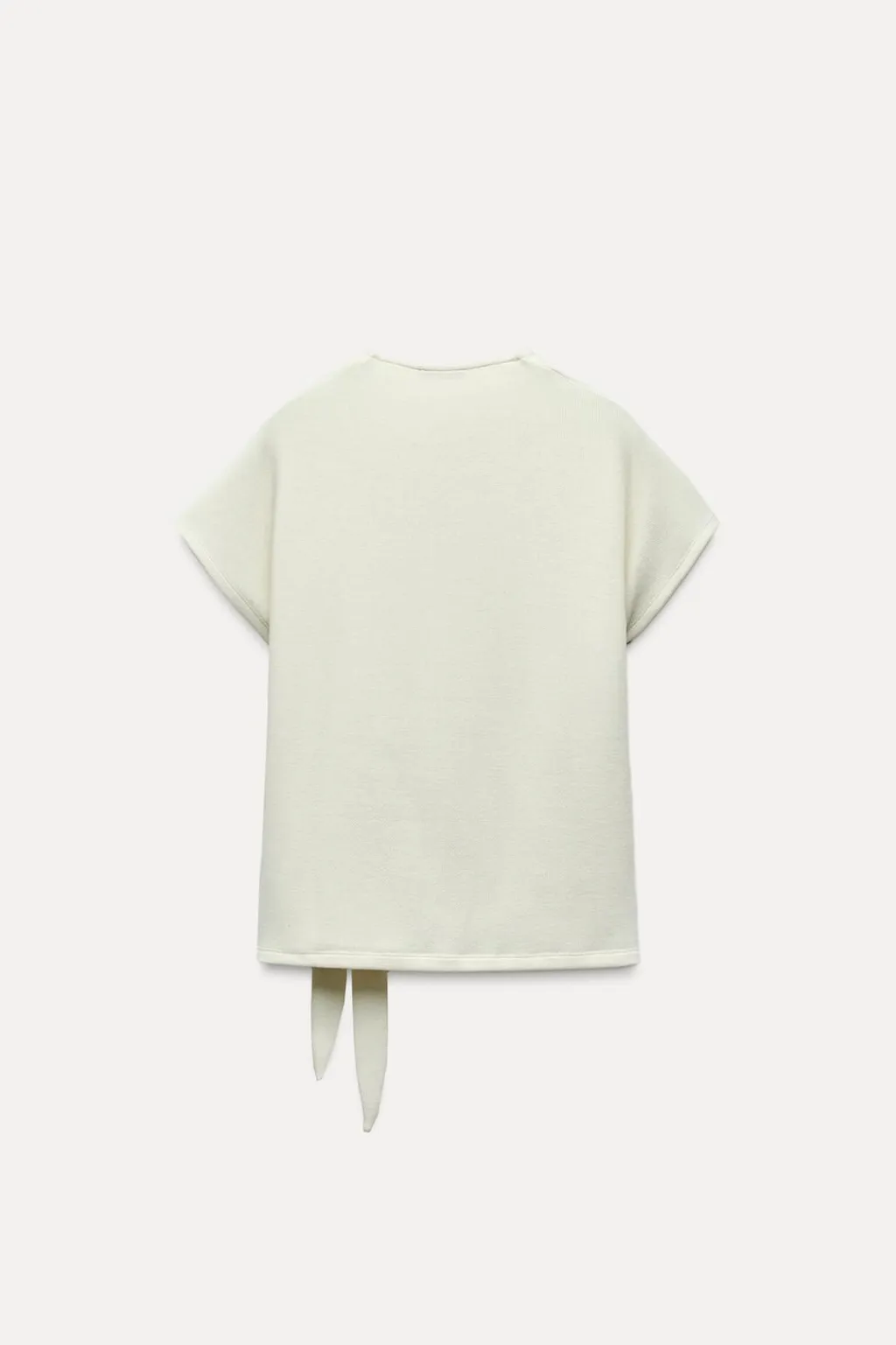 Top de cuello redondo y manga corta. Detalle de nudo con lazadas en delantero. Bajo redondeado.