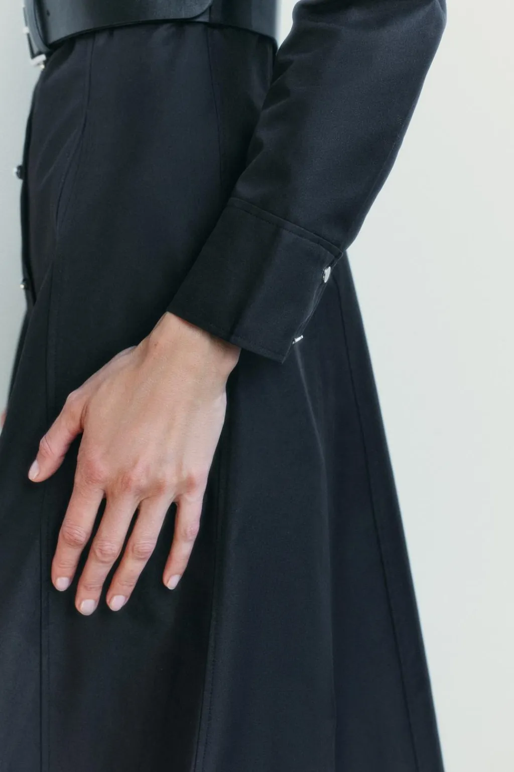 Vestido midi confeccionado en hilatura con mezcla de algodón. Cuello solapa y manga larga acabada en puño. Cinturón a tono ajustable con hebilla metálica. Cierre frontal con botones.