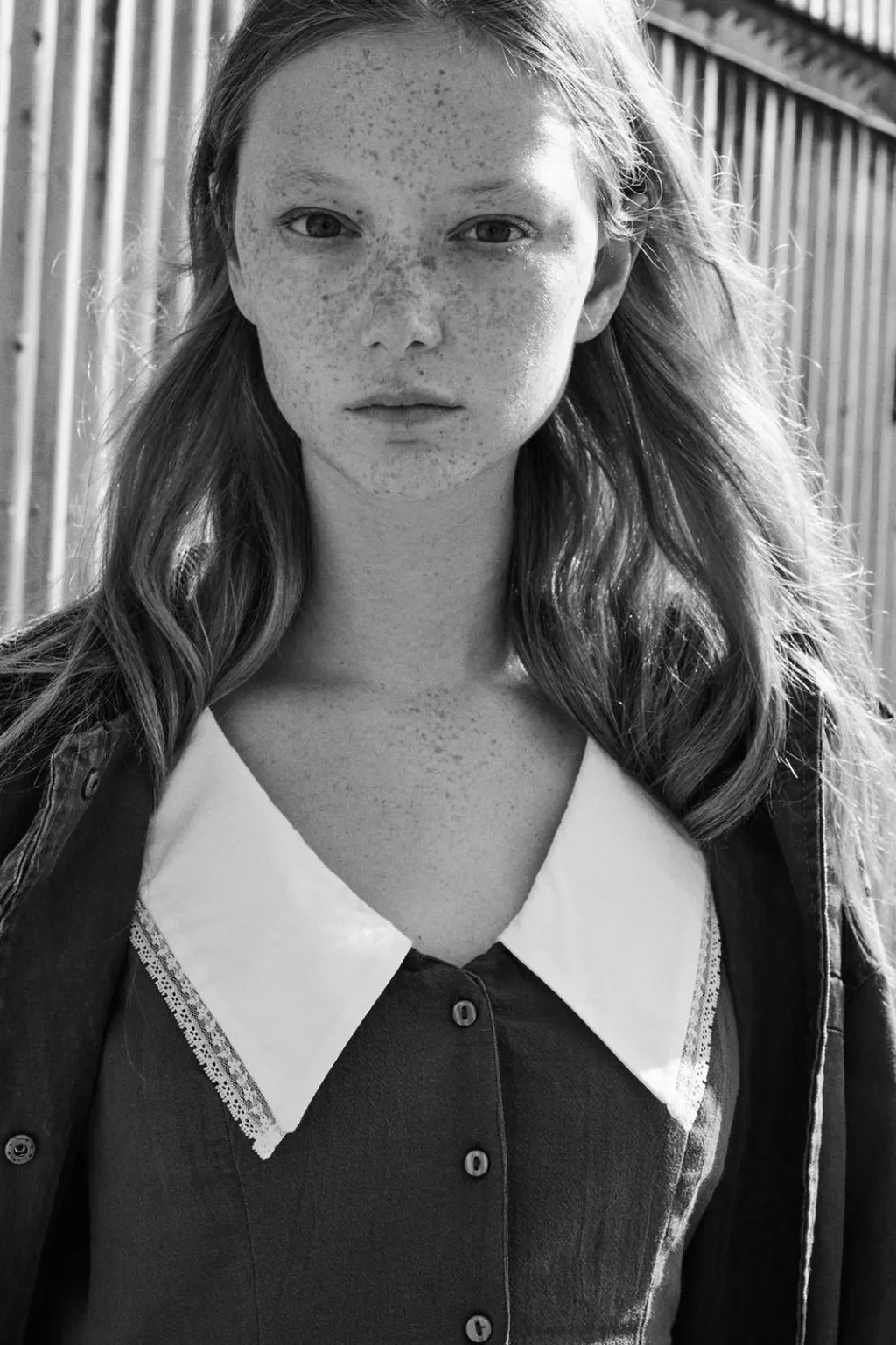 Vestido con cuello bobo con puntilla. Escote pico y manga larga acabada en elástico. Bolsillos laterales ocultos en costura. Botones delanteros. Forro interior. Cierre lateral con cremallera oculta en costura.