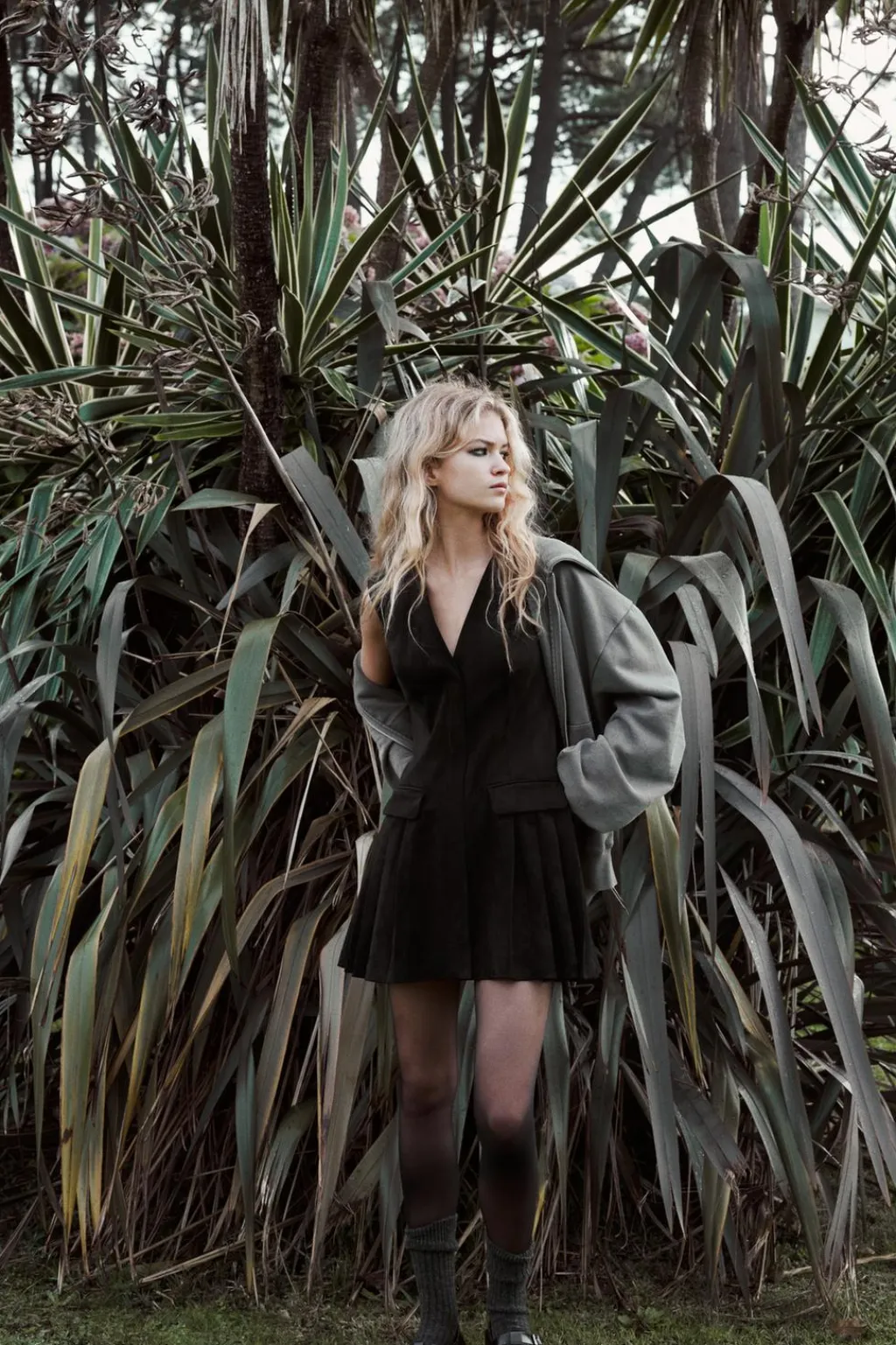 Vestido corto de escote pico y manga sisa. Falsos bolsillos con solapa en delantero. Bajo acabado en tablas. Cierre lateral con cremallera oculta en costura.
