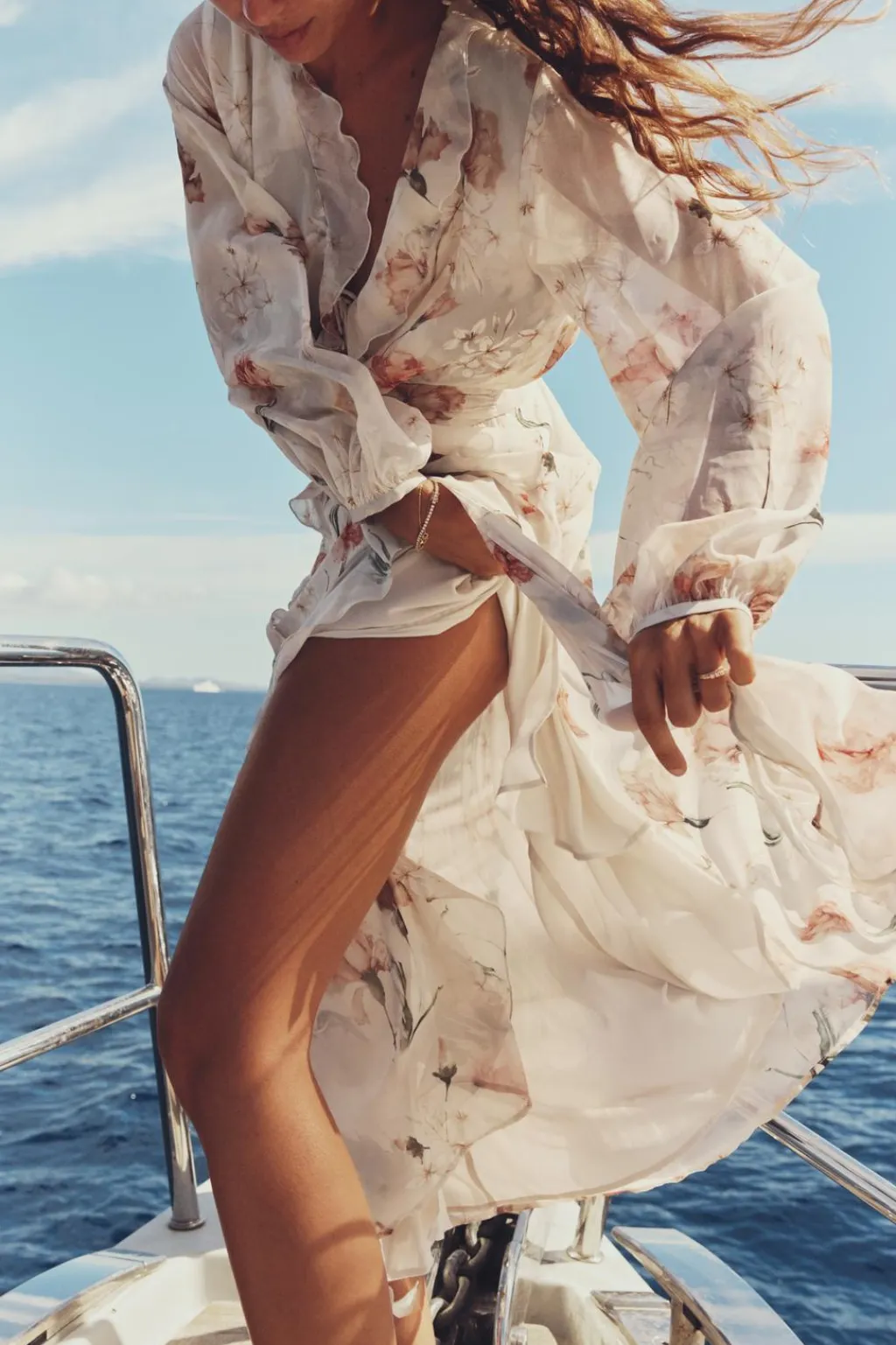 Vestido de escote pico y manga larga. Detalle de aberturas en cintura y volantes. Forro interior combinado. Bajo con abertura lateral. Cierre en espalda con cremallera oculta en costura.