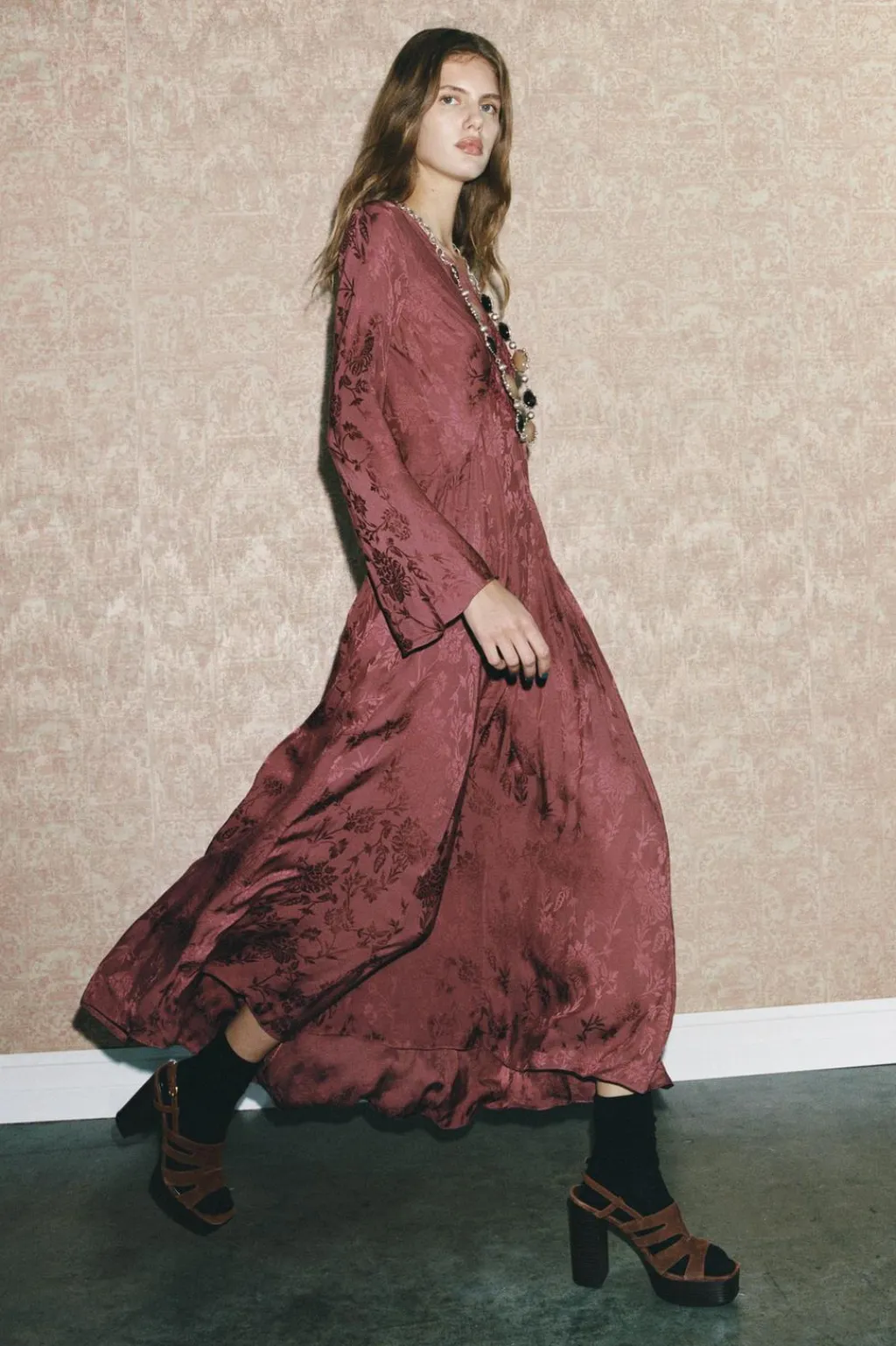 Vestido midi confeccionado en hilatura de viscosa. Escote pico y manga larga acabada en línea evasé. Detalle de bordado en delantero y tejido con jacquard floral. Bajo acabado en línea evasé.