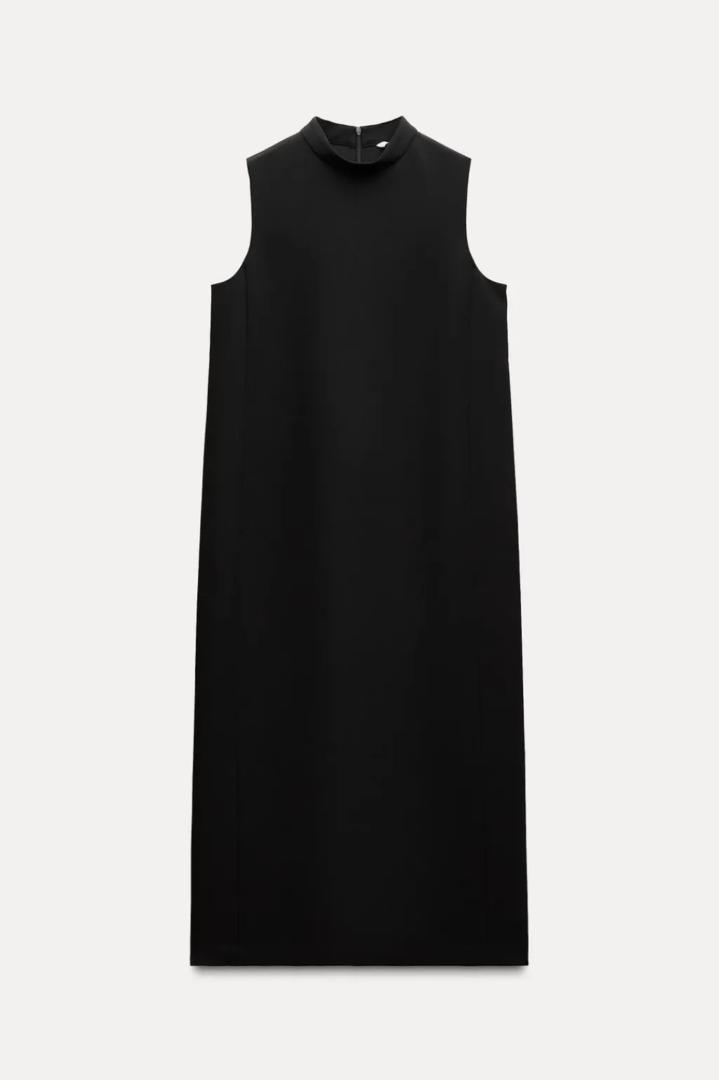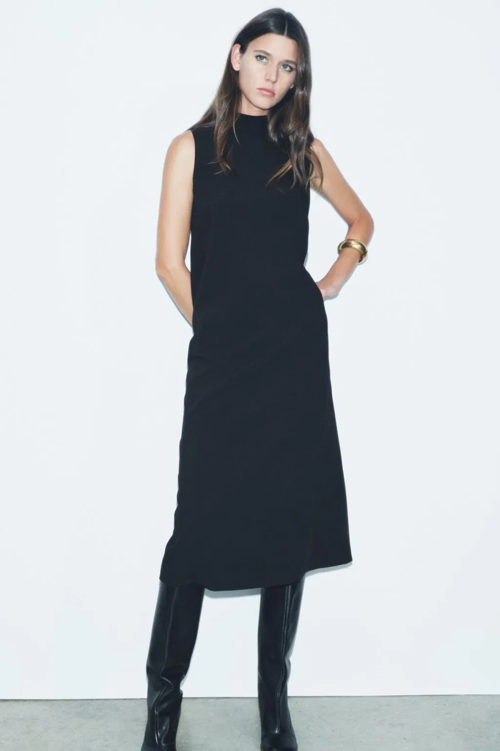 Vestido midi confeccionado en hilatura con viscosa 22%. Cuello perkins y manga sisa. Cierre en espalda con cremallera oculta en costura.