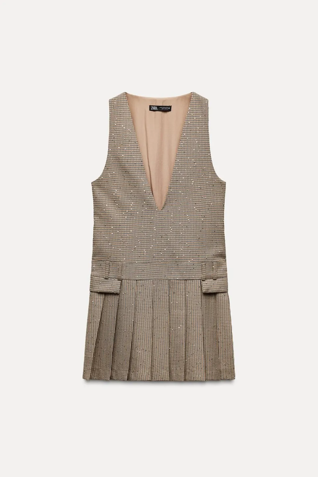Vestido de escote pico pronunciado y manga sisa. Detalle de falsos bolsillos con solapa delanteros y bajo acabado con pliegues. Aplicación de lentejuelas.
