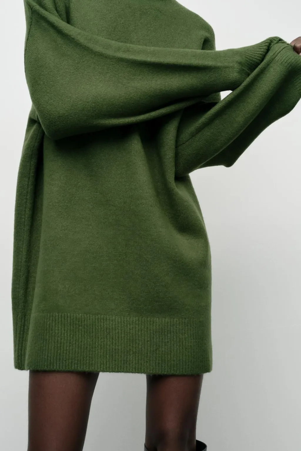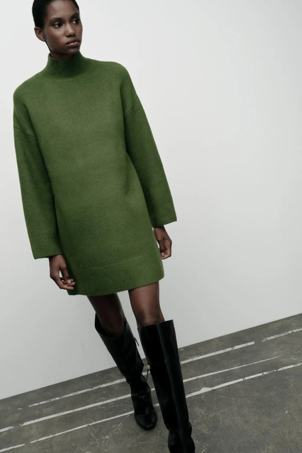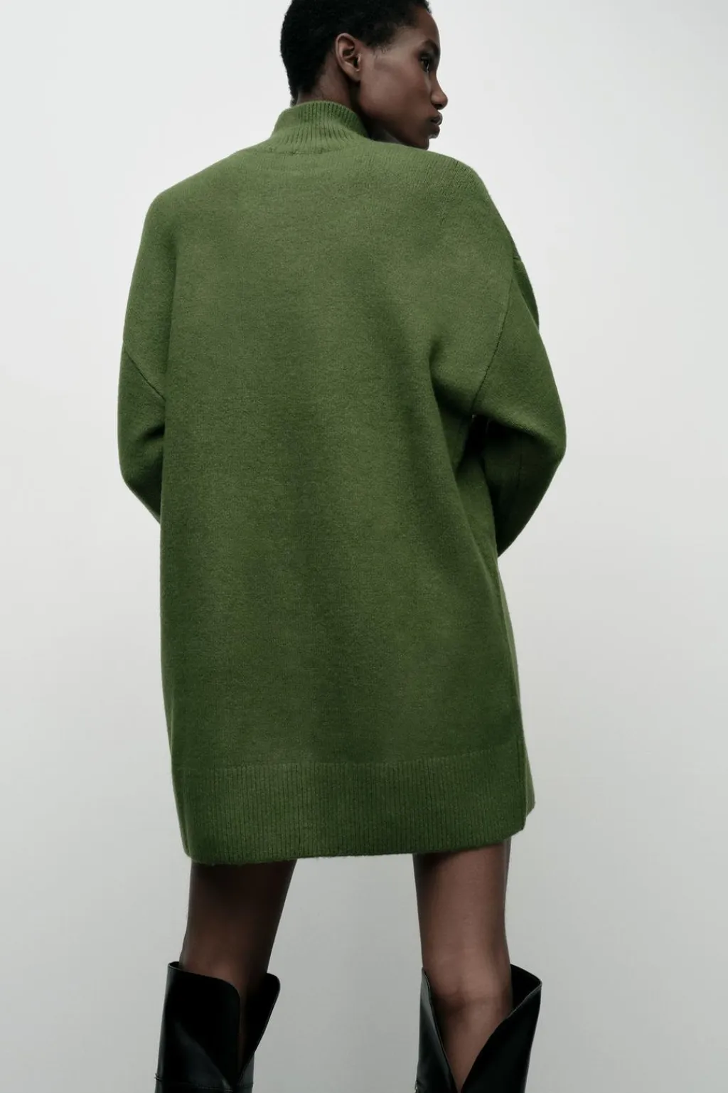 Vestido corto de cuello subido y manga larga. Acabados en rib.