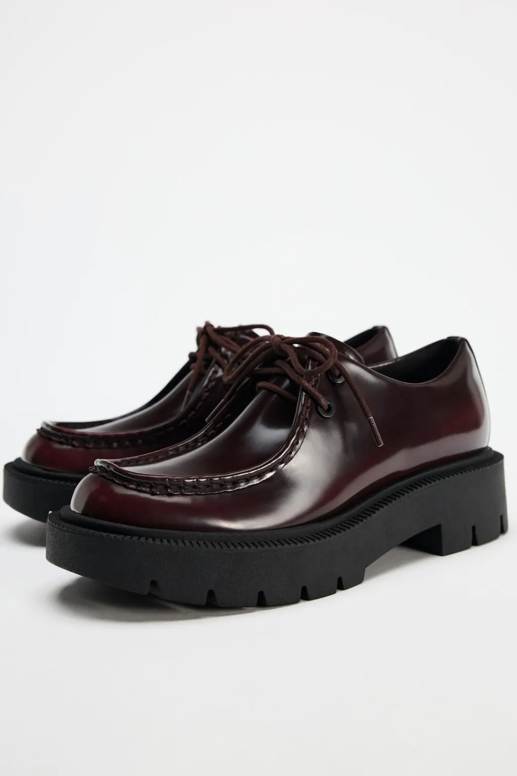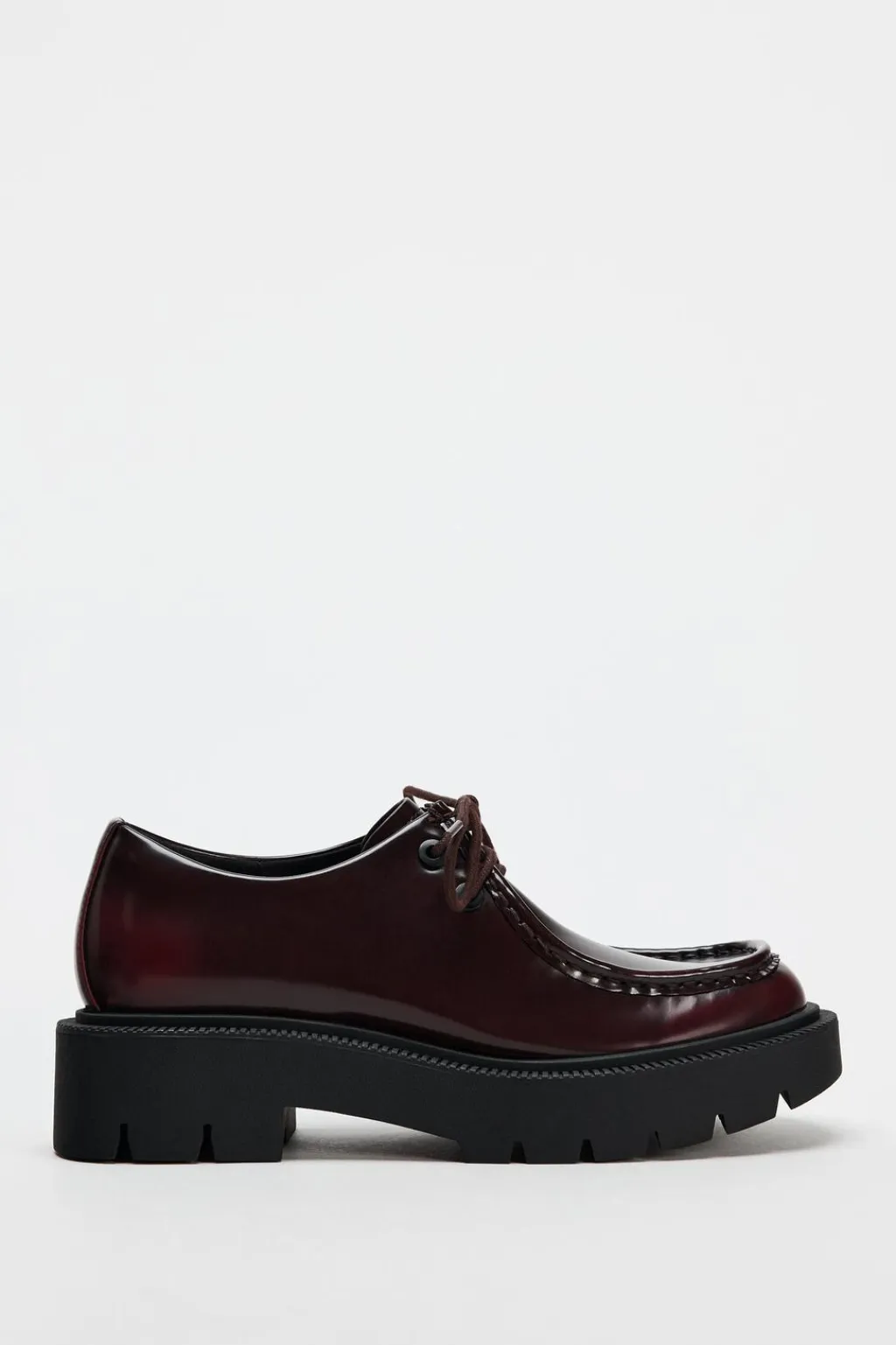 Zapato plano con detalle de pespuntes en la parte delantera. Cierre mediante cordones ajustables. Suela gruesa dentada.