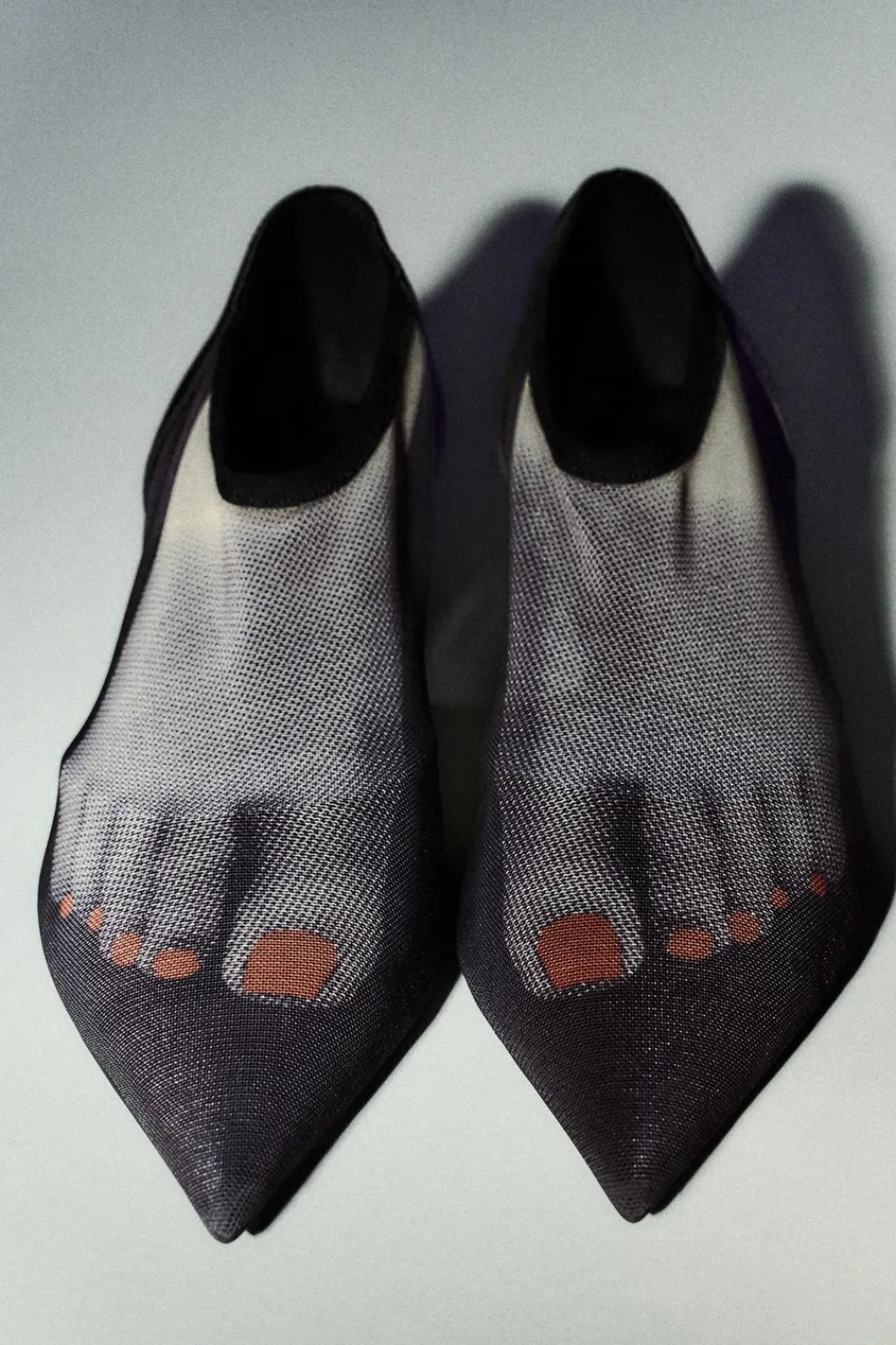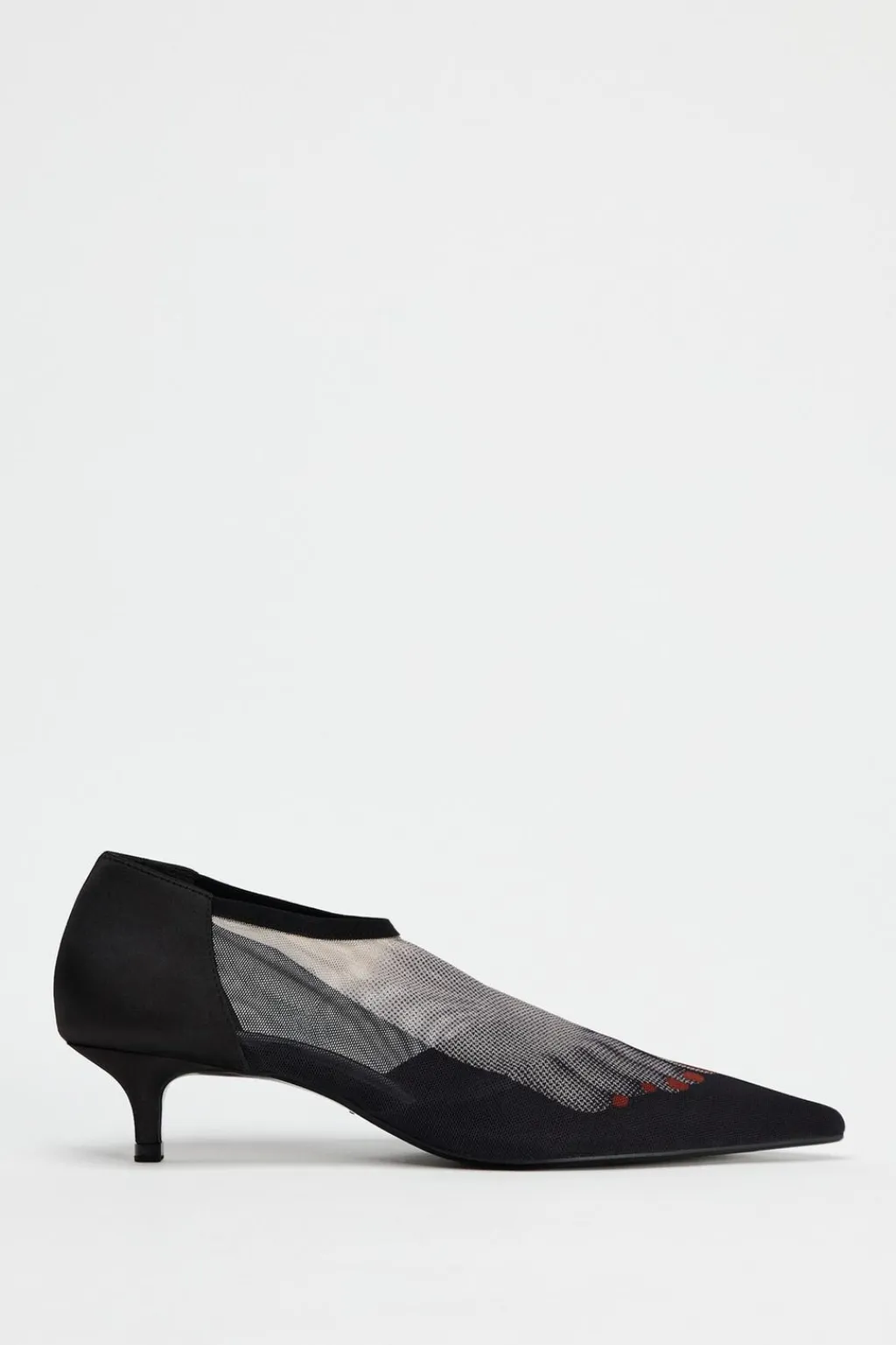 Zapato tacón kitten en tejido efecto mesh. Detalle de dibujo en la parte delantera. Cierre mediante tira elástica a la pulsera del tobillo. Acabado en punta.