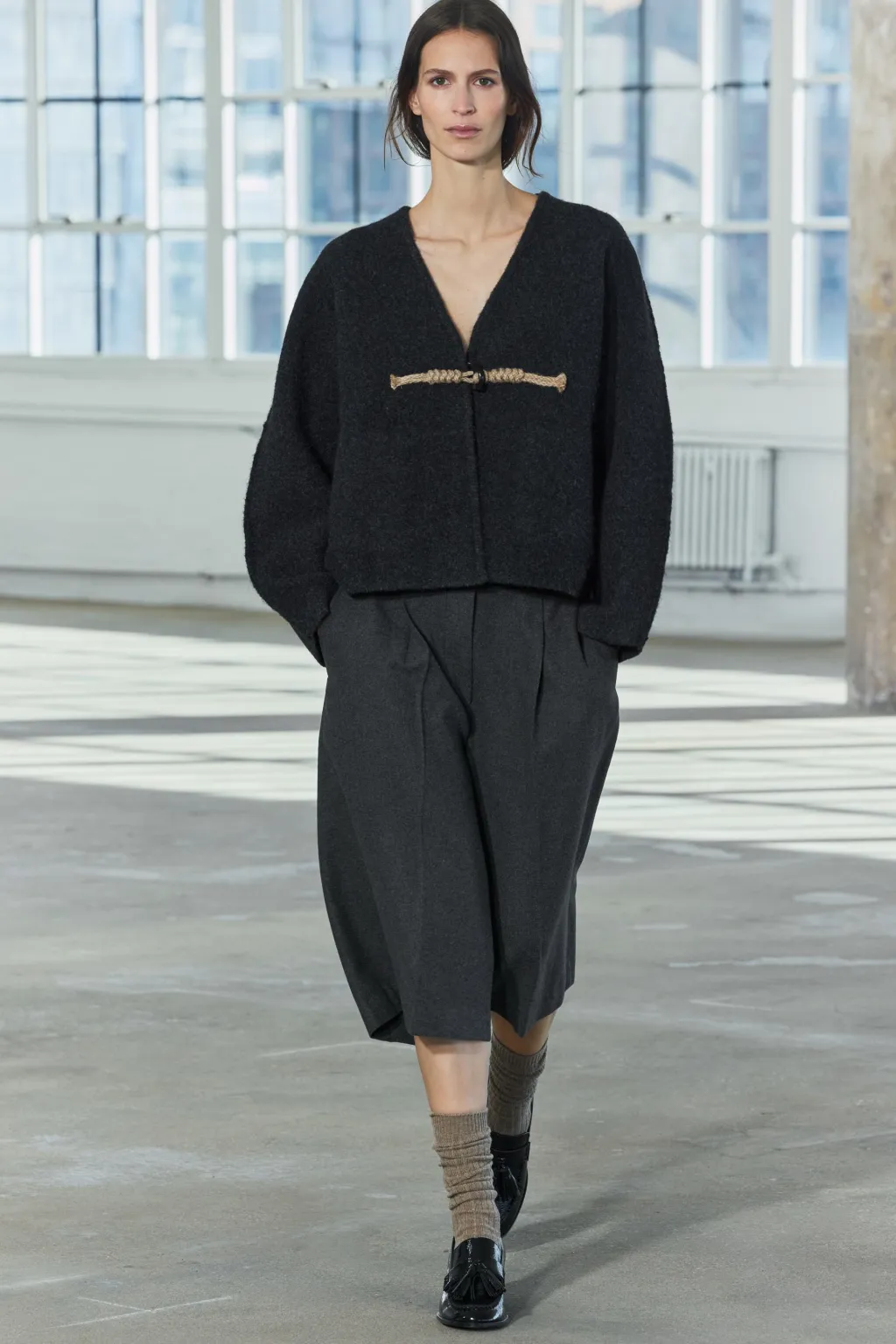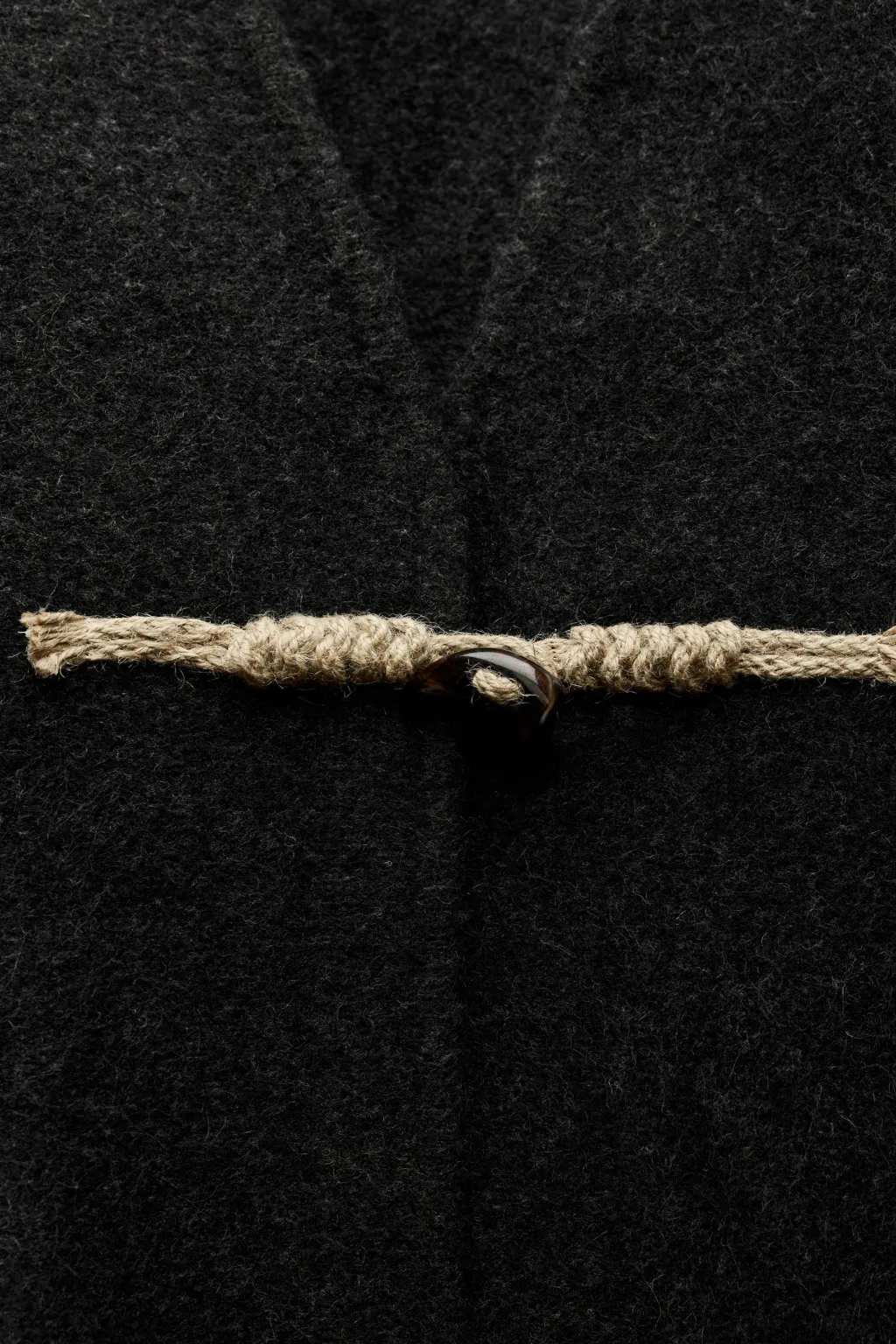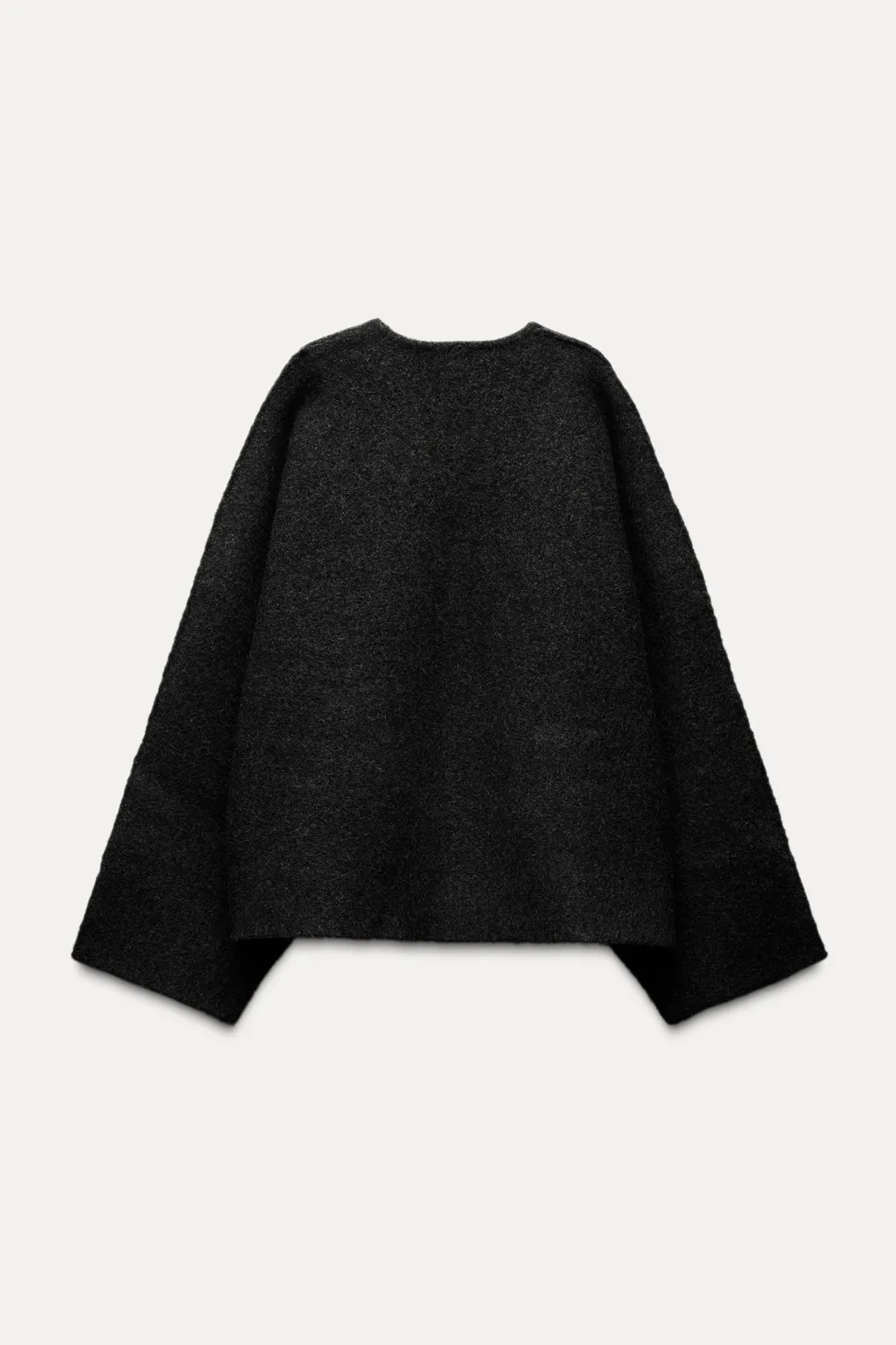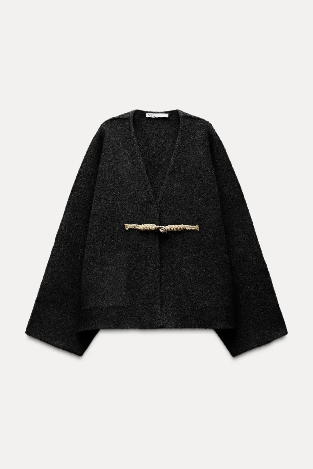 Abrigo corto estilo kimono de escote pico y manga larga ancha. Bolsillos delanteros de vivo. Cierre frontal con alamar.