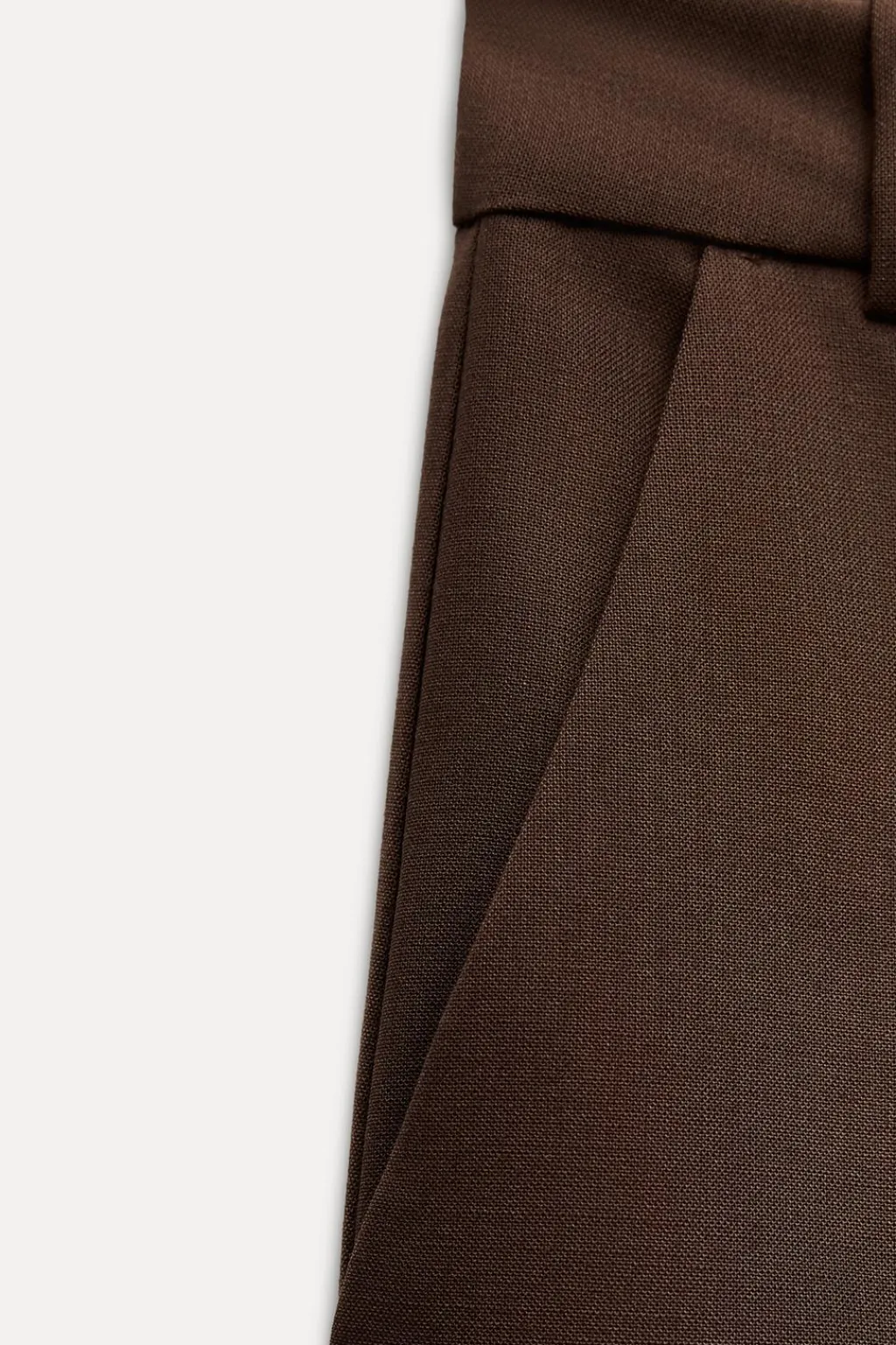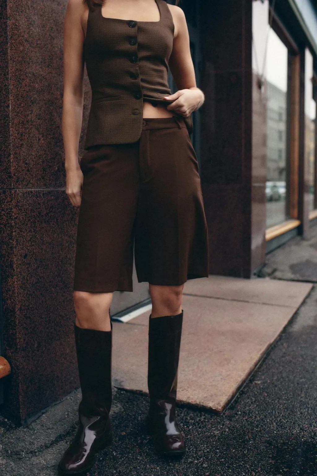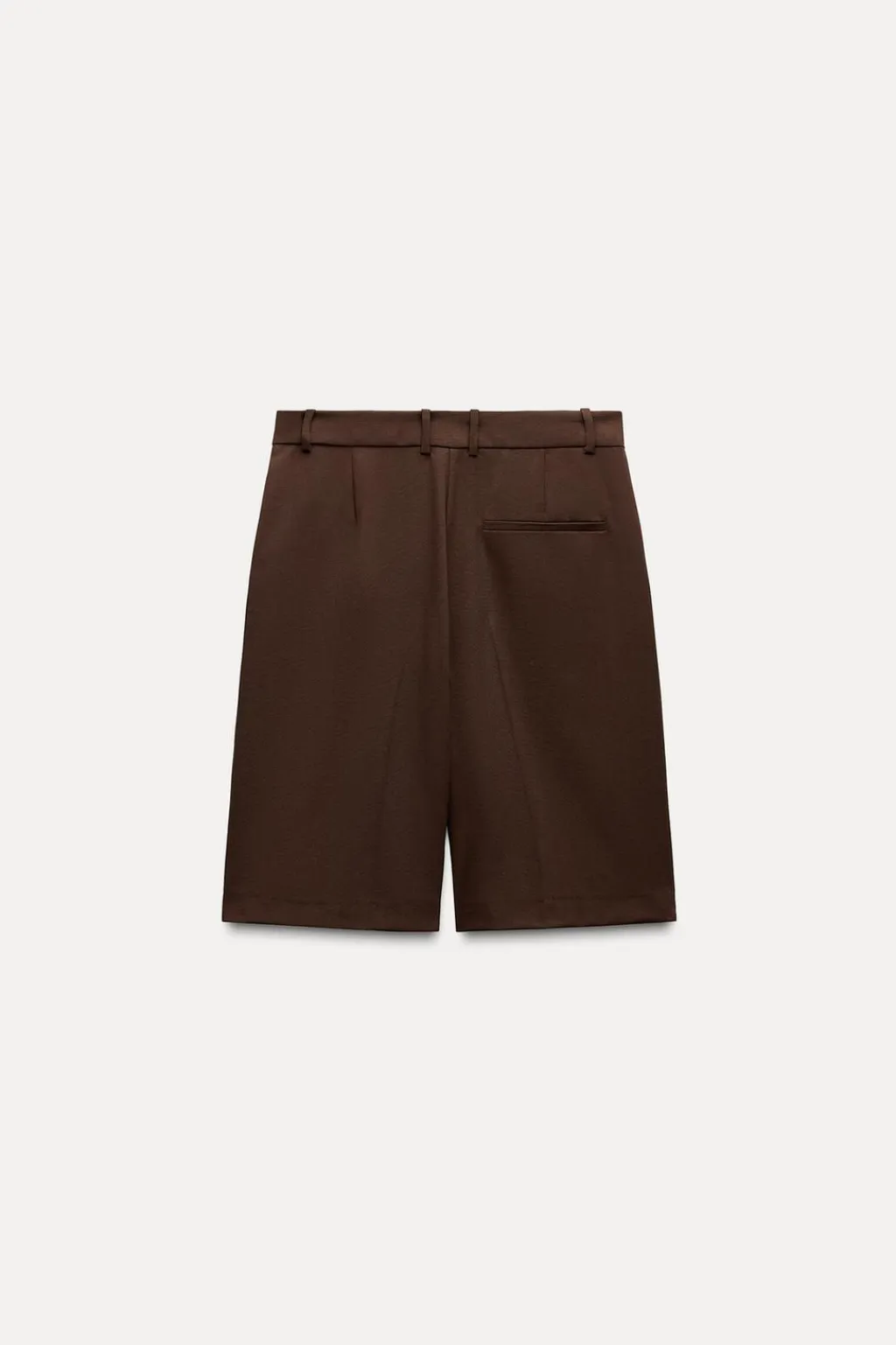 Bermuda de tiro alto con bolsillos delanteros y falso bolsillo de vivo en espalda. Cierre frontal con cremallera y botón.