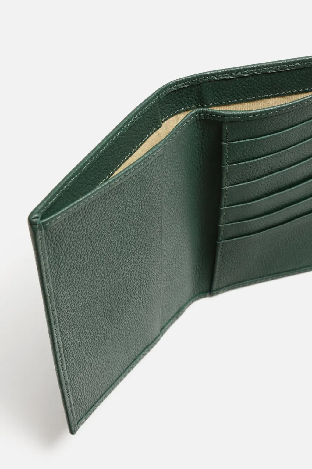 Cartera tipo billetera fabricada en piel. Monocolor. Cuenta con seis posiciones para tarjetas. Además tiene tres compartimentos para otros documentos.