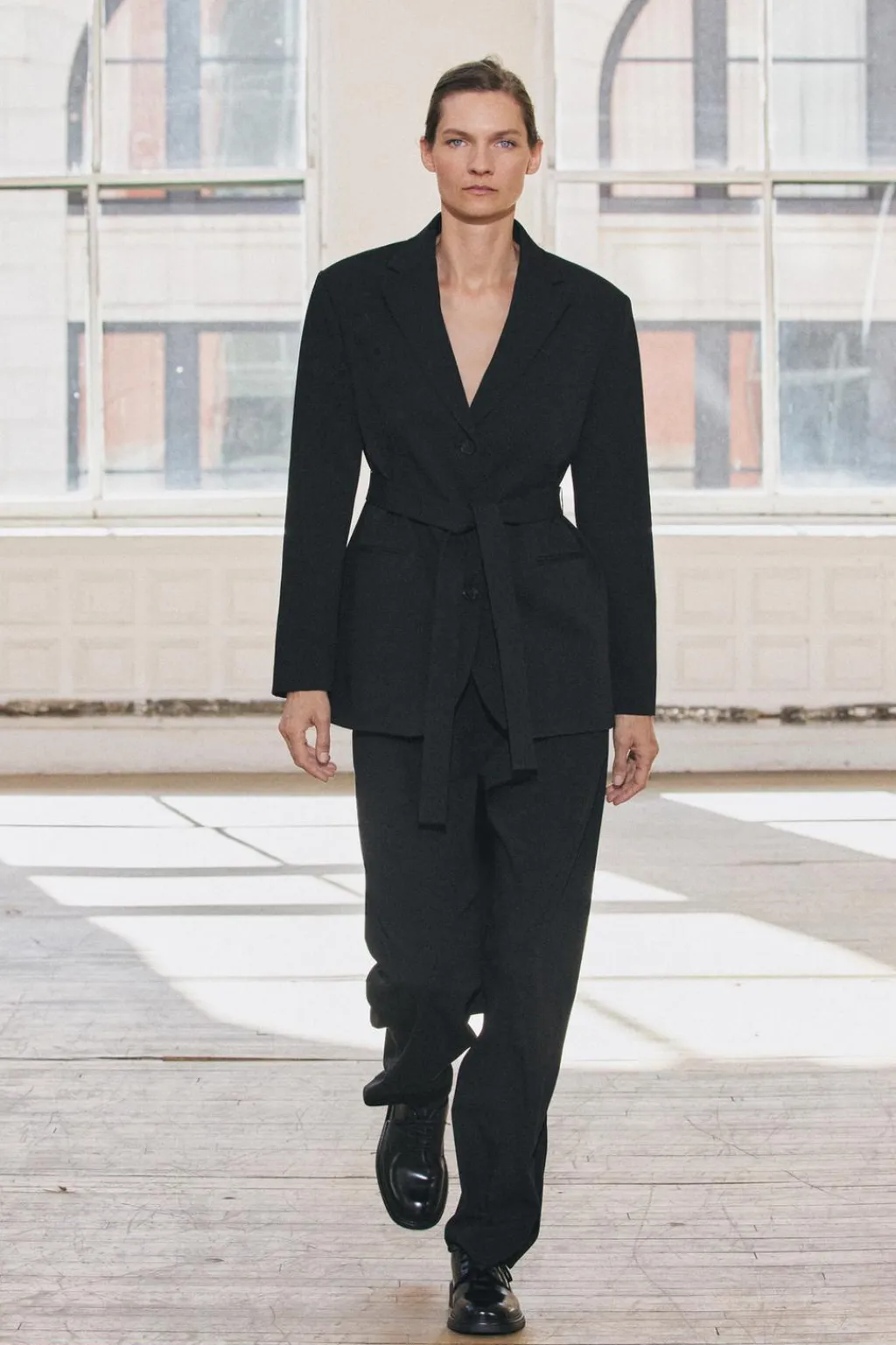 Blazer amplia con cuello solapa de muescas y manga larga. Bolsillos de vivo en delantero. Cinturón en mismo tejido ajustable con lazadas. Forro interior a tono. Cierre frontal con botones.