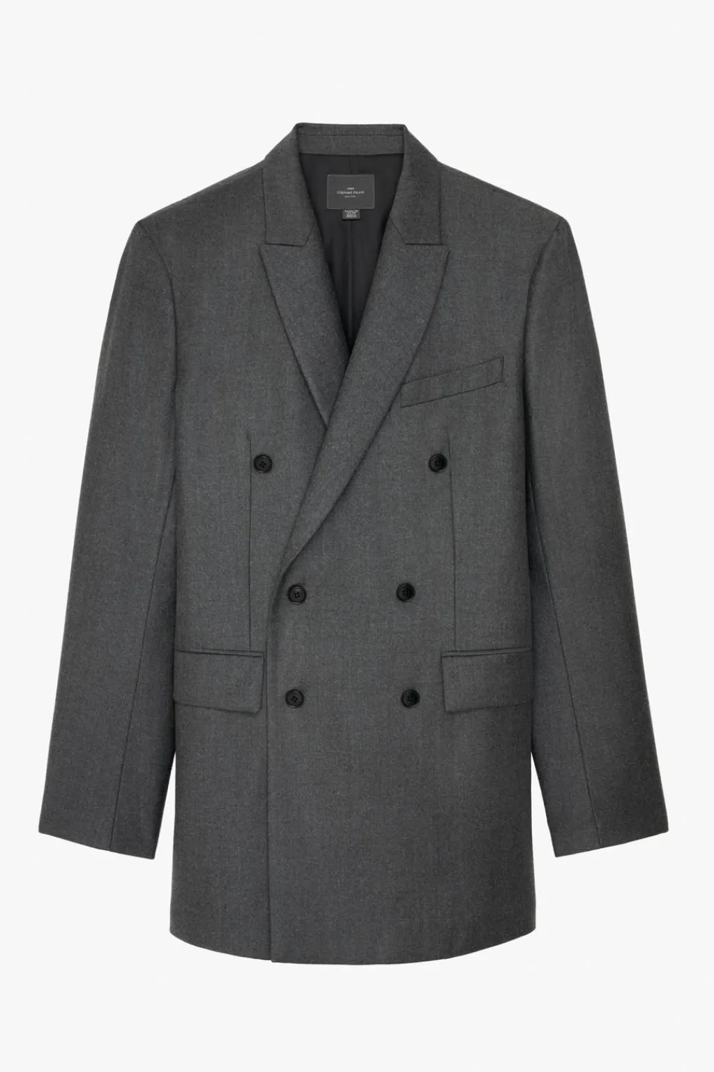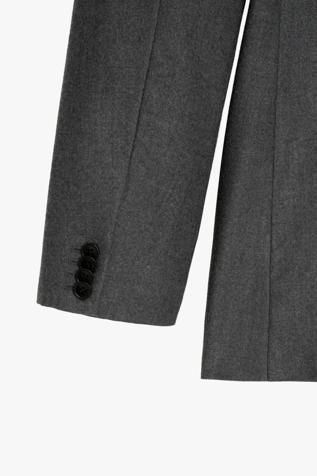 Blazer larga slim fitconfeccionada en tejido de lana de origen italiano. Acabado franela.Cuello con solapas de pico y manga larga acabada en puño con botones. Bolsillos de solapa en cadera. Detalle de bolsillo interior. Cierre frontal de botonadura cruzada.