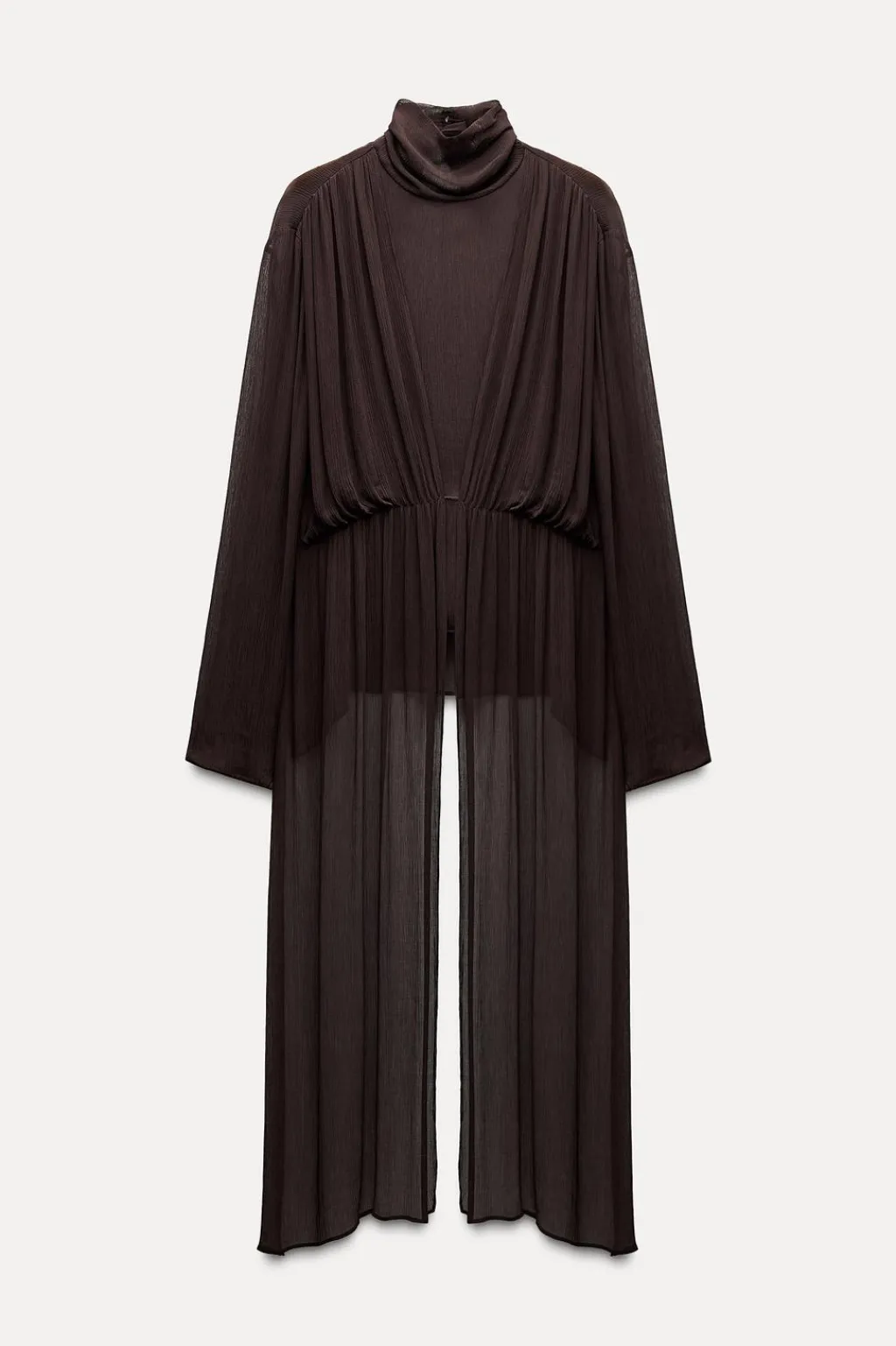 Blusa semitransparente confeccionado en hilatura de viscosa 100%. Cuello alto y manga larga. Detalle superposición en mismo tejido. Bajo asimétrico. Cierre en espalda con abertura y botón.