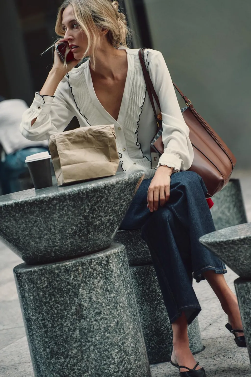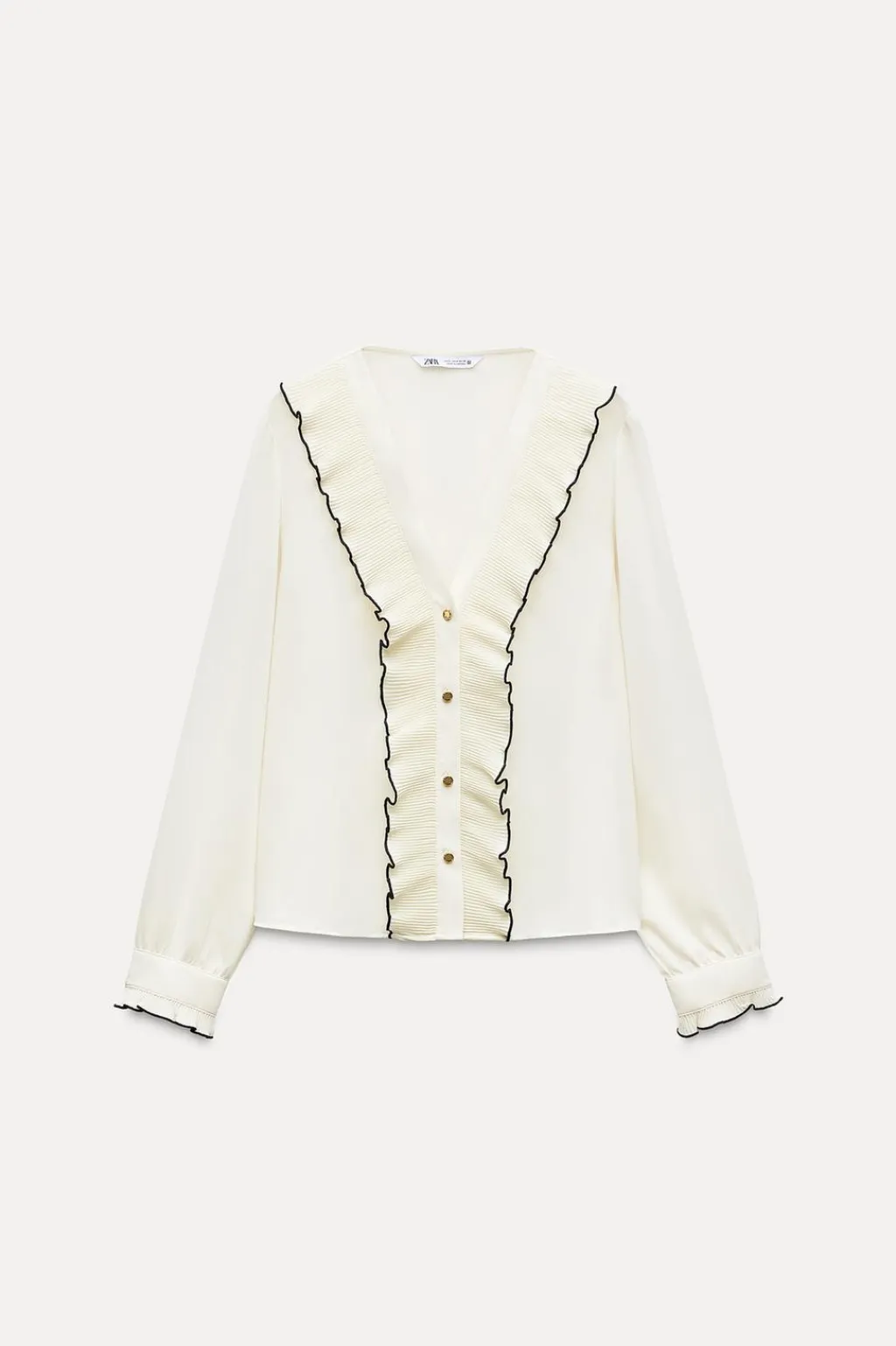 Blusa de escote pico y manga larga. Detalle de acabados con volantes plisados y vivos combinados a contraste. Cierre frontal con botones.