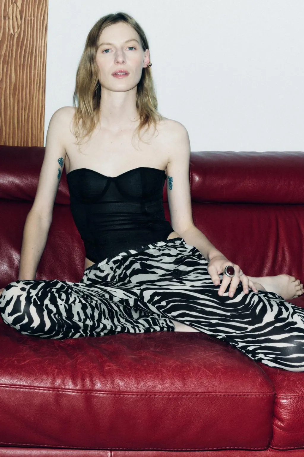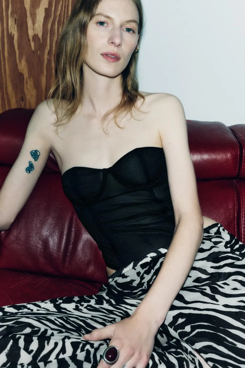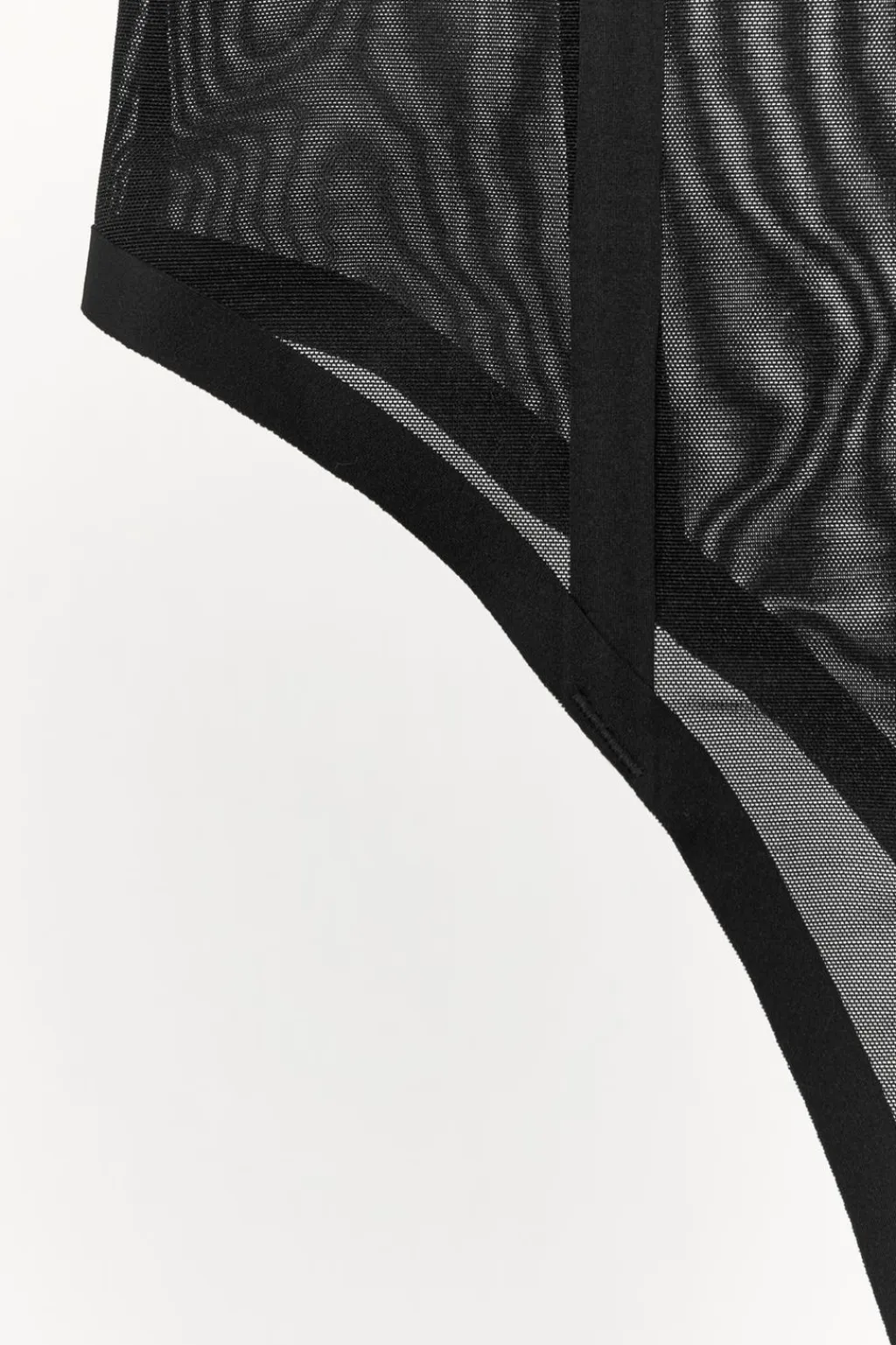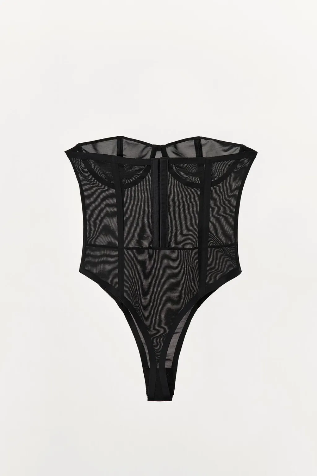 Body semitransparente con aros de escote corazón. Detalle aplicación de varillas interiores que realzan y estilizan la figura. Cierre en bajo con botones a presión y en espalda con ganchos metálicos.