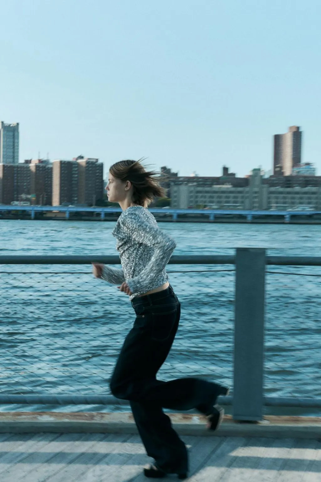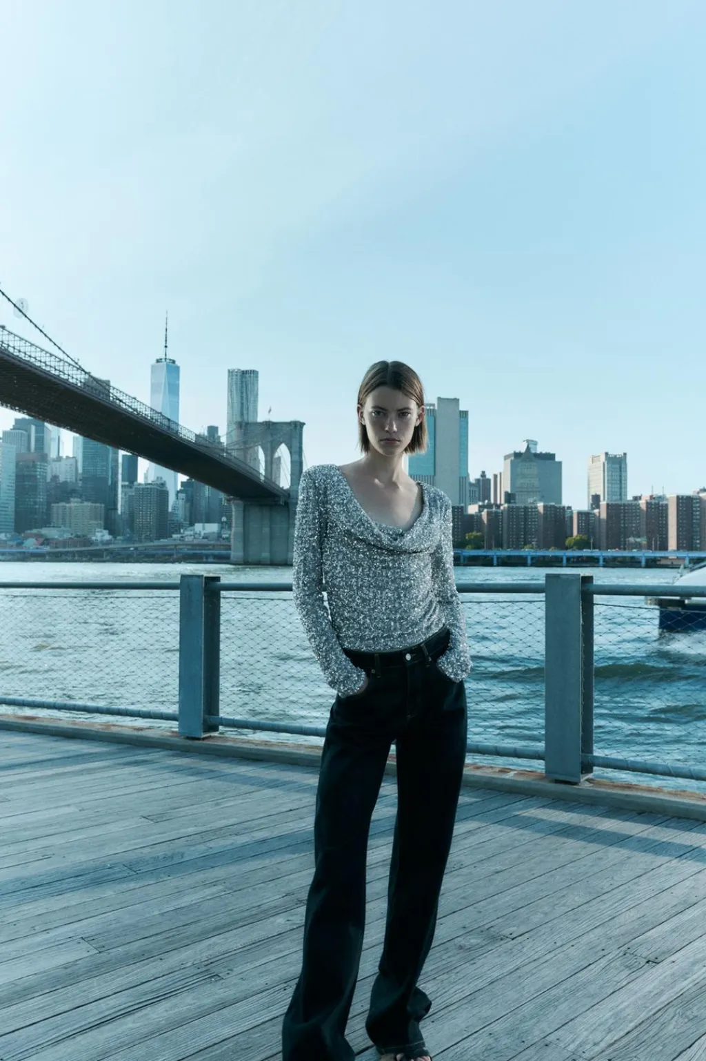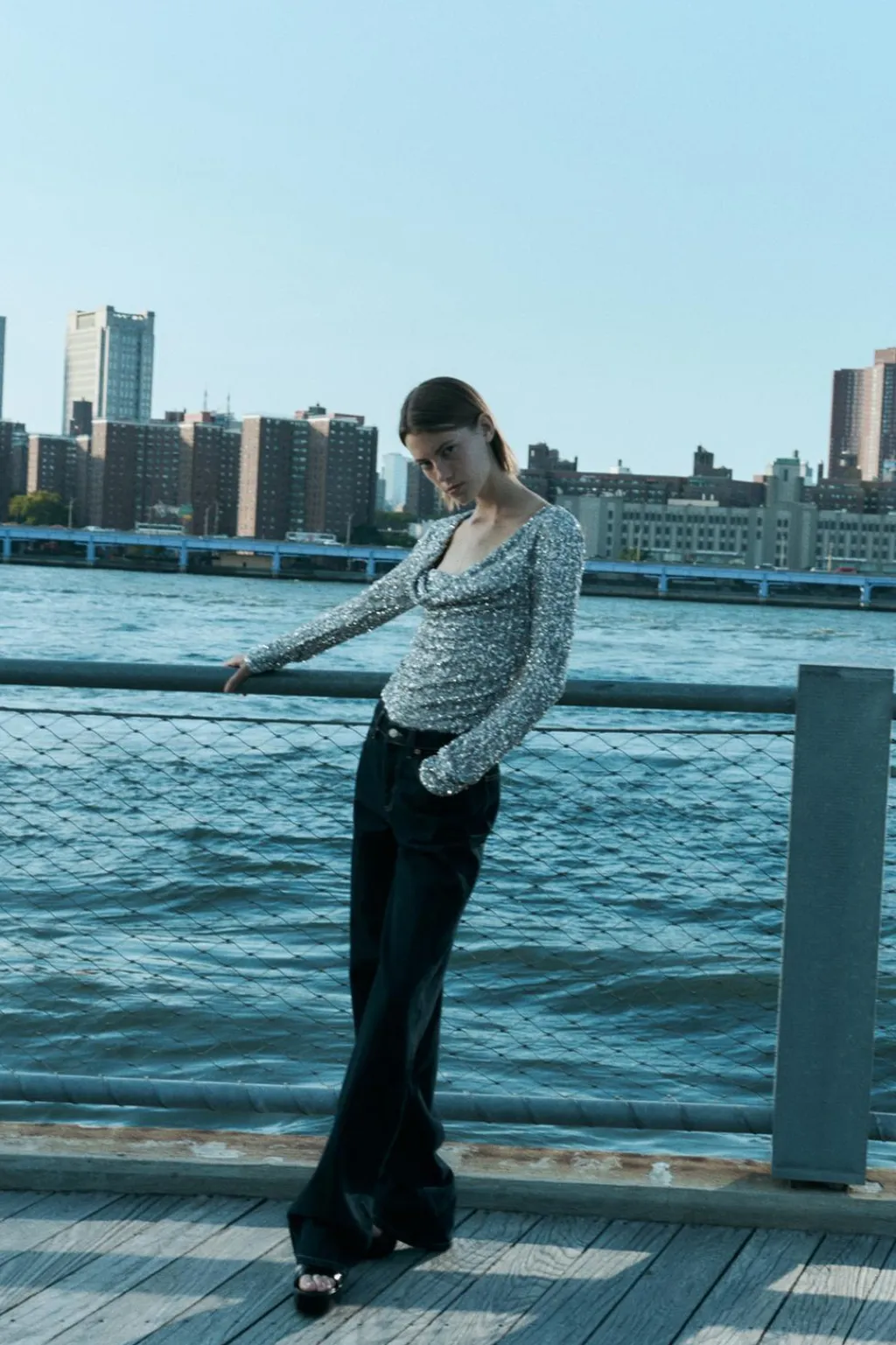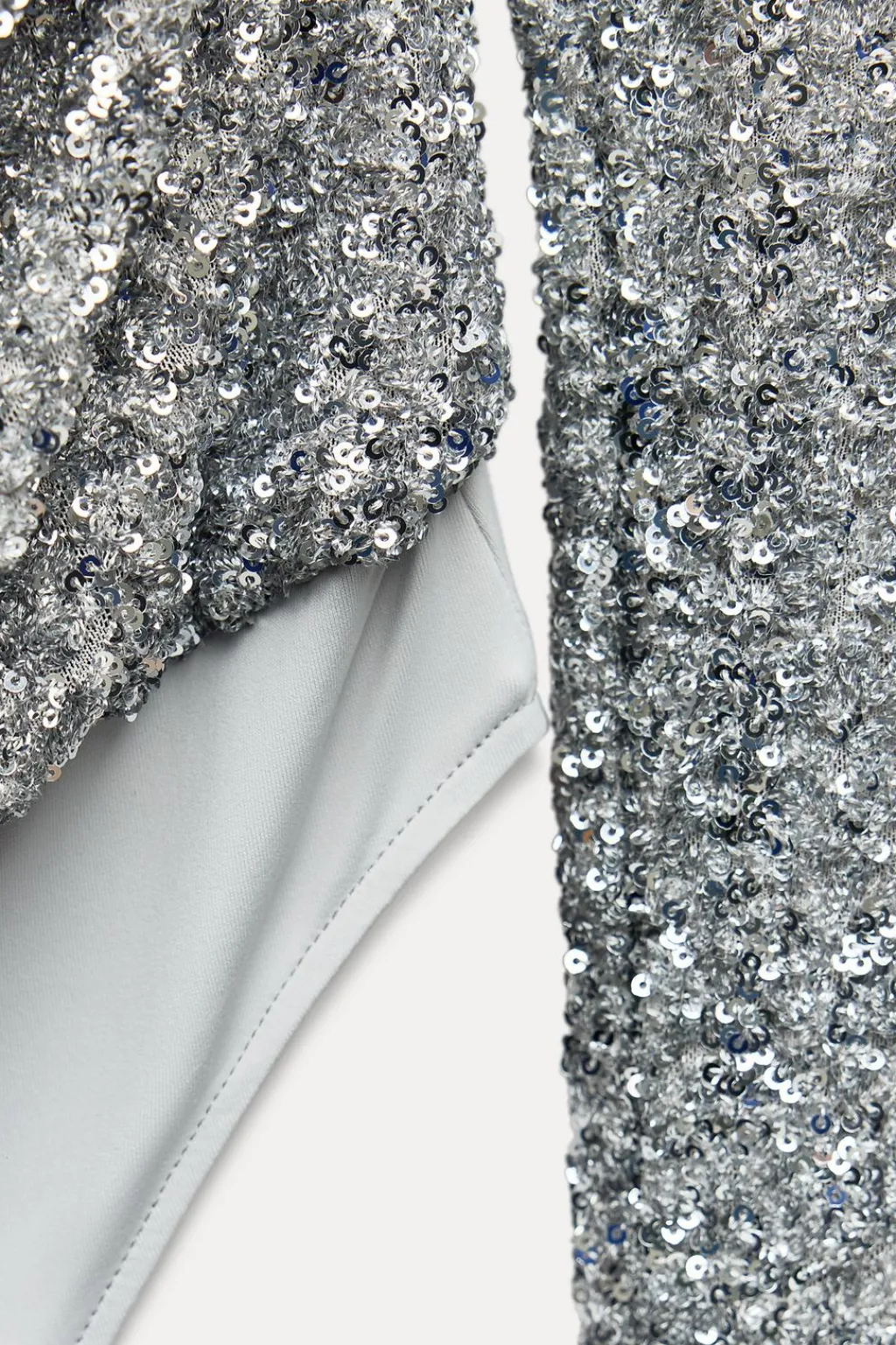 Body de escote drapeado y manga larga. Forro interior. Detalle aplicación lentejuelas. Cierre en bajo con botones a presión.