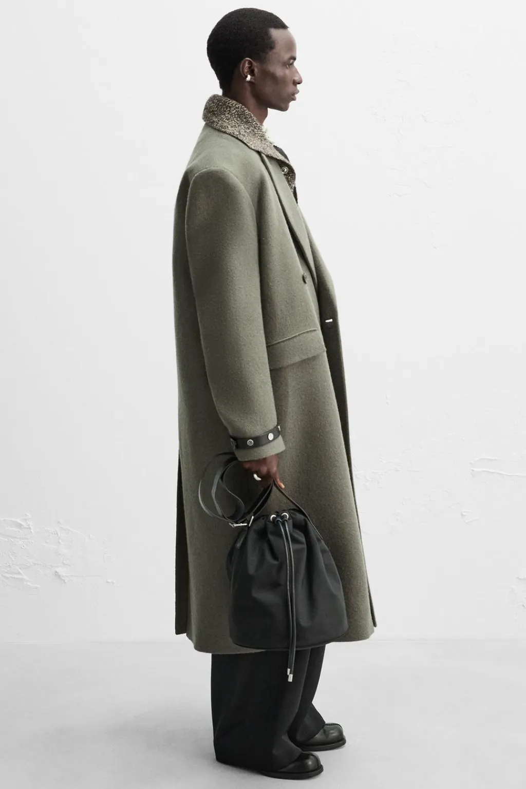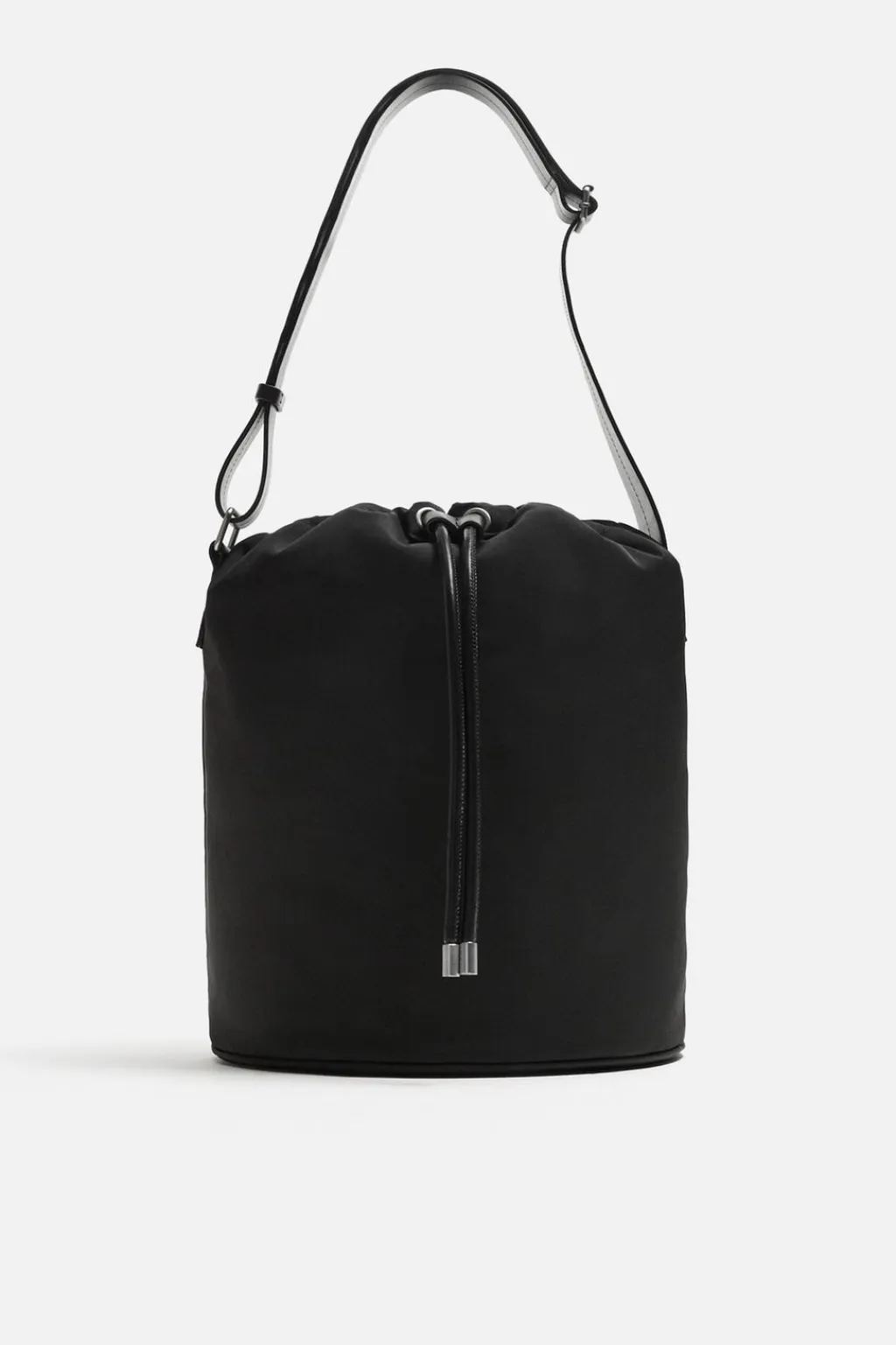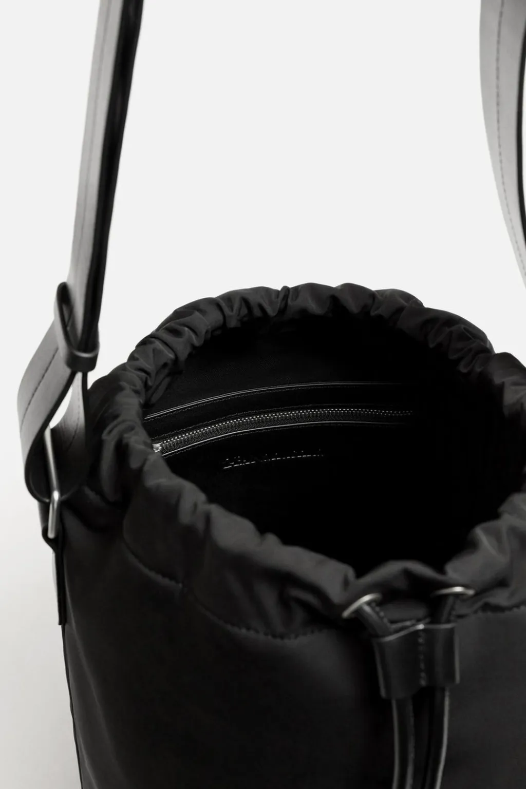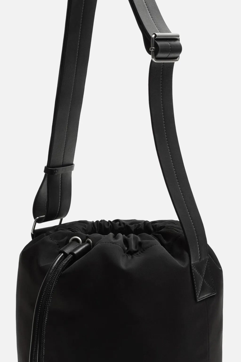Bolso tipo bucket fabricado en tejido técnico. Compartimento principal con cierre mediante fruncido. Interior cuenta con dos bolsillos uno de ellos con cierre mediante cremallera. Asa de hombro ajustable en piel.