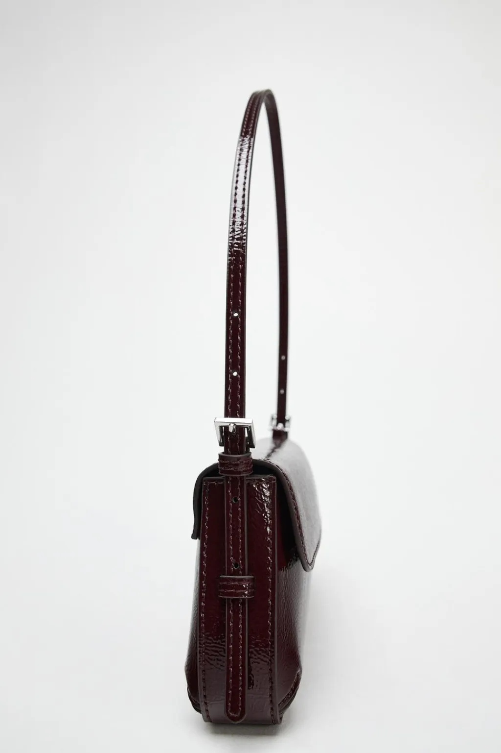 Bolso de hombro con solapa. Efecto acharolado. Asa de hombro ajustable. Cierre mediante imán.