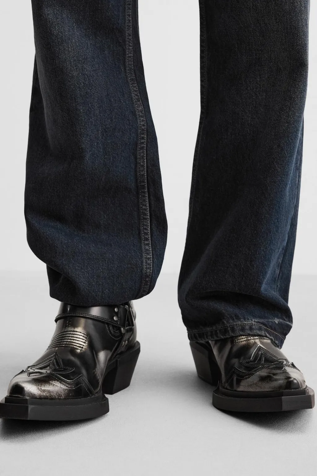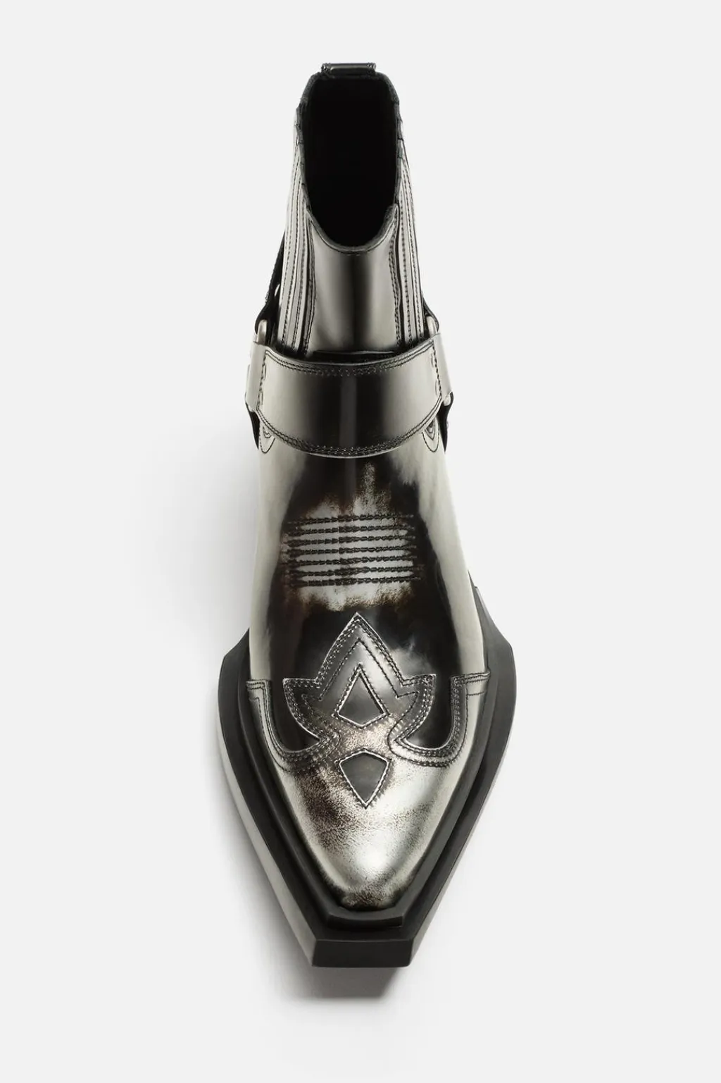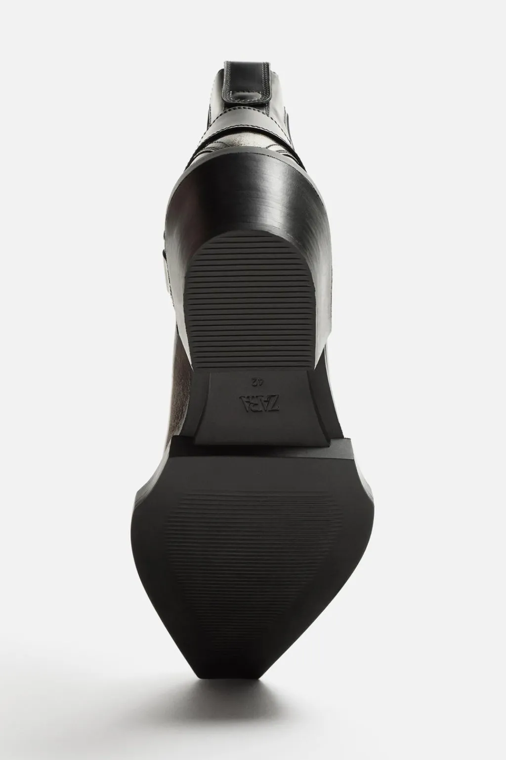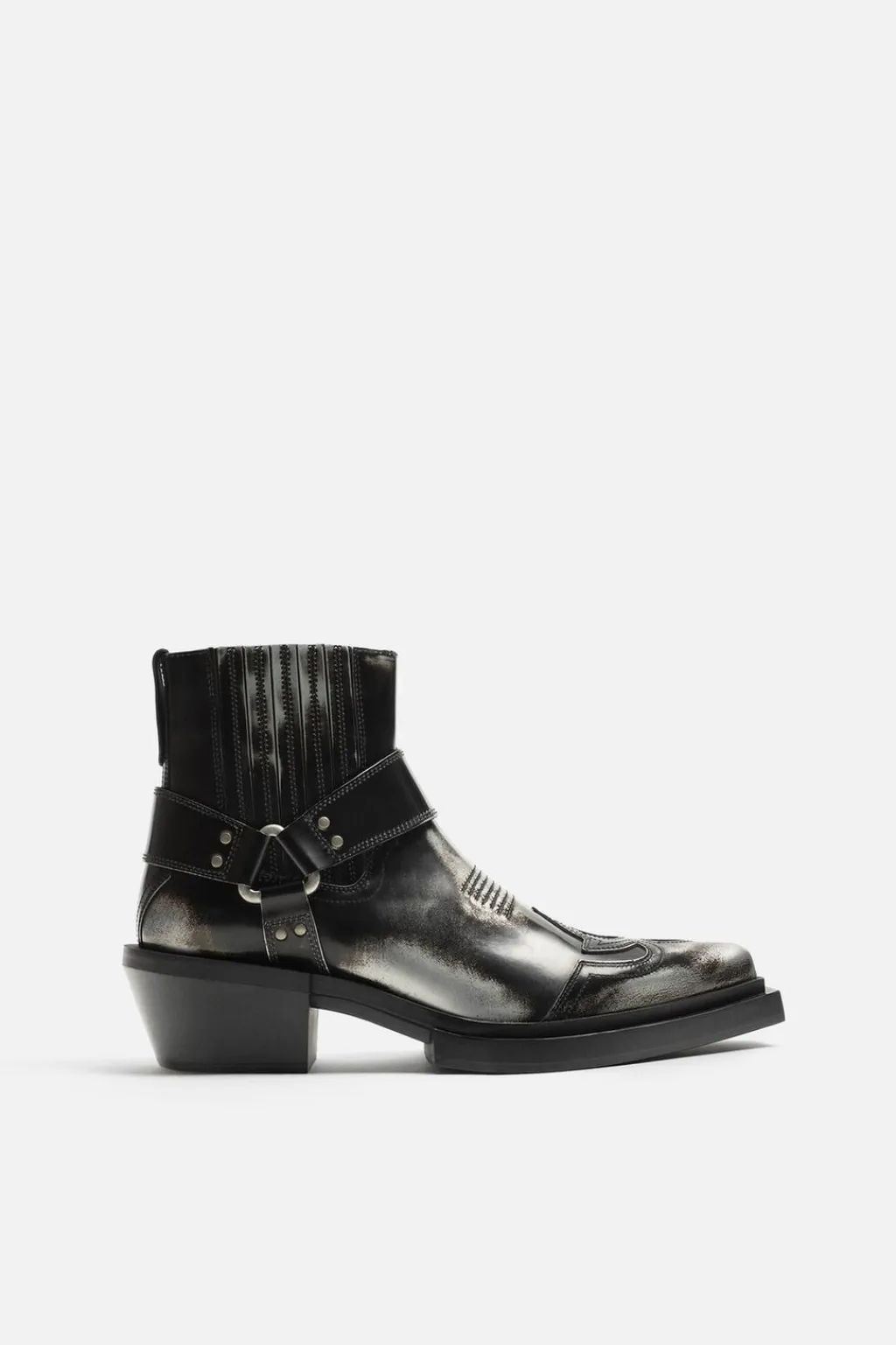 Bota tipo cowboy. Parte superior fabricada en piel. Combinación de patrones en el corte con efecto cepillado. Arnés decorativo a la altura del tobillo. Cuenta con dos piezas elásticas a ambos lados para facilitar el calce. Plantilla en piel. Horma en punta. Tacón ancho y suela con ligero volumen.