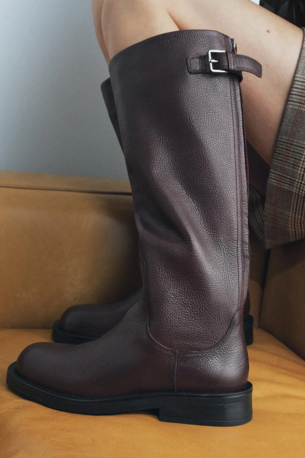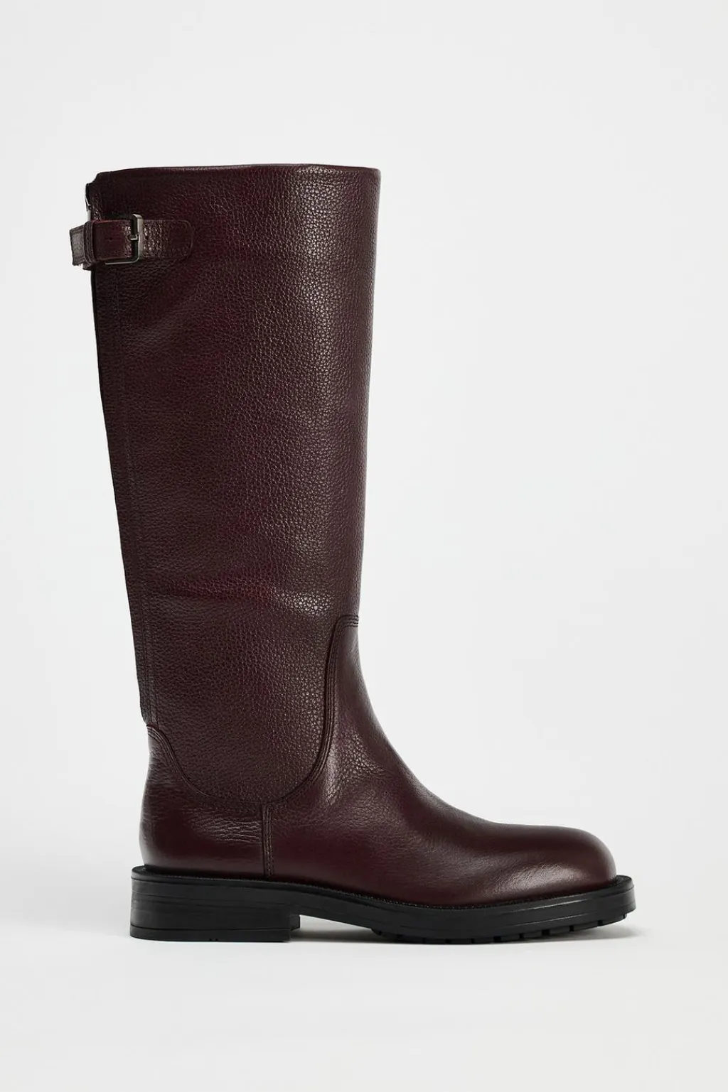 Zapato tipo bota en piel. Detalle de hebilla en la caña. Cierre mediante cremallera trasera. Acabada en punta redonda.