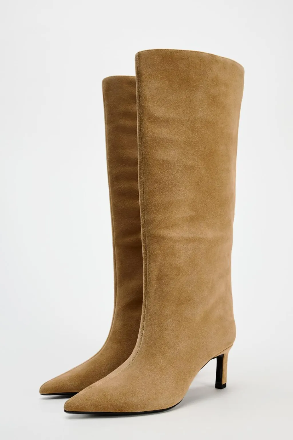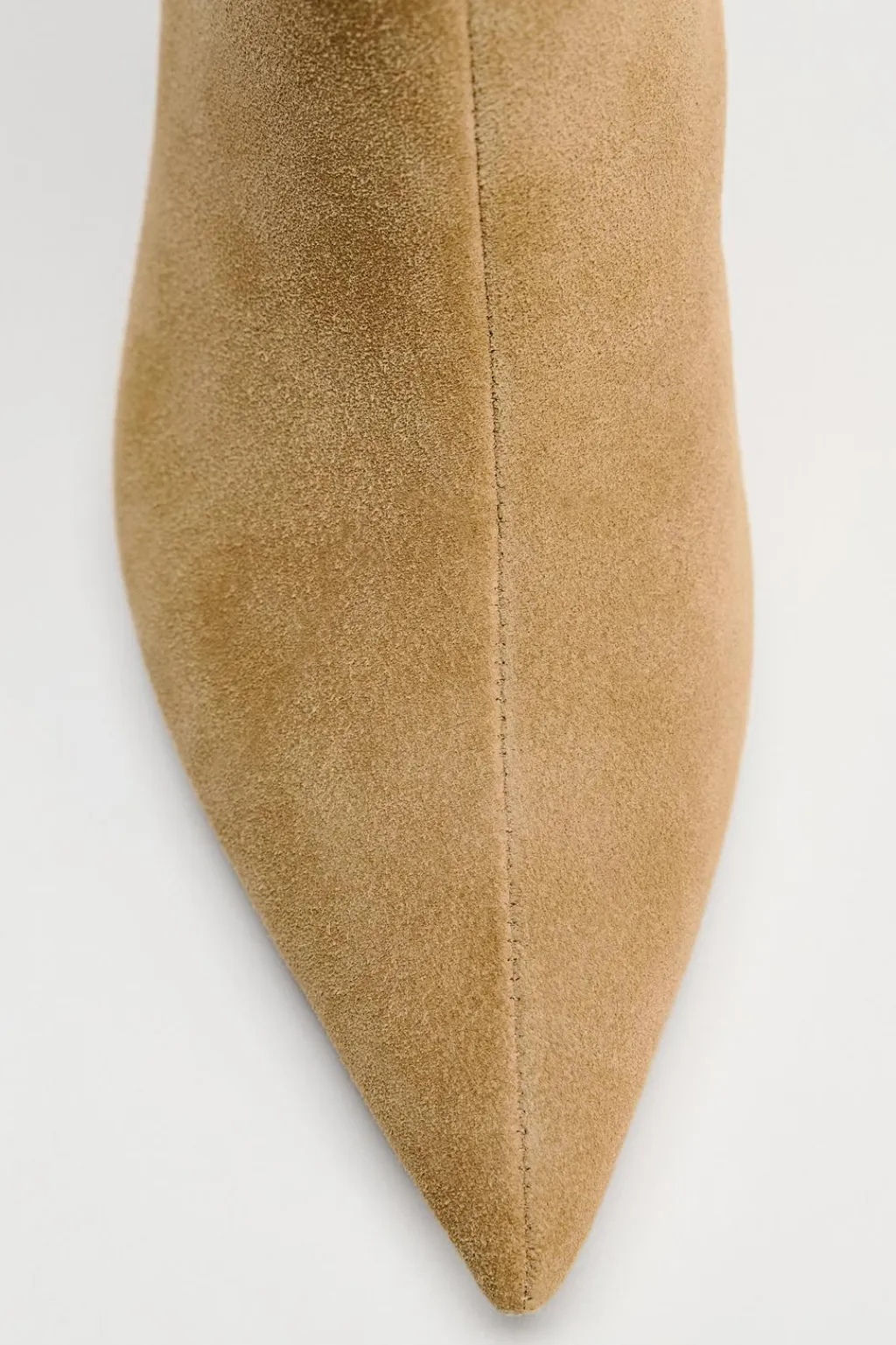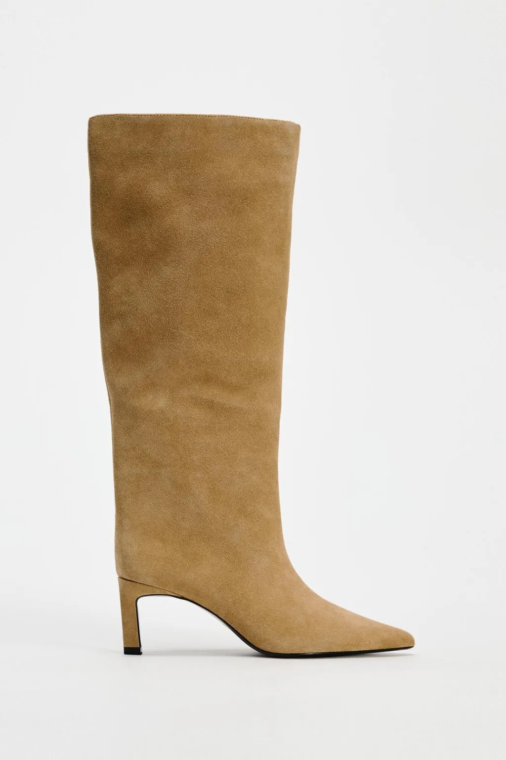 Zapato tipo bota con caña ancha en serraje. Tacón fino. Detalle de pespunte en la parte delantera. Acabado en punta.