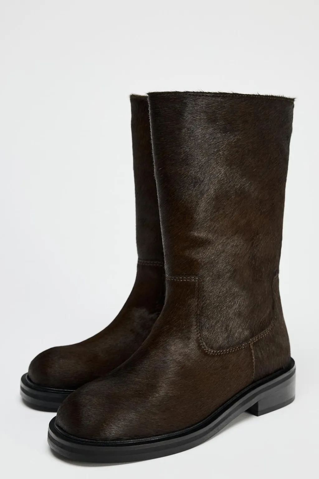 Zapato tipo botín en piel con pelo. Caña ancha. Detalle de pespunte en el cuerpo. Acabado en punta redonda.
