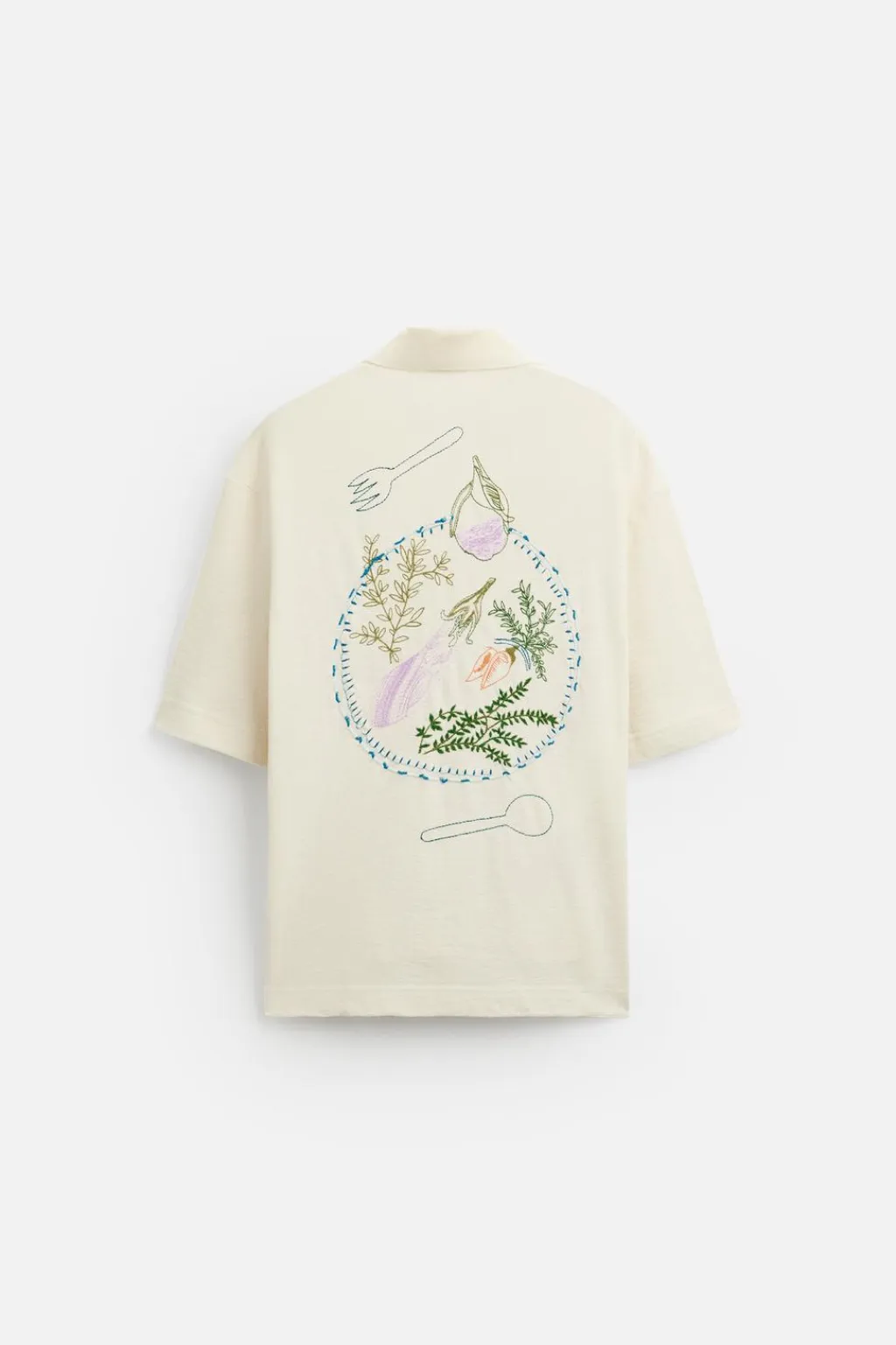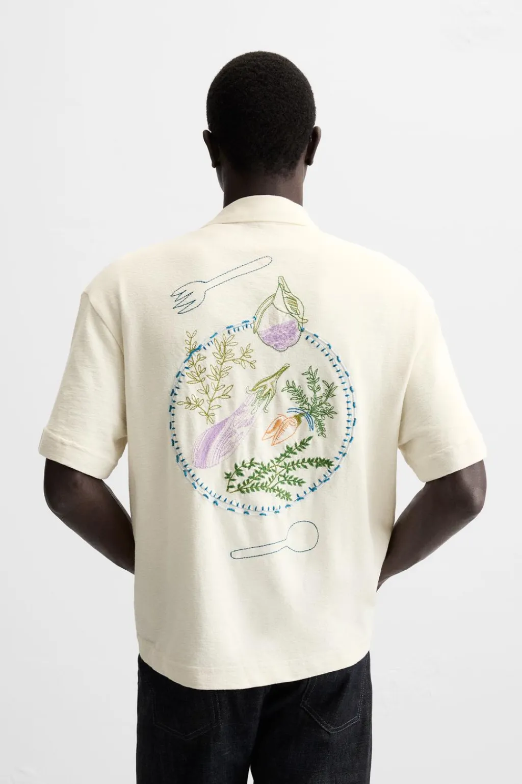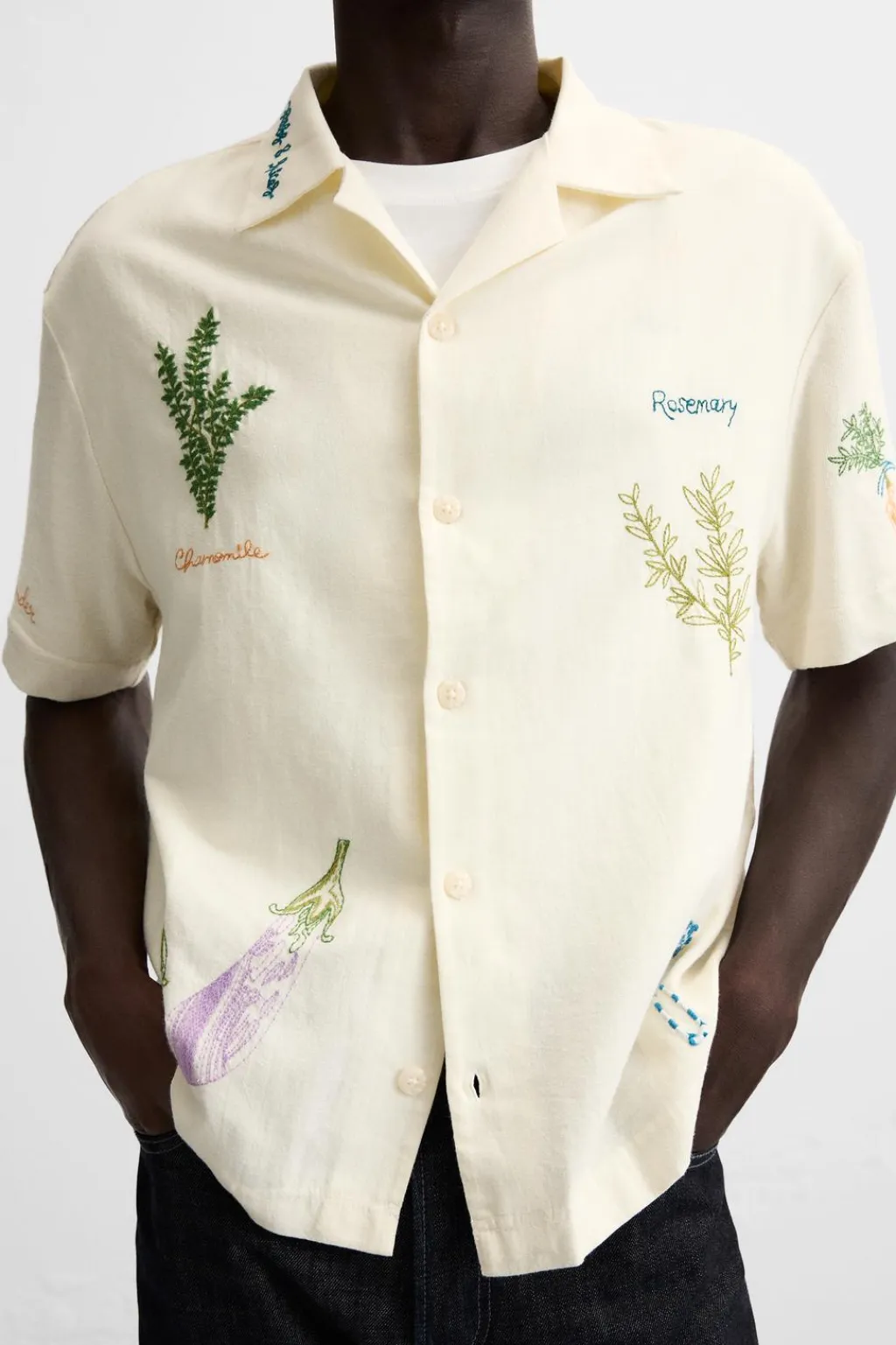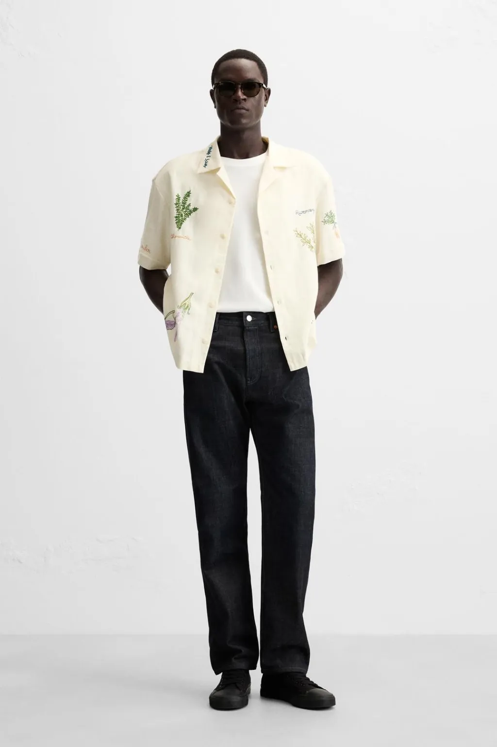 Camisa relaxed fit. Cuello bowling y manga corta. Bordados combinados a contraste en toda la prenda. Cierre frontal de botonadura.