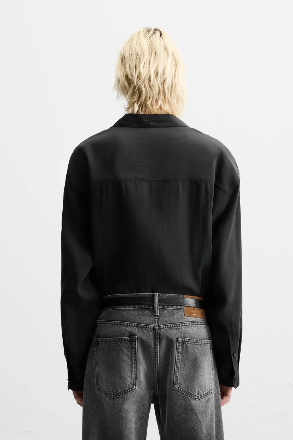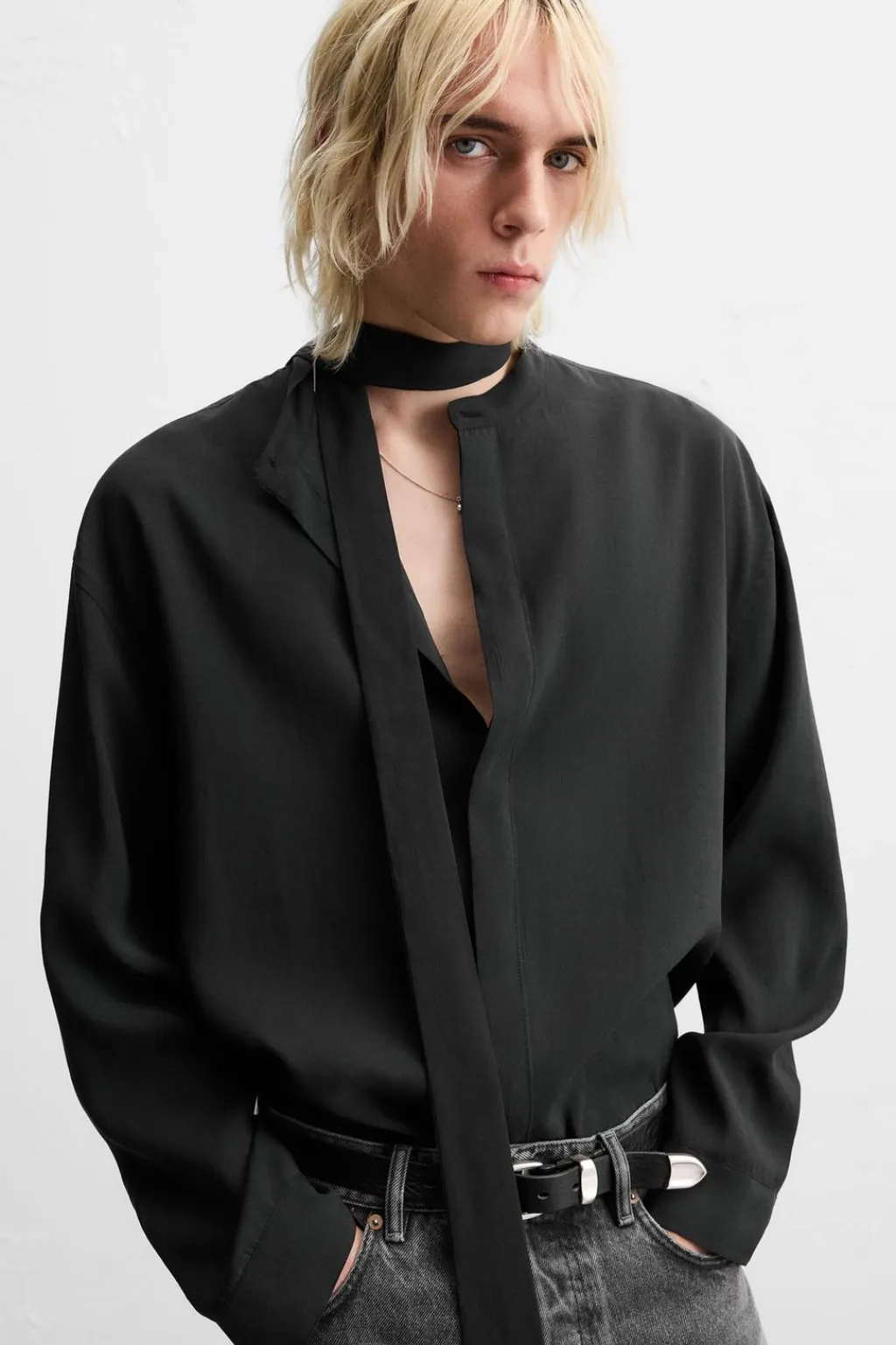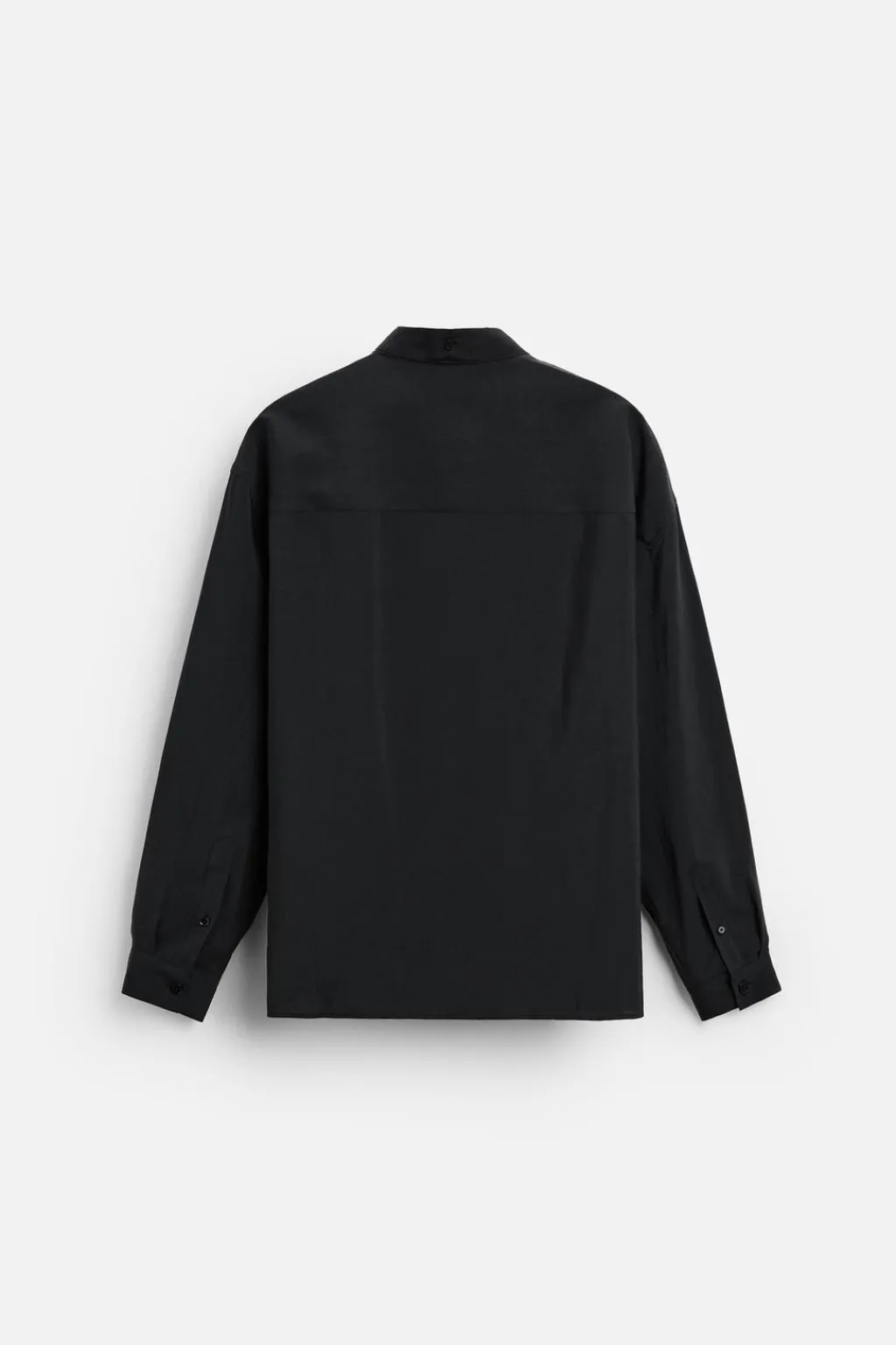Camisa relaxed fit confeccionada en tejido con modal. Cuello redondo con detalle de lazo en el mismo tejido. Manga larga acabada en puño con botones. Cierre frontal de botonadura oculta por solapa.