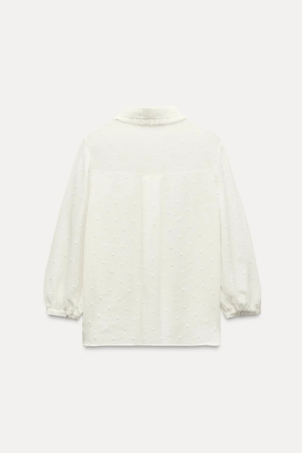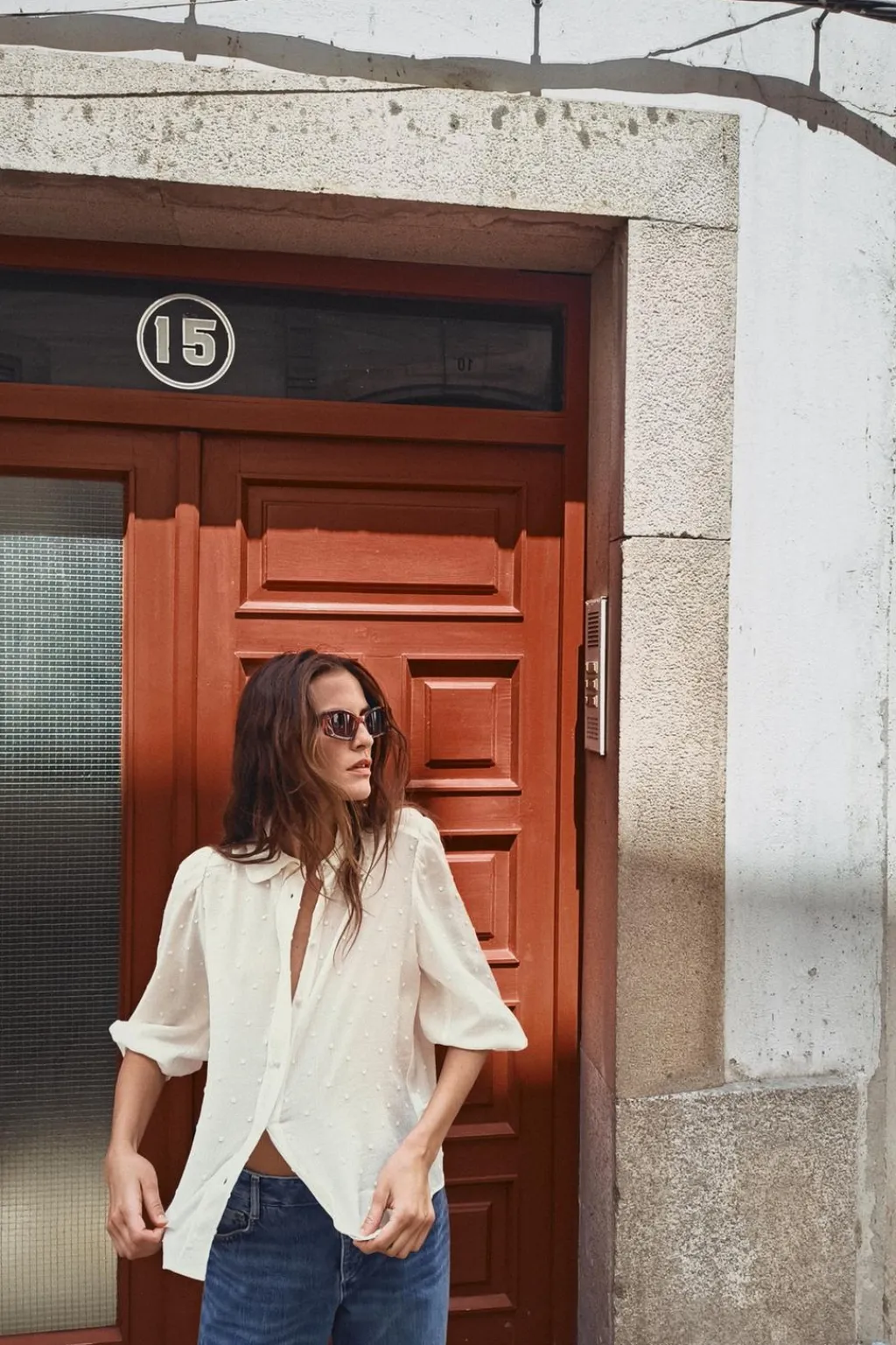 Camisa de cuello bobo y manga por debajo del codo. Cierre frontal con botones forrados a tono.