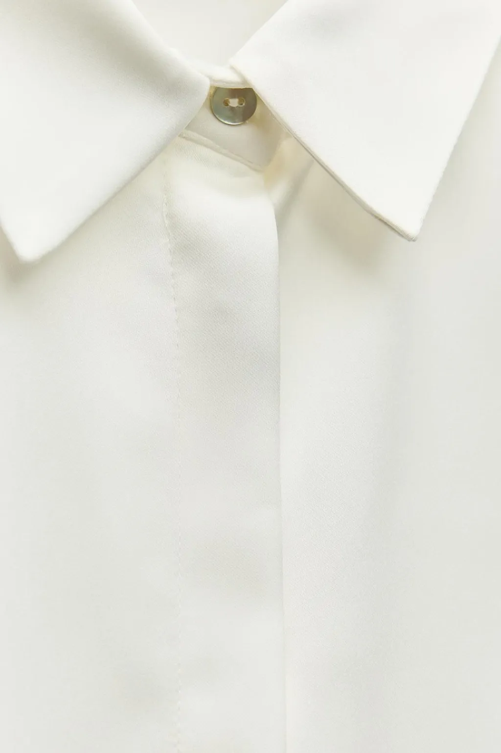 Camisa confeccionada en tejido satinado. Cuello solapa y manga ancha. Detalle de pinza en espalda. Cierre frontal con botones ocultos por sopata.