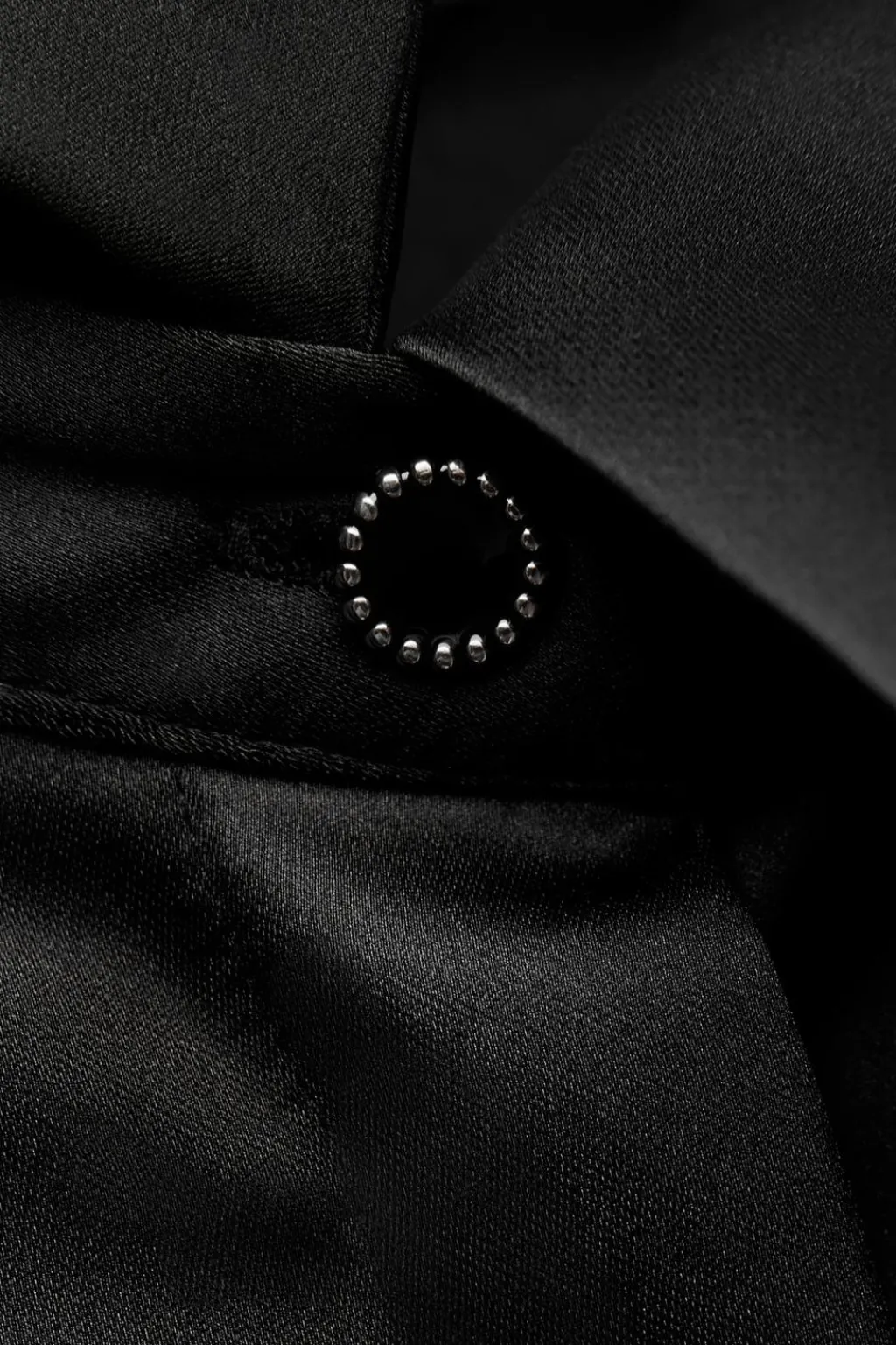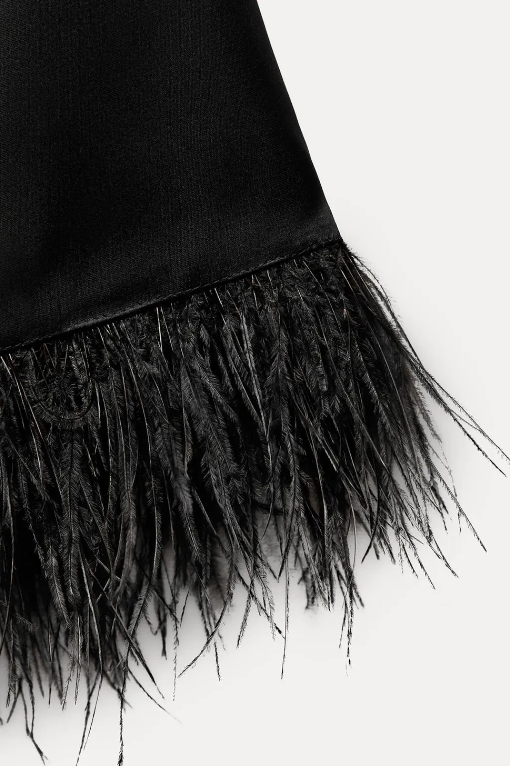 Camisa de cuello solapa y manga larga acabada con plumas. Cierre frontal con botones.