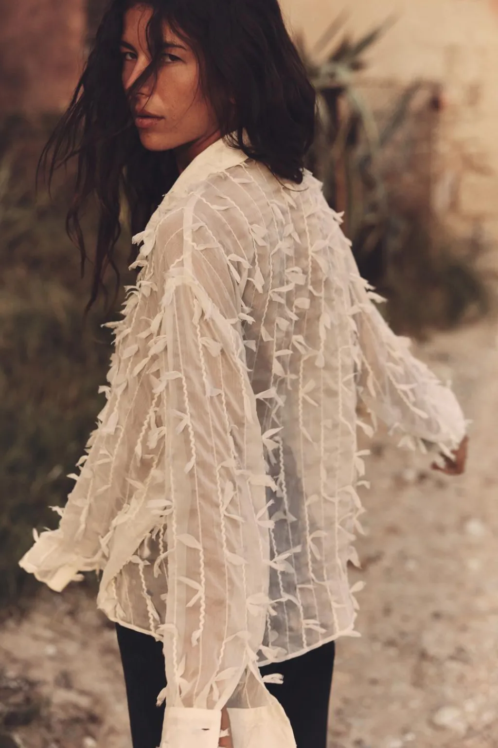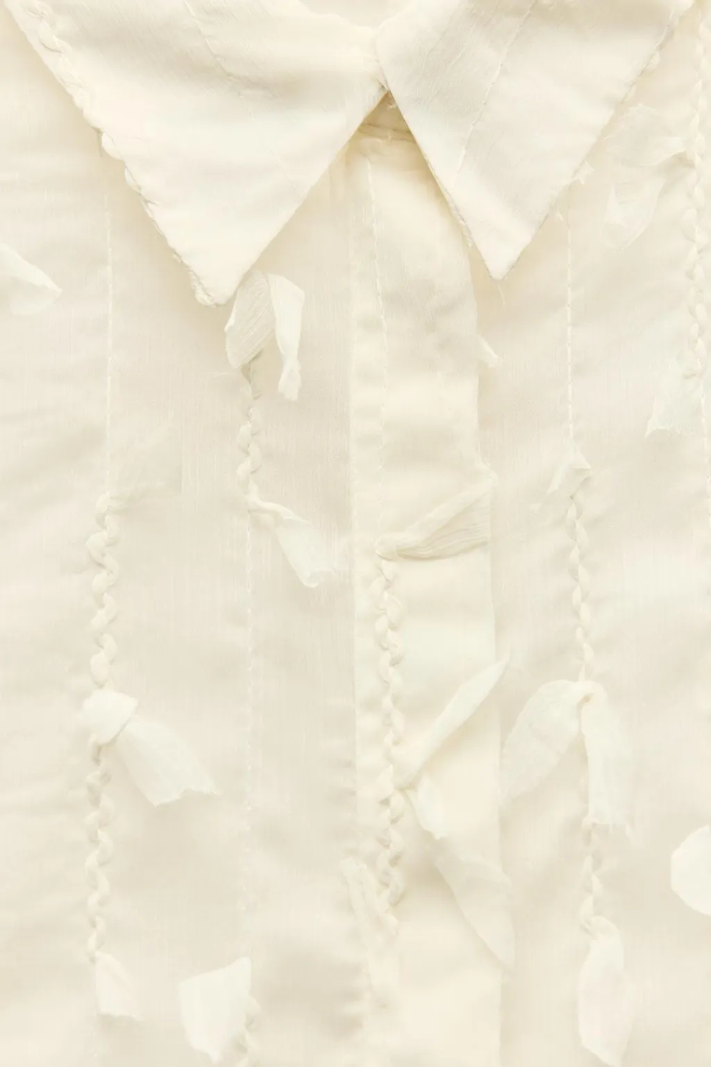 Camisa semitransparente de cuello solapa y manga larga acabada en puño. Detalle de flecos en mismo tejido. Cierre frontal con botones.