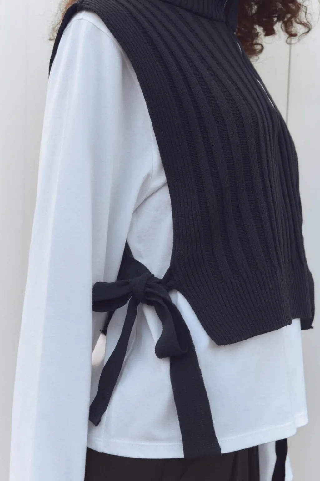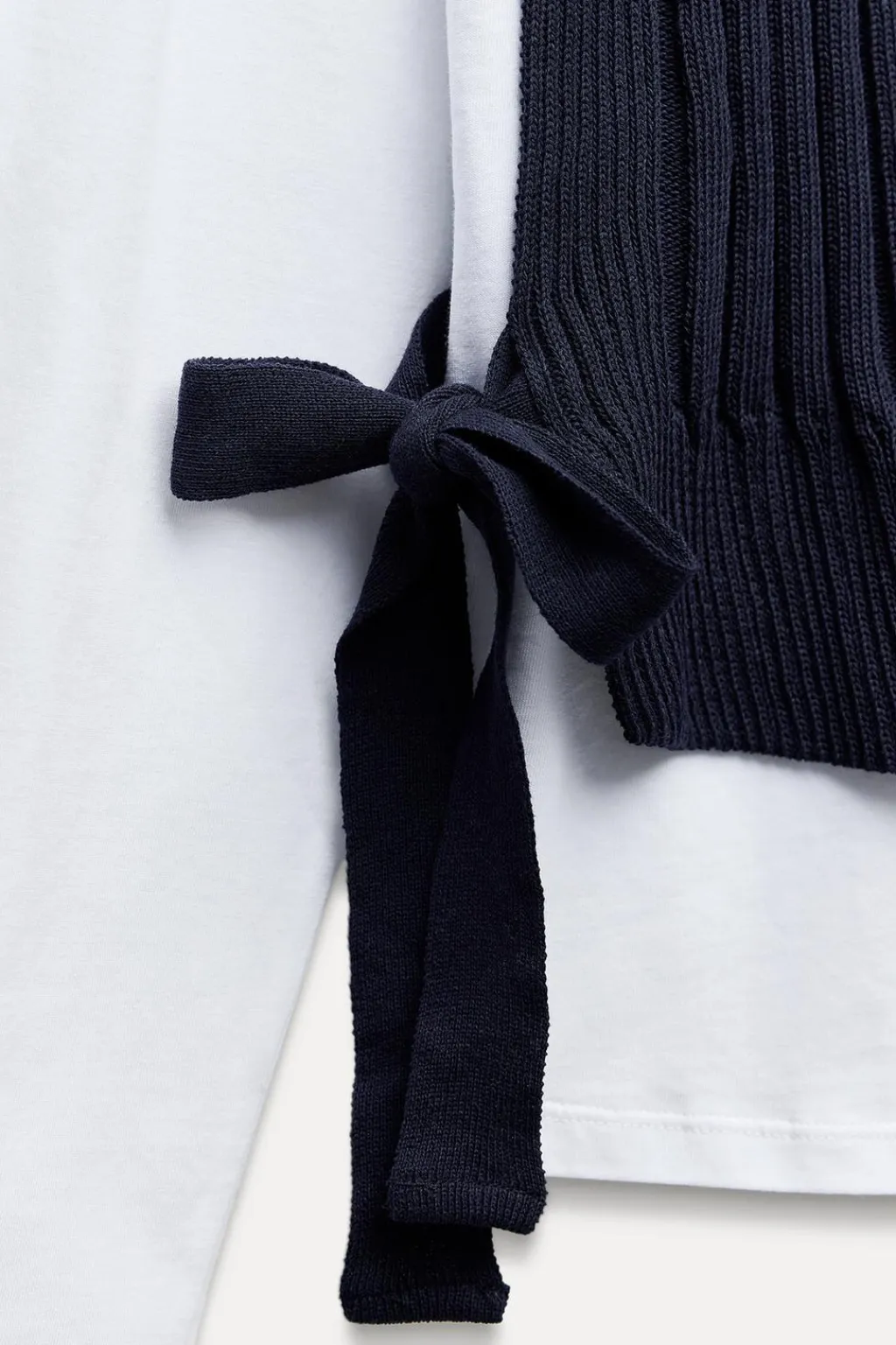 Camiseta de cuello redondo y manga larga. Detalle de chaleco en superposición combinado de cuello alto con cremallera y lazadas laterales.