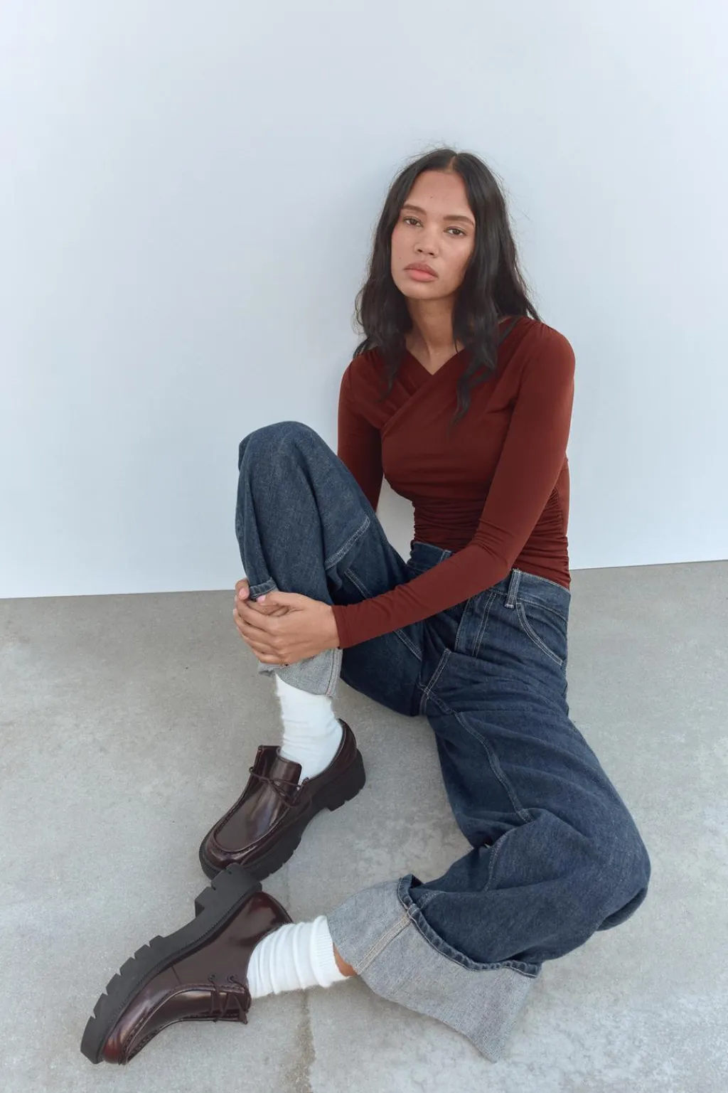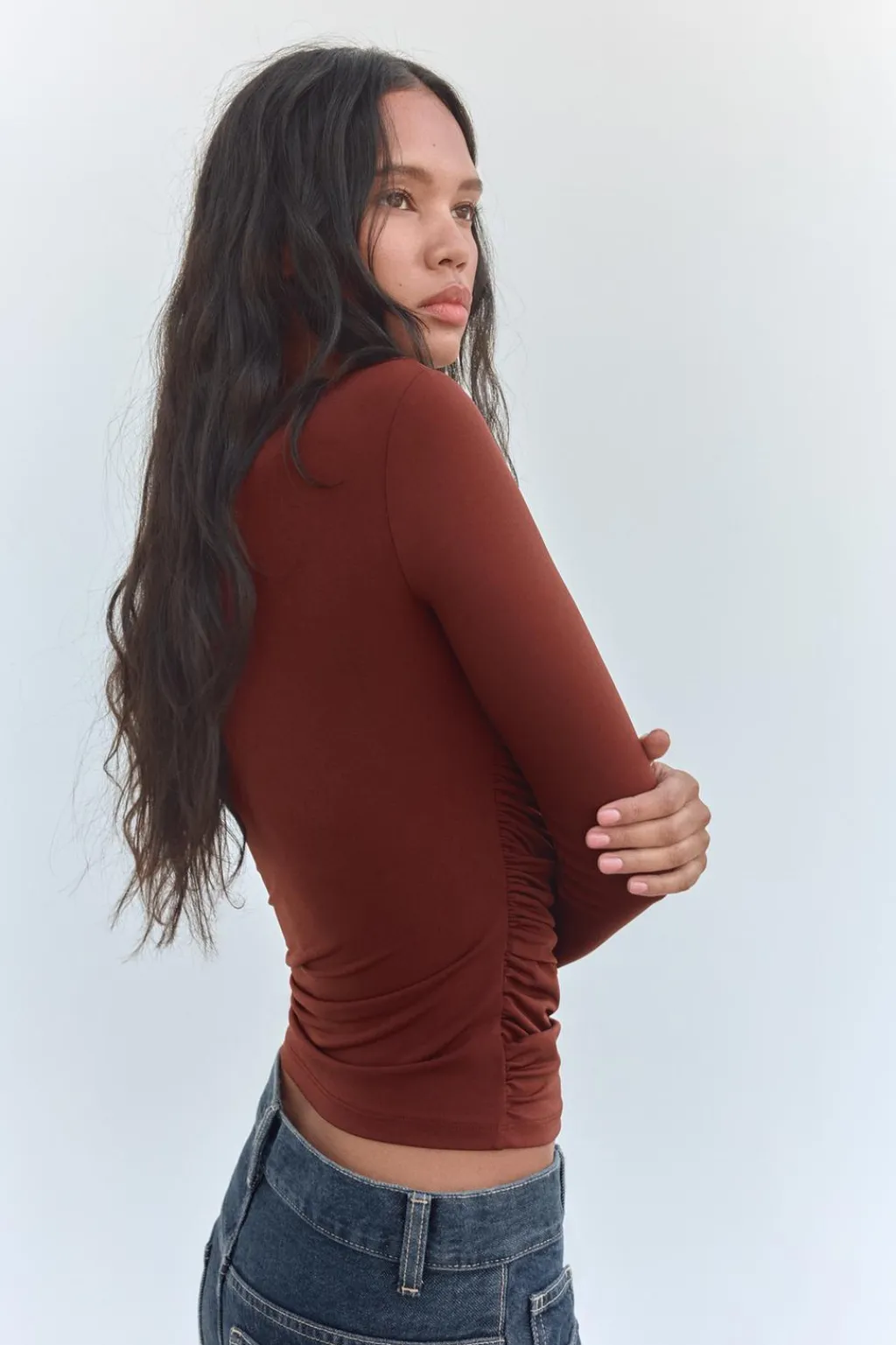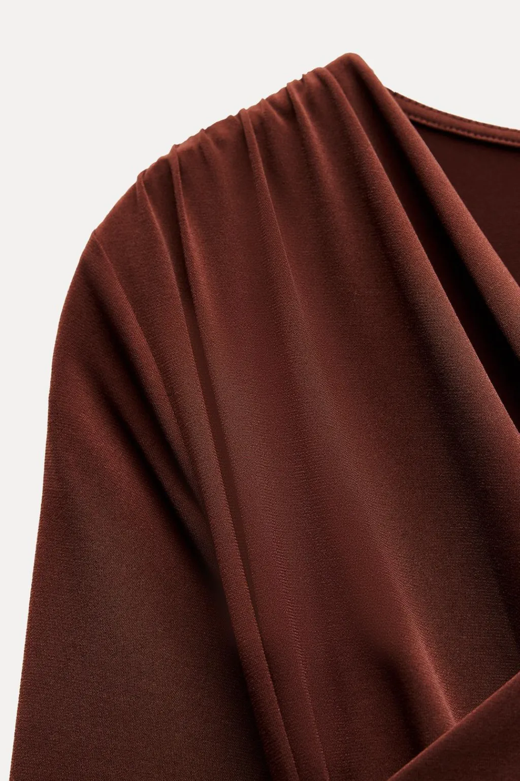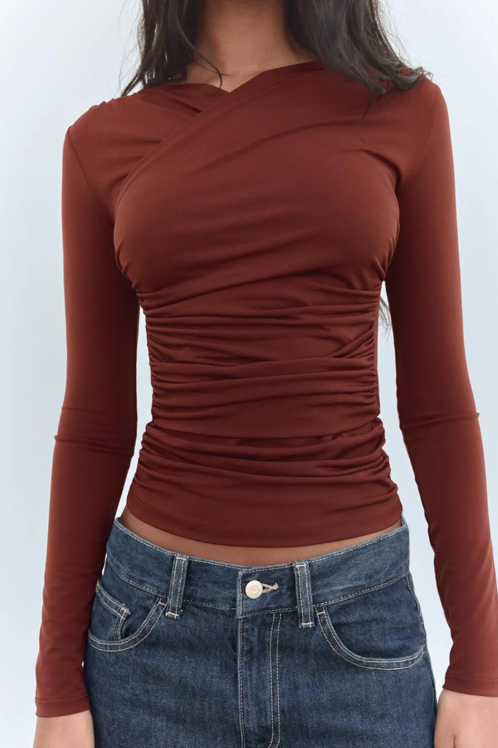 Camiseta de escote pico cruzado y manga larga. Detalle de tejido drapeado. Bajo asimétrico.