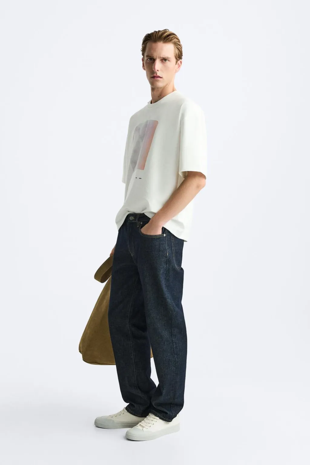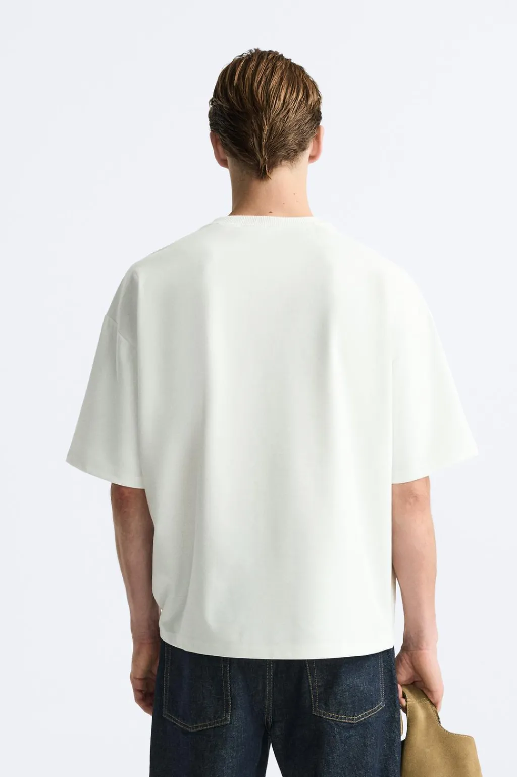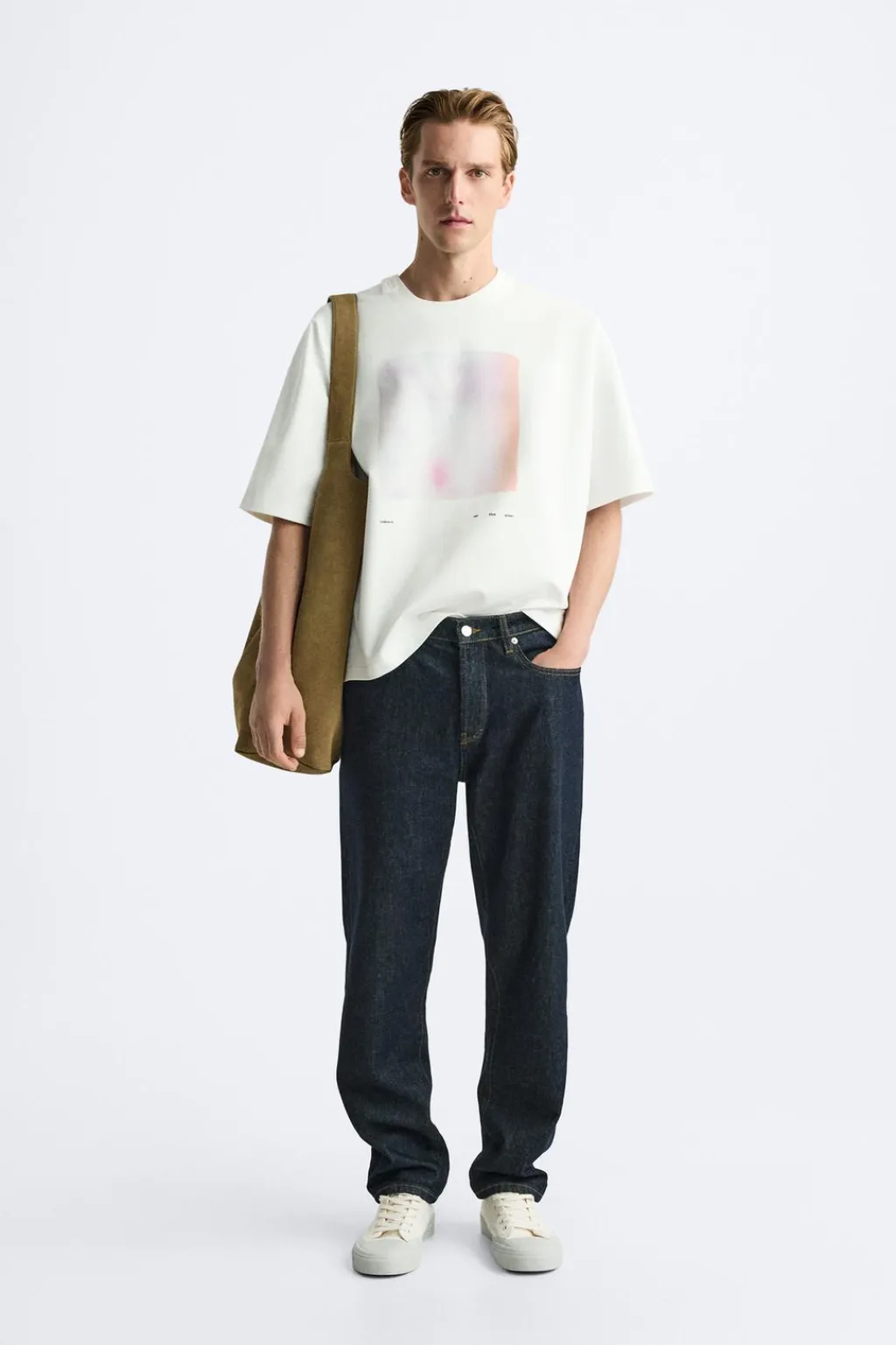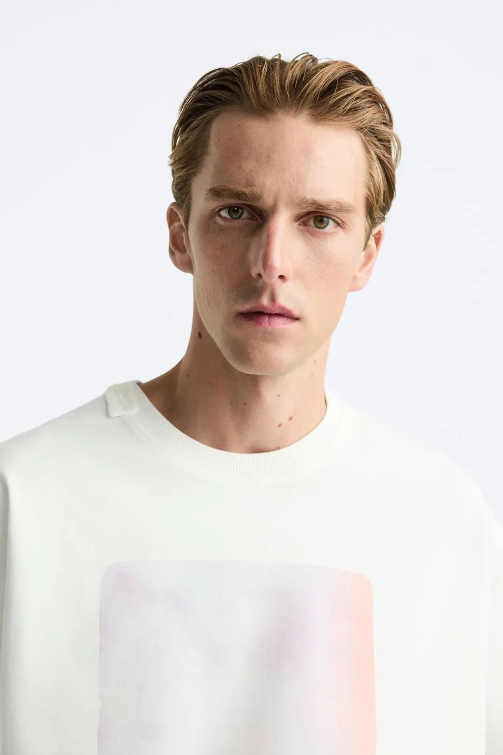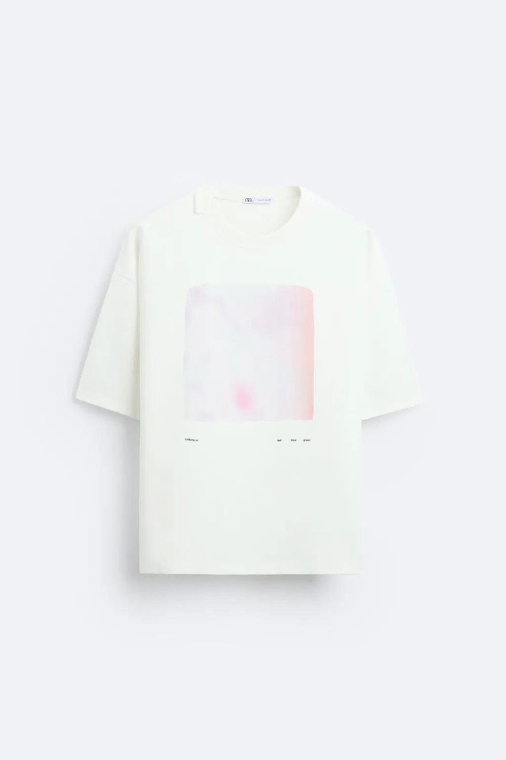Camiseta relaxed fit. Cuello redondo con acabado asimétrico y manga corta. Estampación combinada a contraste en delantero.