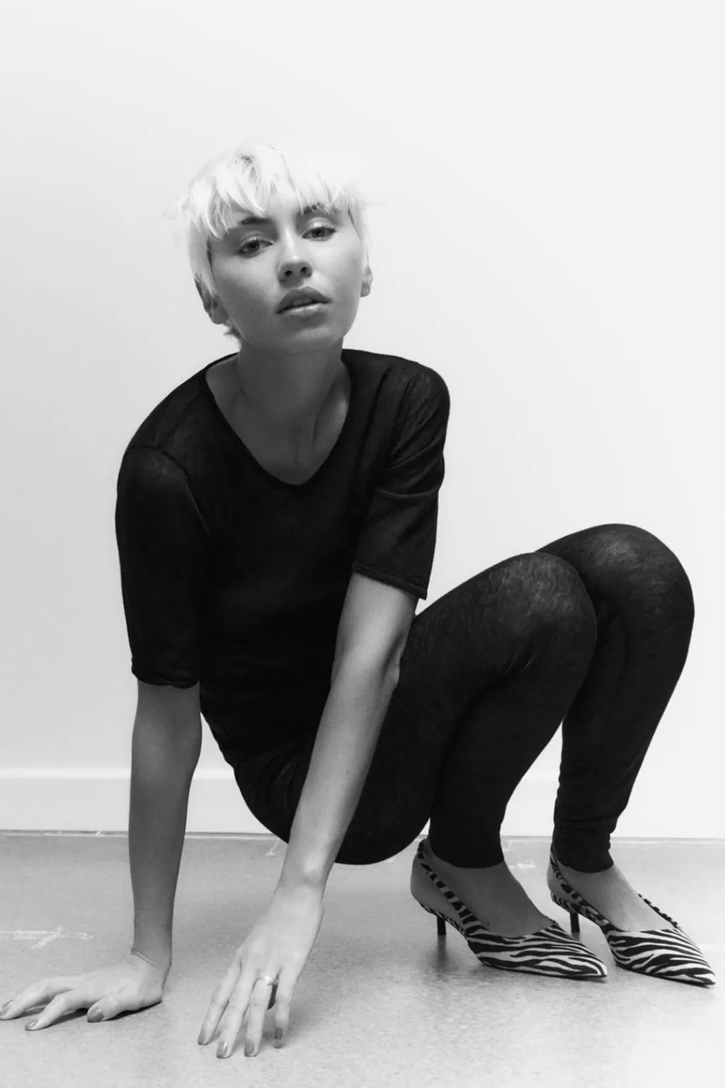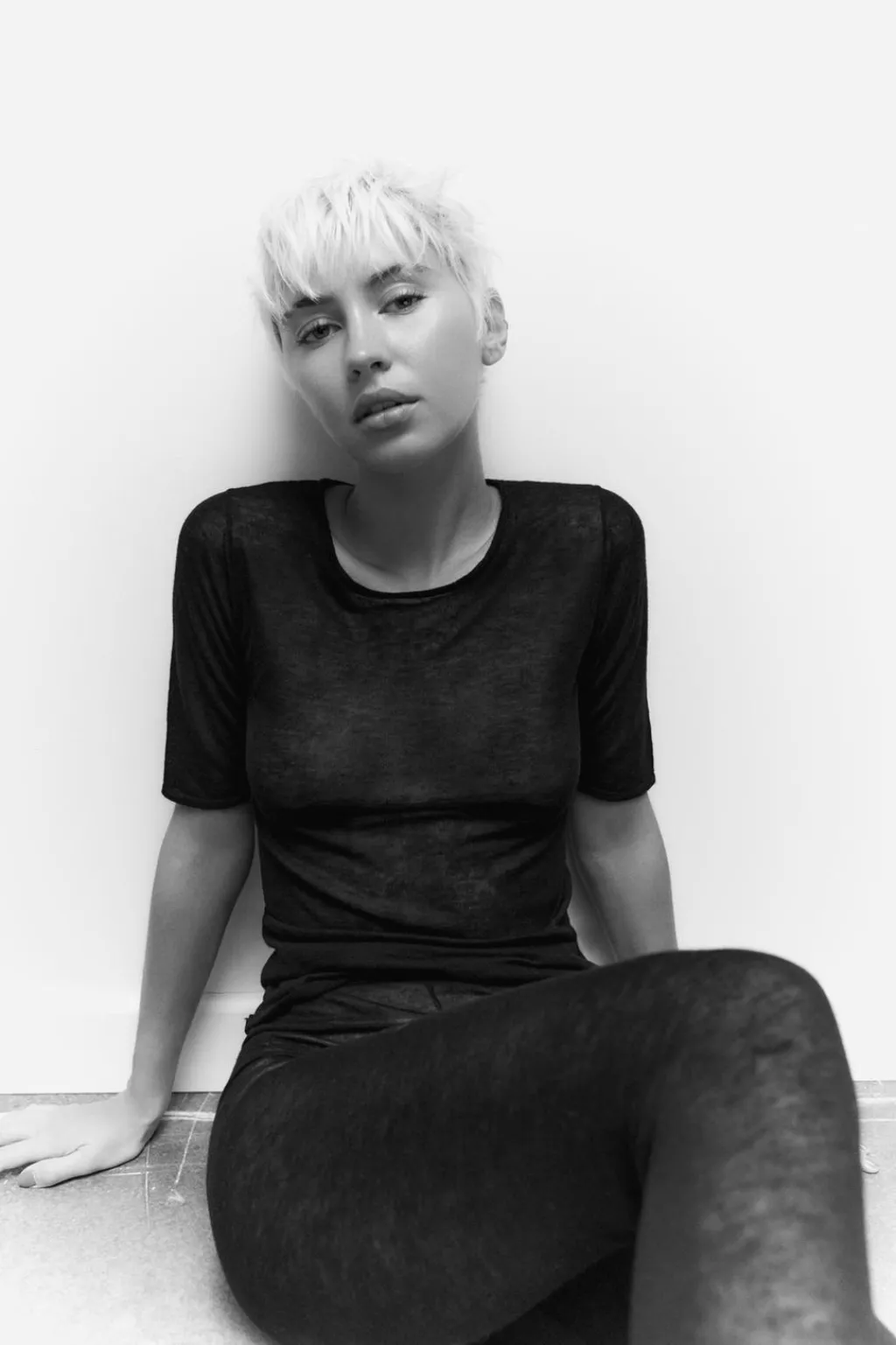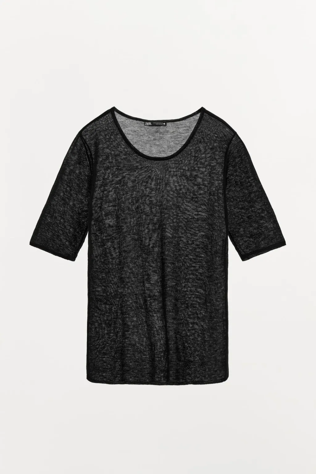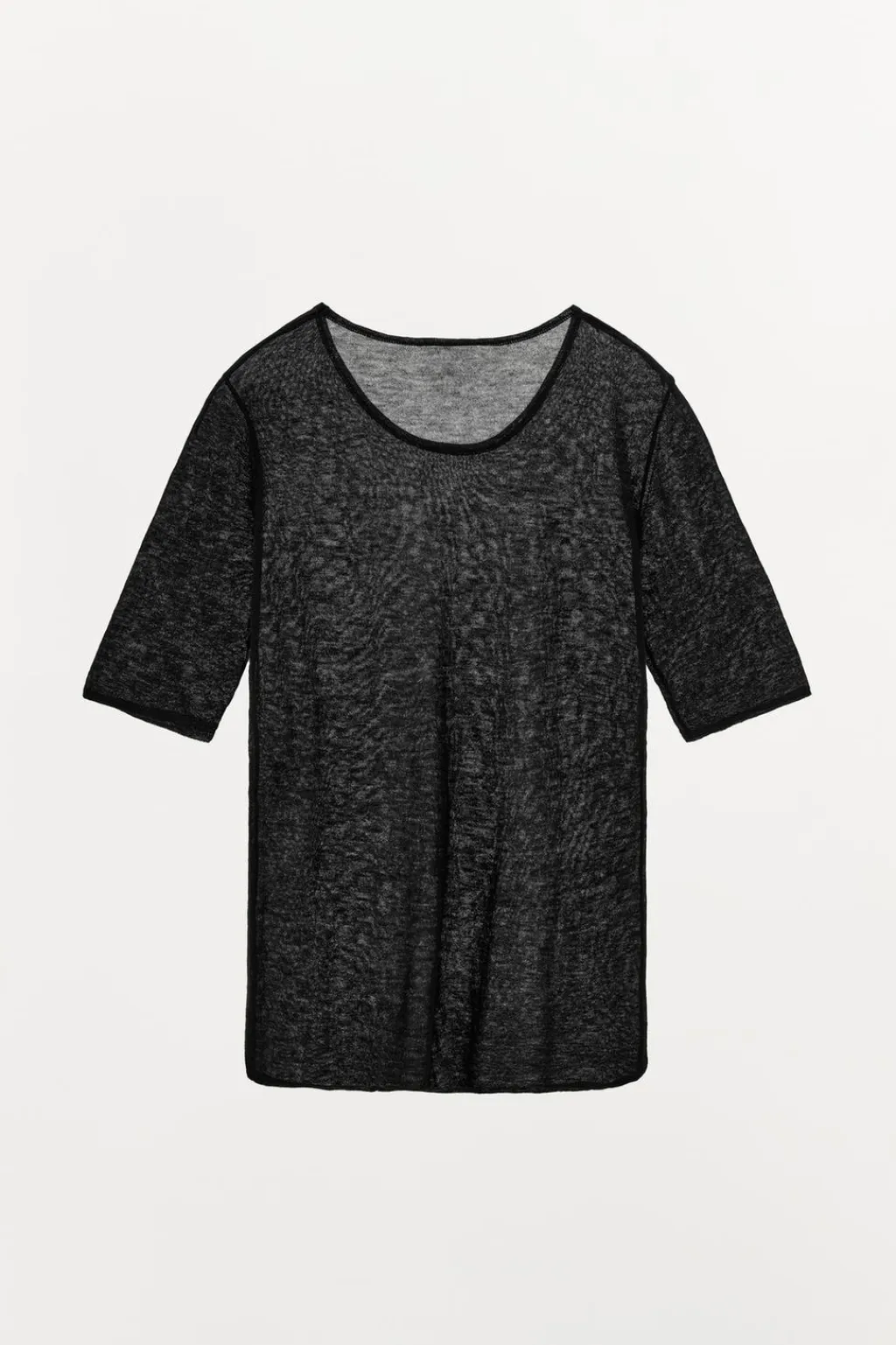 Camiseta semitransparente confeccionada en hilatura de lana 100%. Cuello redondo y manga corta.