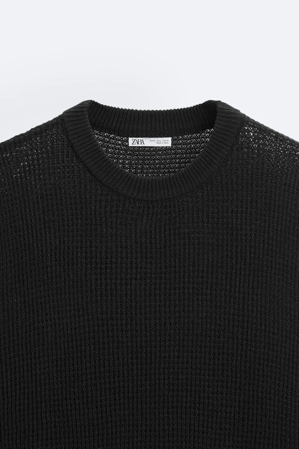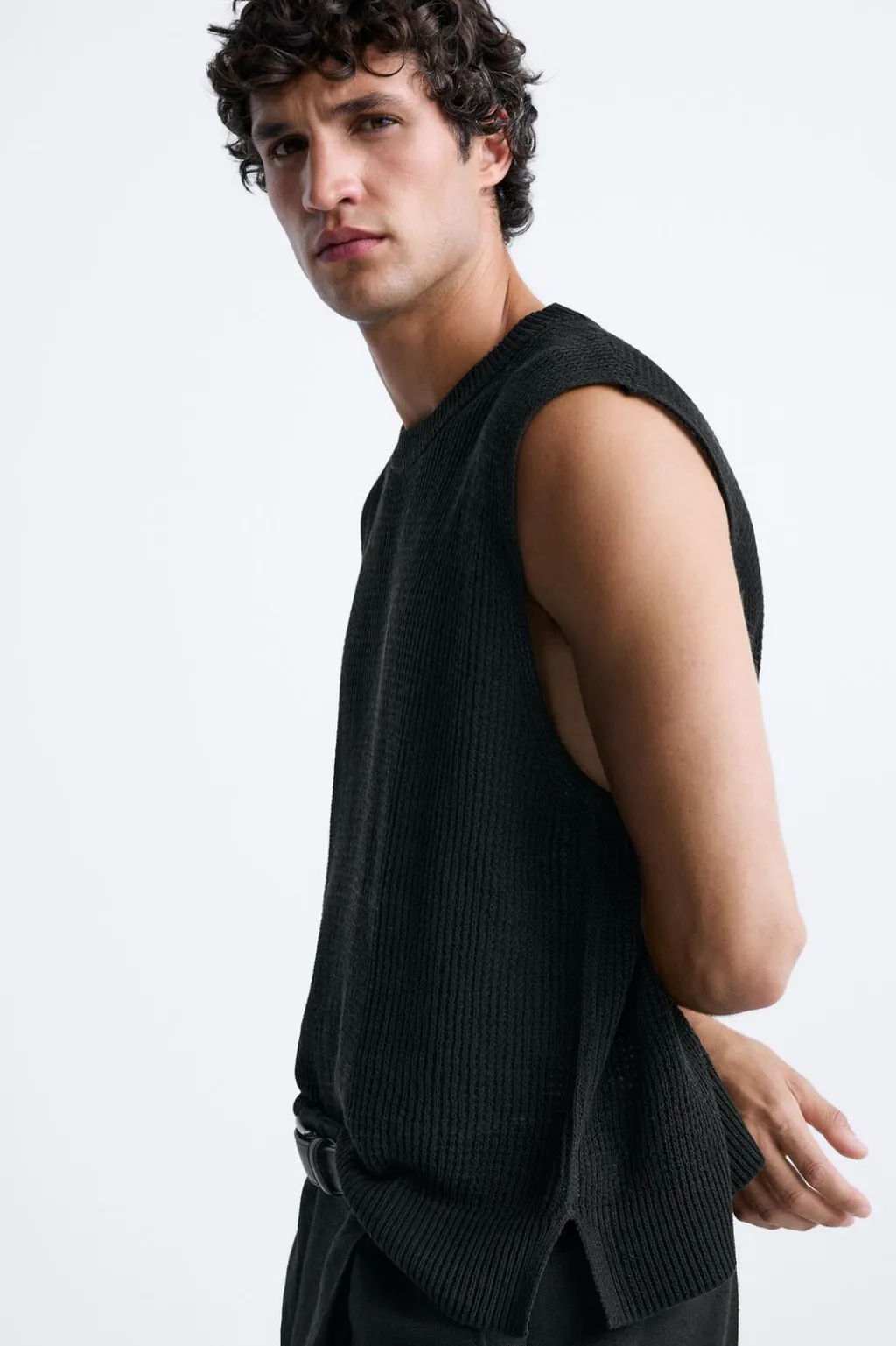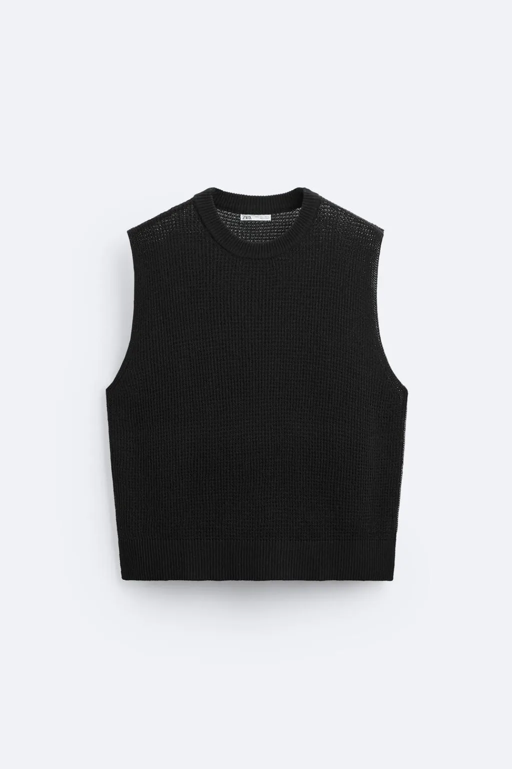 Camiseta de punto tejido con estructura abierta. Cuello redondo y manga sisa. Acabados en rib.
