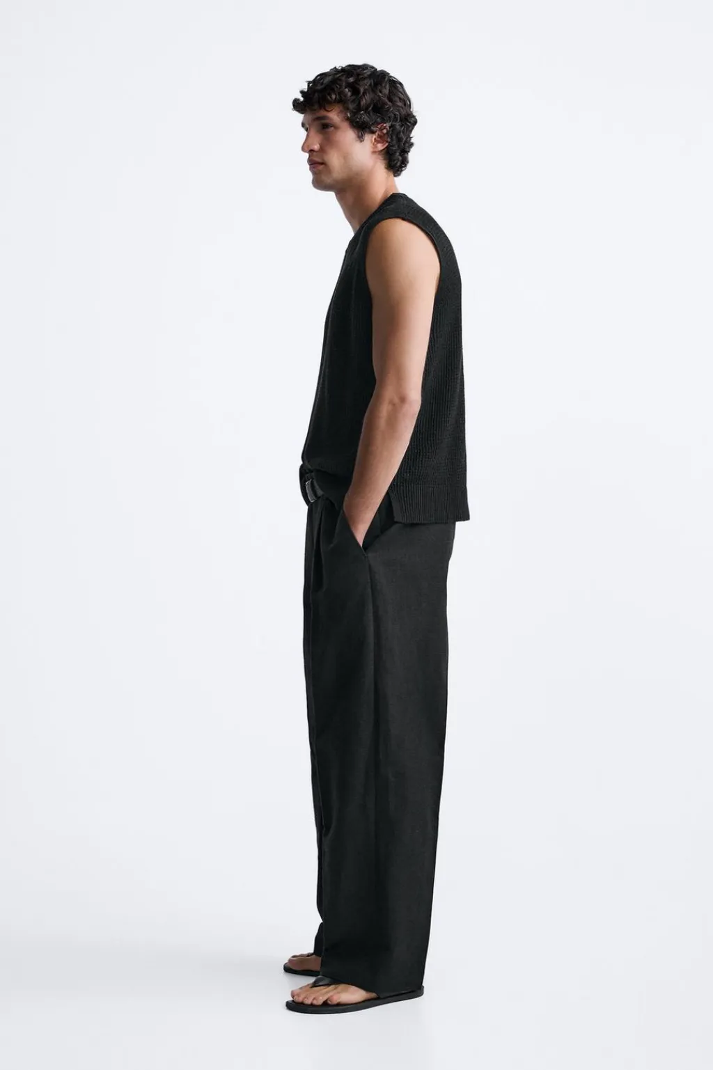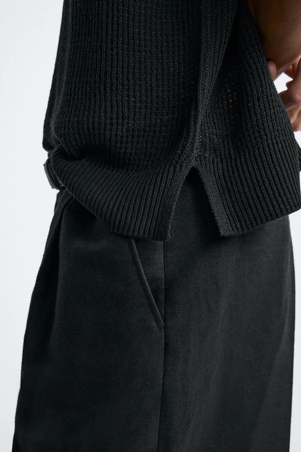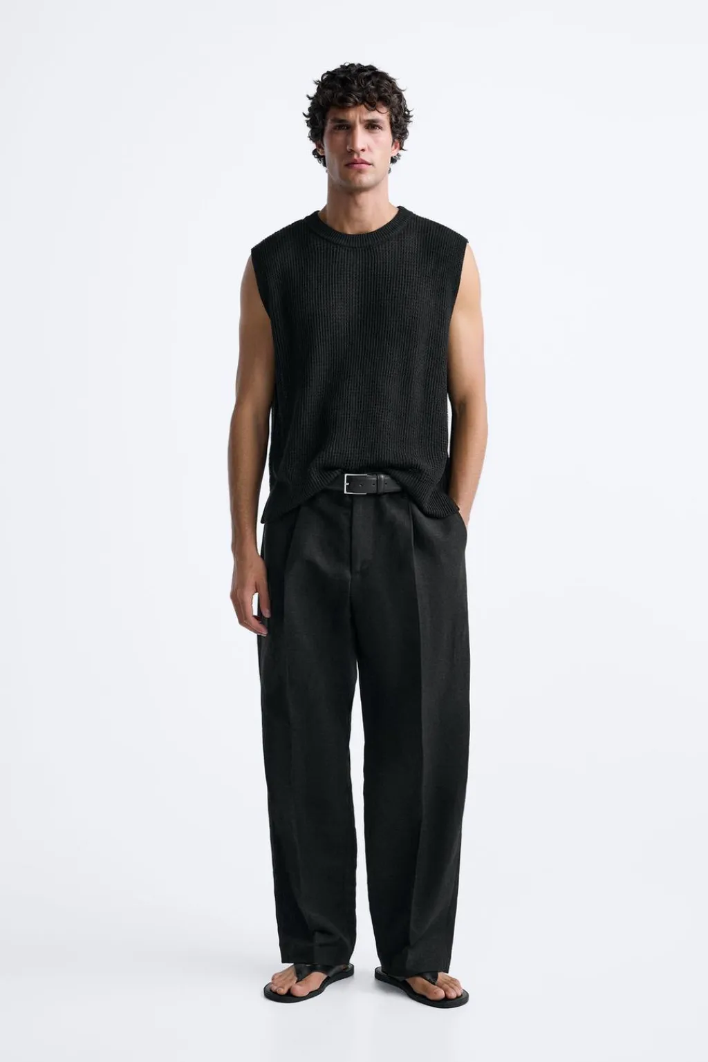 Camiseta de punto tejido con estructura abierta. Cuello redondo y manga sisa. Acabados en rib.